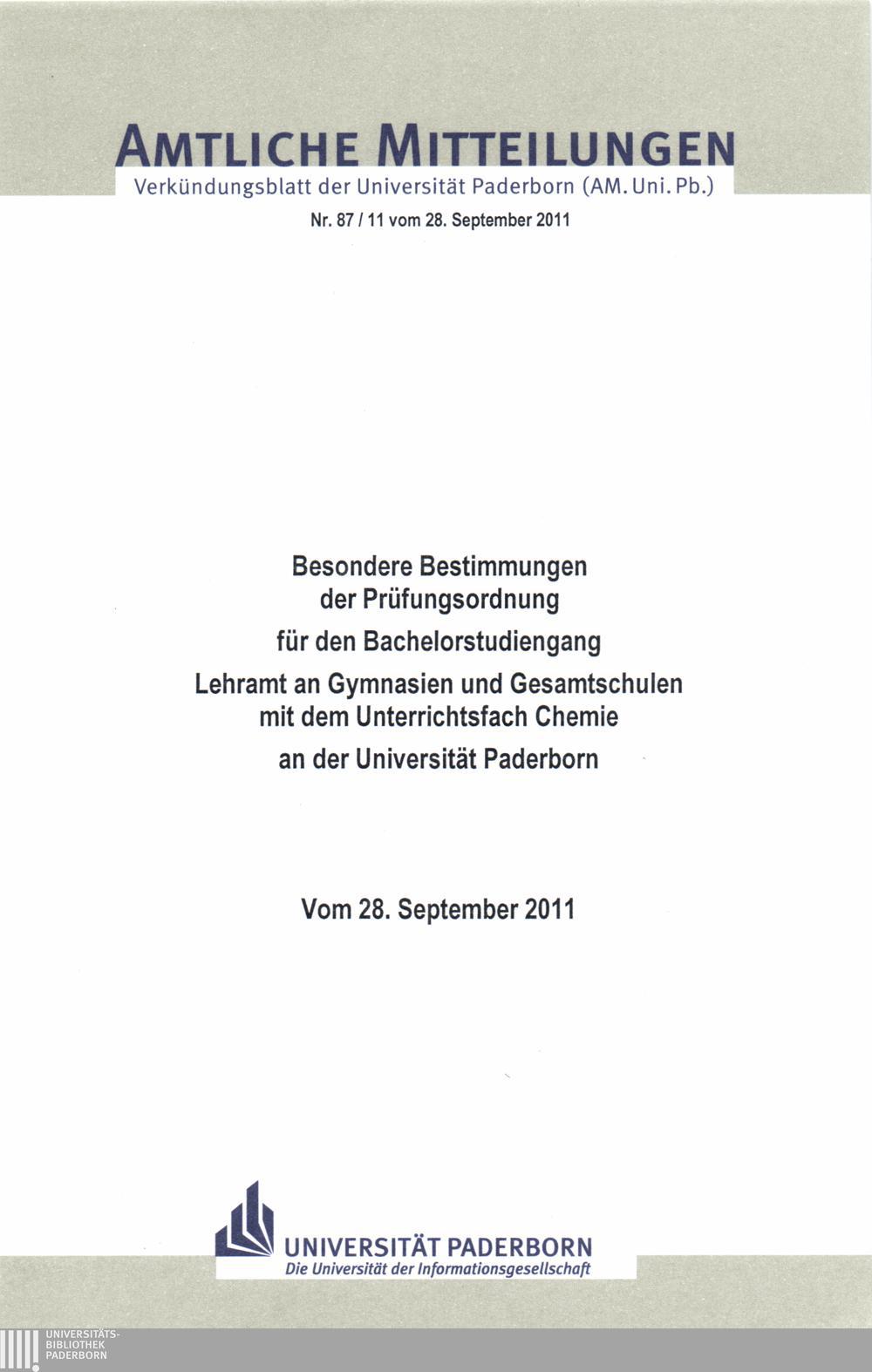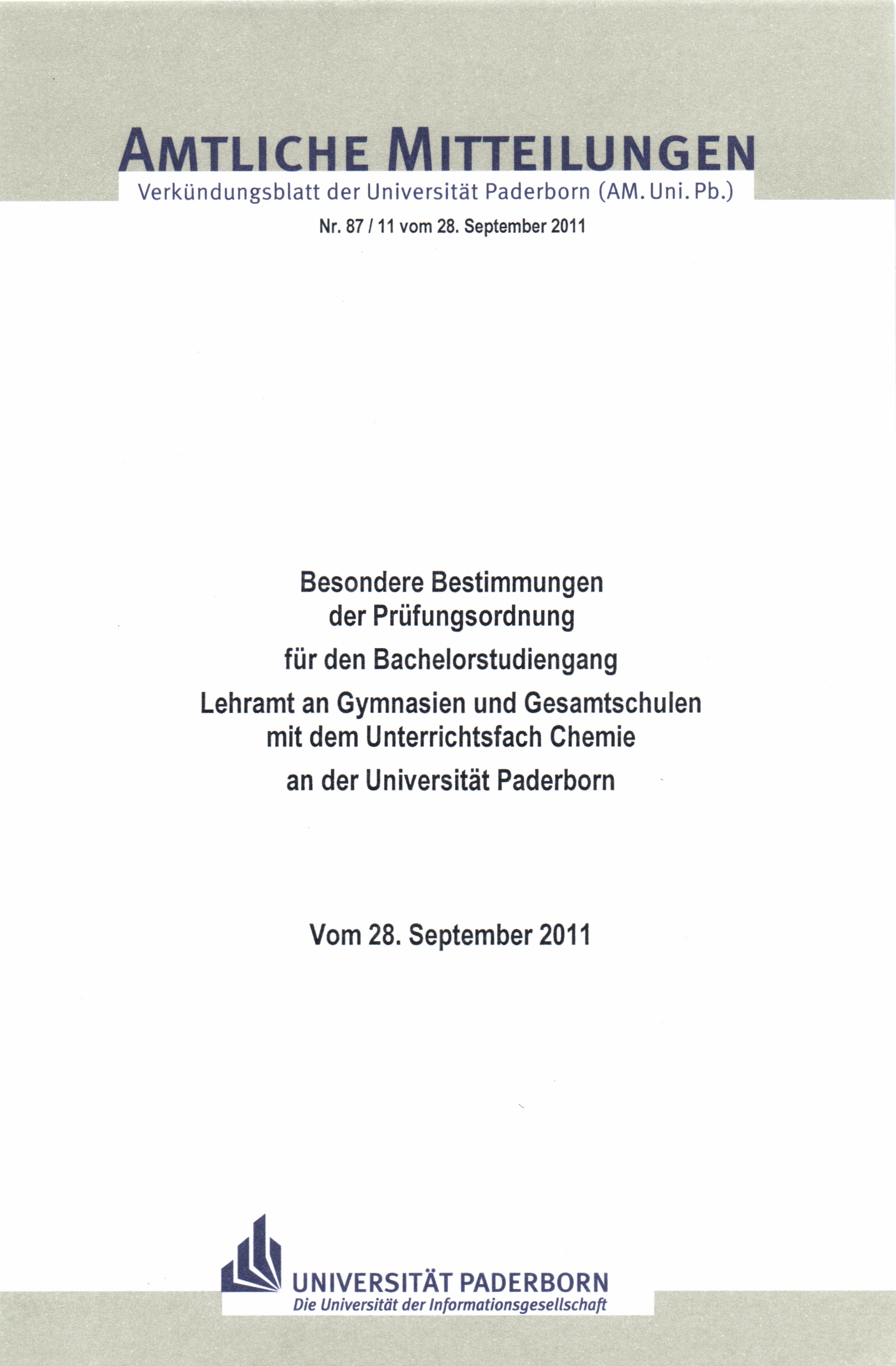Besondere Bestimmungen der Prüfungsordnung für den Bachelorstudiengang Lehramt an Gymnasien und Gesamtschulen mit dem Unterrichtsfach Chemie an der Universität Paderborn : vom 28. September 2011