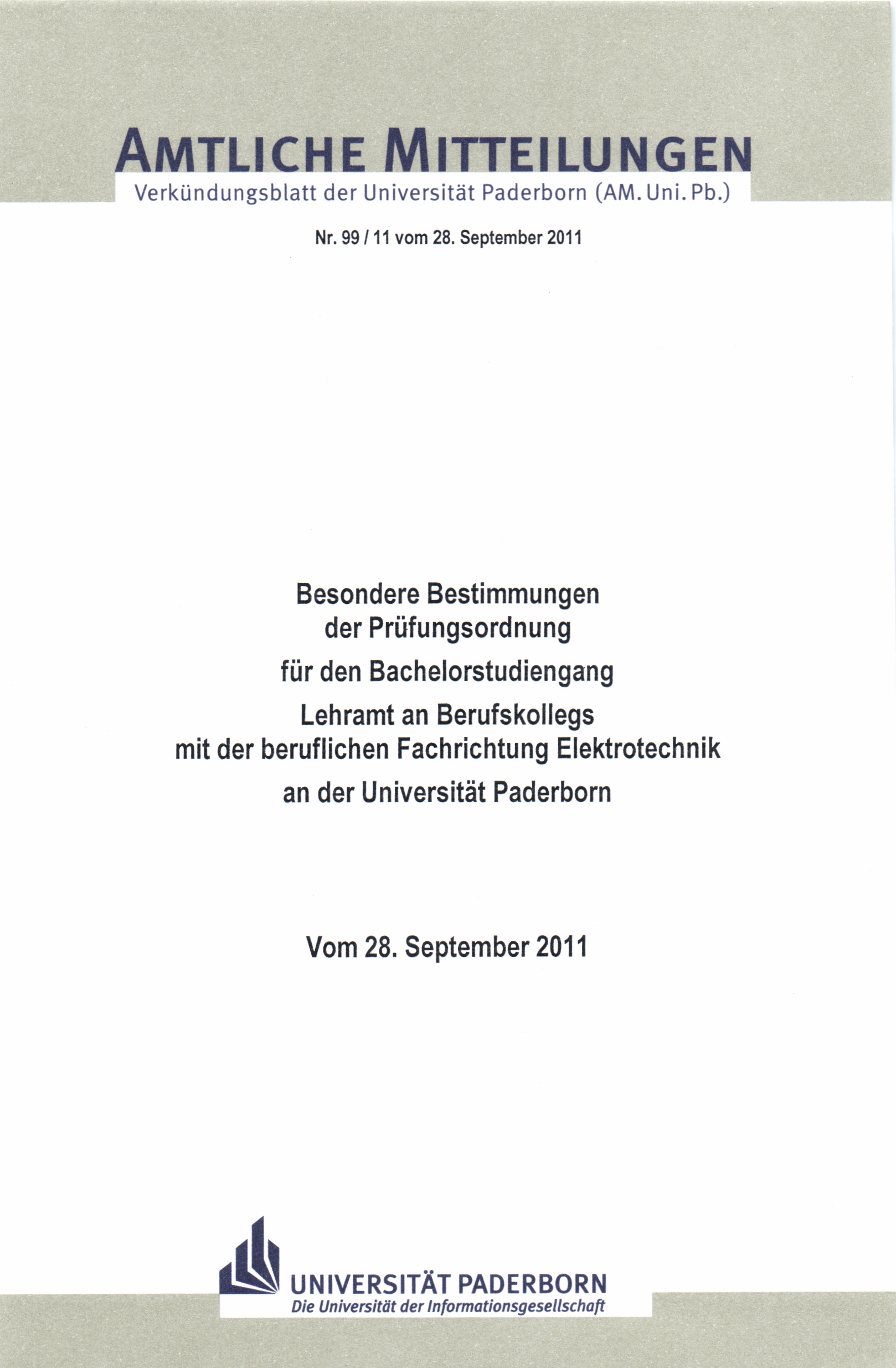 Besondere Bestimmungen der Prüfungsordnung für den Bachelorstudiengang Lehramt an Berufskollegs mit der beruflichen Fachrichtung Elektrotechnik an der Universität Paderborn : vom 28. September 2011