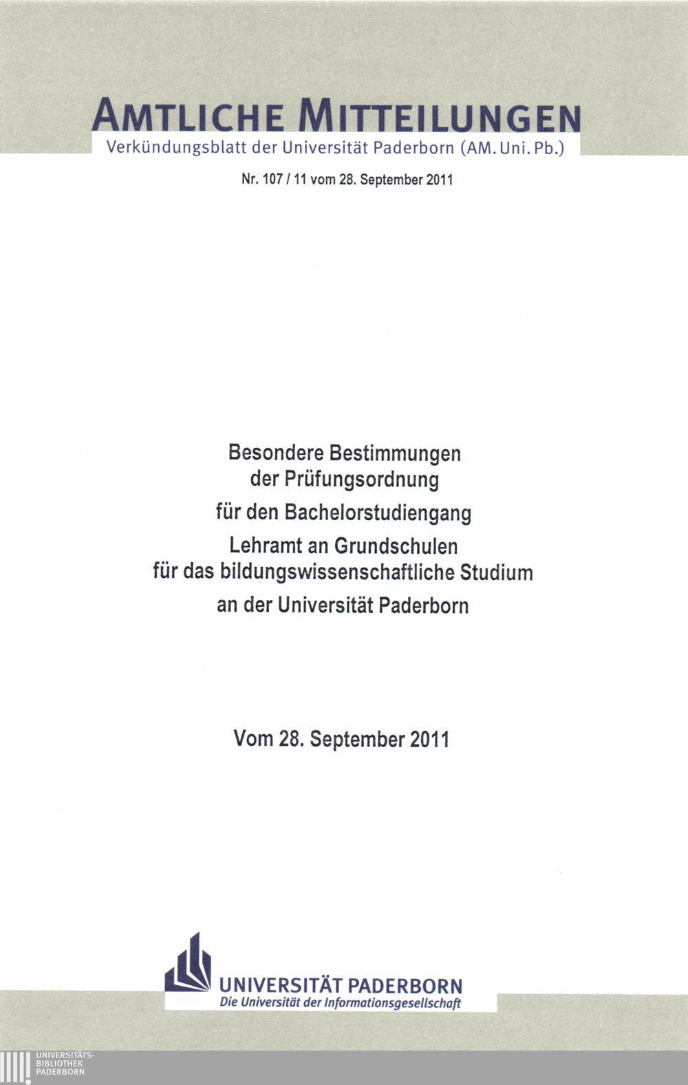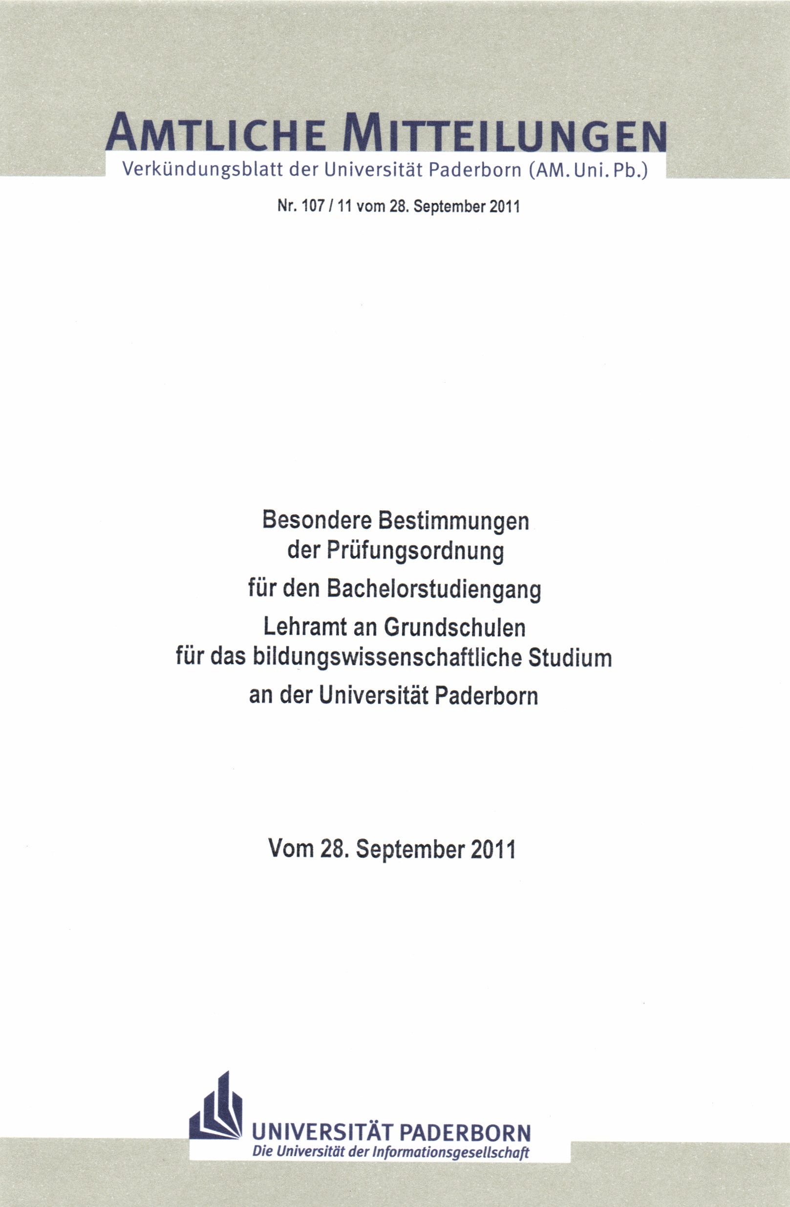 Besondere Bestimmungen der Prüfungsordnung für den Bachelorstudiengang Lehramt an Grundschulen für das bildungswissenschaftliche Studium an der Universität Paderborn : vom 28. September 2011