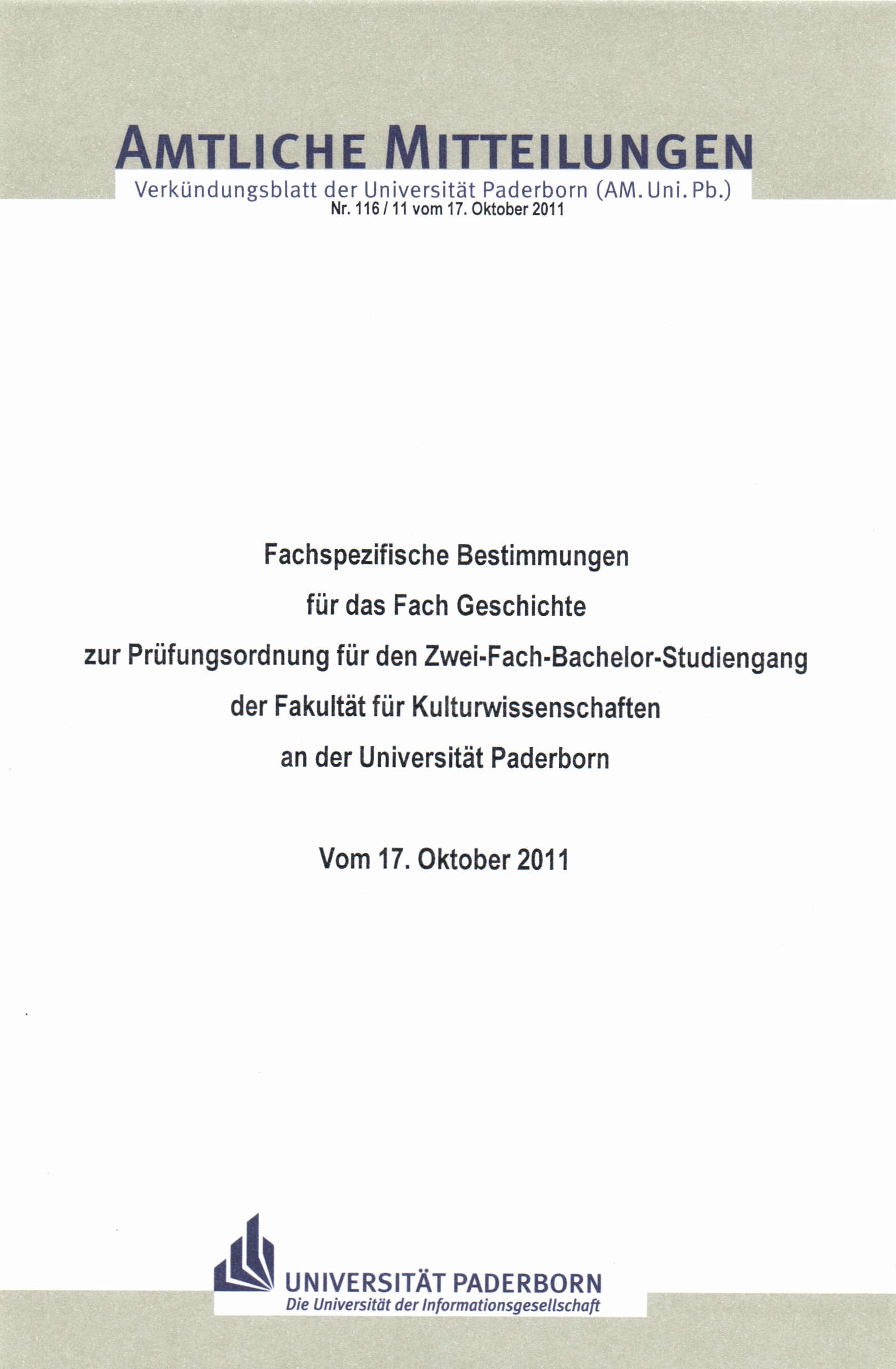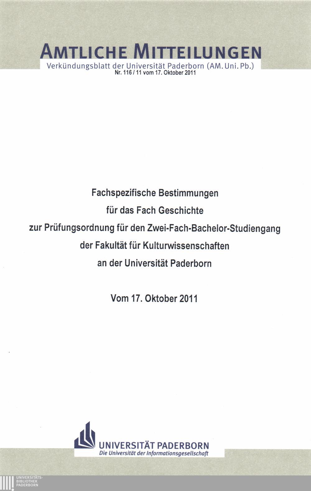 Fachspezifische Bestimmungen für das Fach Geschichte zur Prüfungsordnung für den Zwei-Fach-Bachelor-Studiengang der Fakultät für Kulturwissenschaften an der Universität Paderborn : vom 17. Oktober 2011