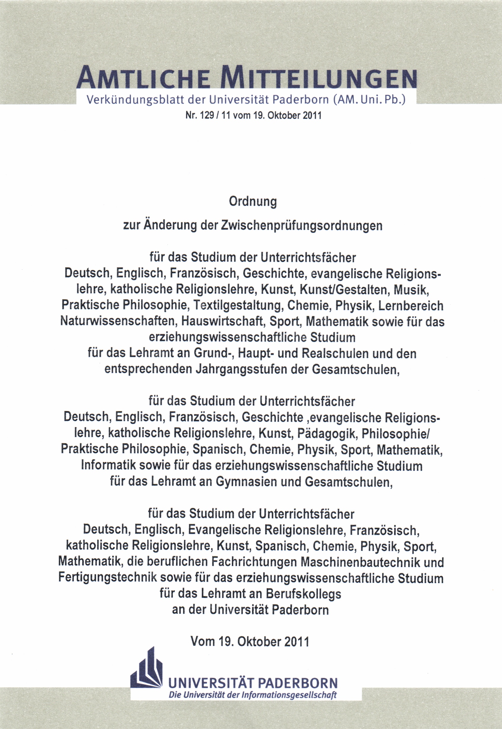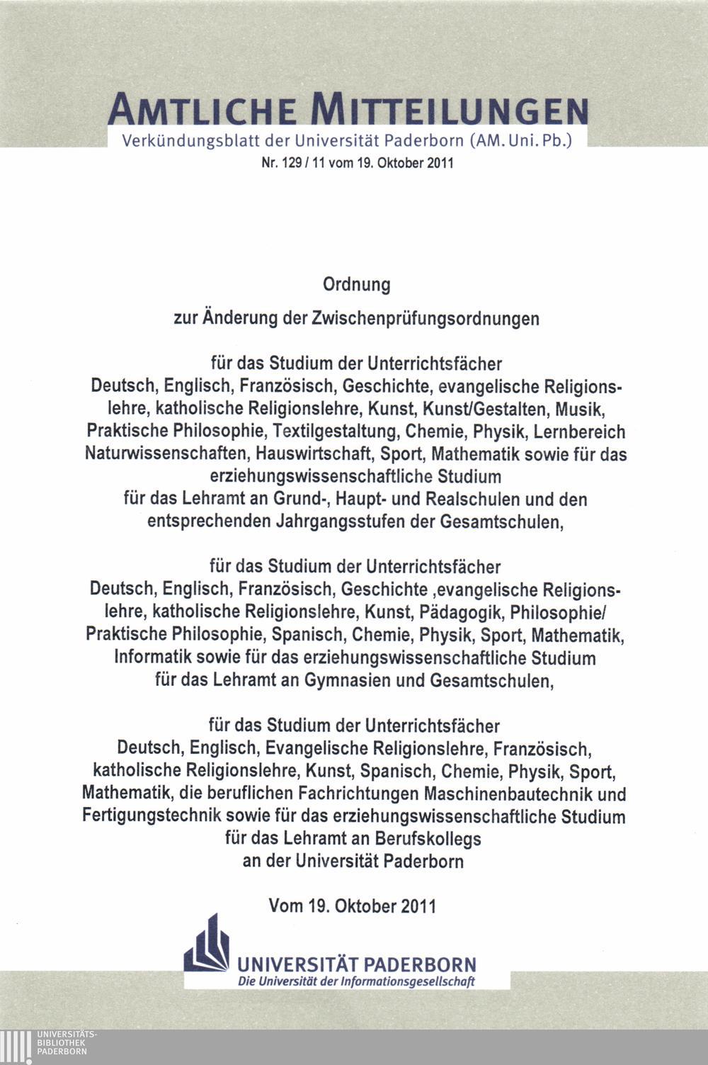 Ordnung zur Änderung der Zwischenprüfungsordnungen - für das Studium der Unterrichtsfächer Deutsch, Englisch, Französisch ... sowie für das erziehungswissenschaftliche Studium für das Lehramt an Grund, Haupt- und Realschulen und den entsprechenden Jahrgangsstufen der Gesamtschulen, - für das Studium der Unterrichtsfächer Deutsch, Englisch, Französisch ... sowie für das erziehungswissenschaftliche Studium für das Lehramt an Gymnasien und Gesamtschulen, - für das Studium der Unterrichtsfächer Deutsch, Englisch ... sowie für das erziehungswissenschaftliche Studium für das Lehramt an Berufskollegs an der Universität Paderborn : vom 19. Oktober 2011