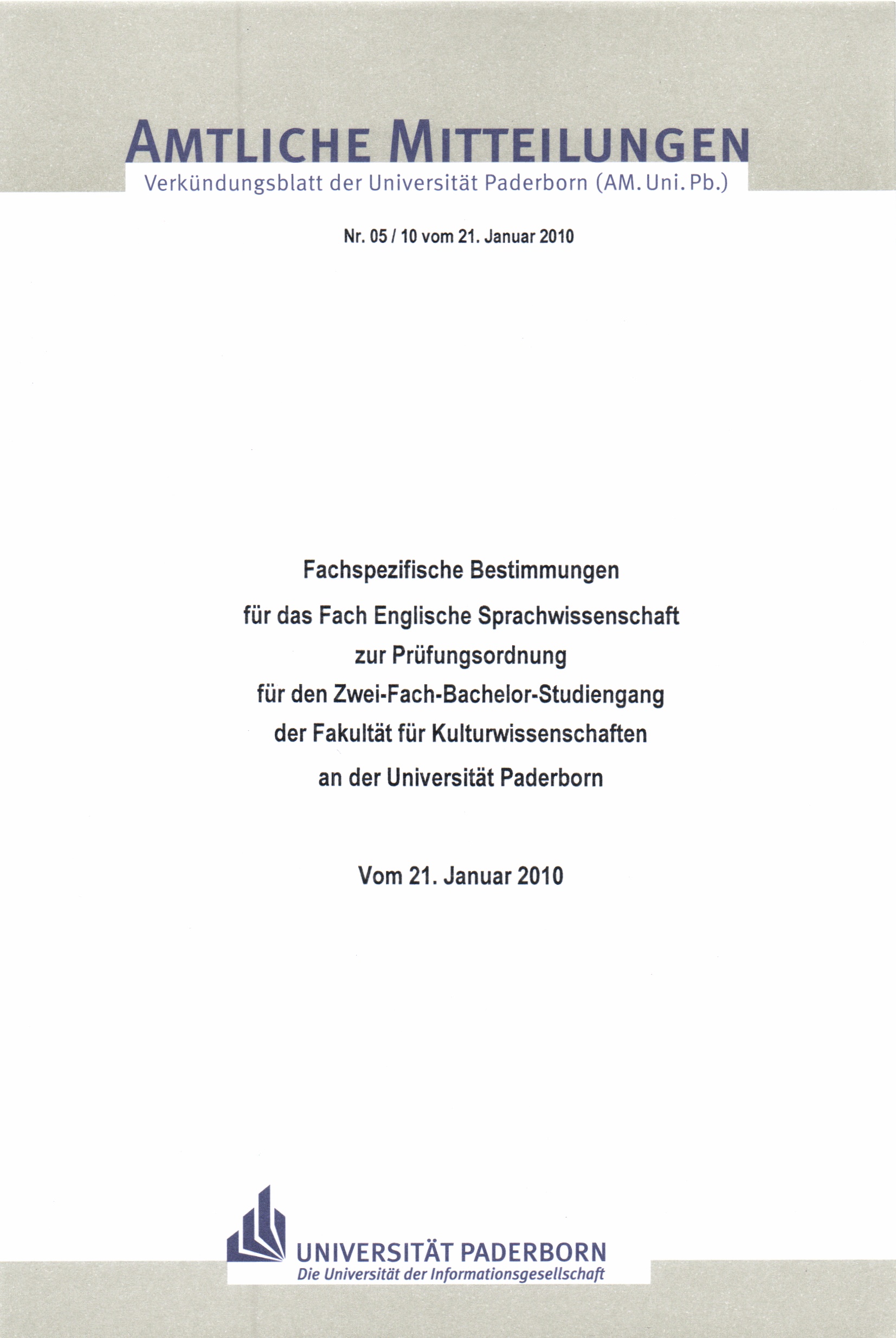 Fachspezifische Bestimmungen für das Fach Englische Sprachwissenschaft zur Prüfungsordnung für den Zwei-Fach-Bachelor-Studiengang der Fakultät für Kulturwissenschaften an der Universität Paderborn : vom 21. Januar 2010
