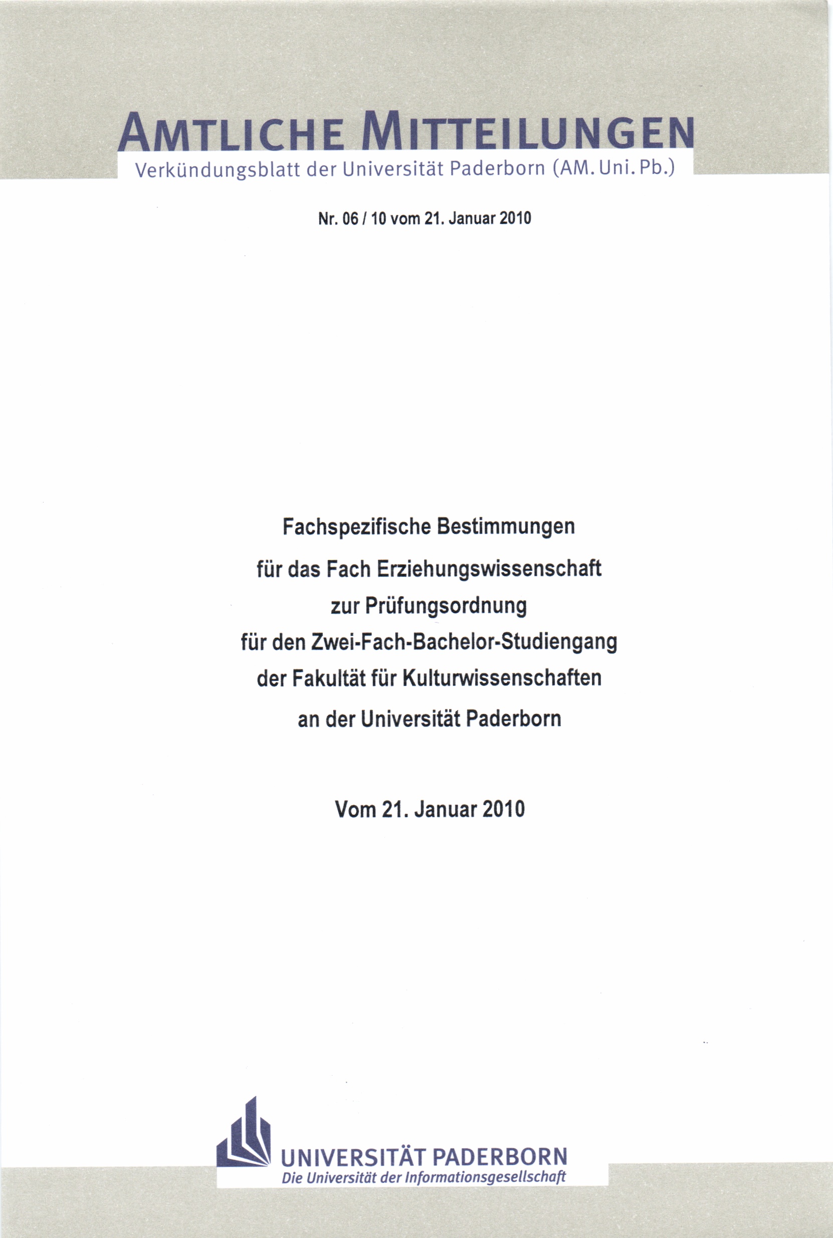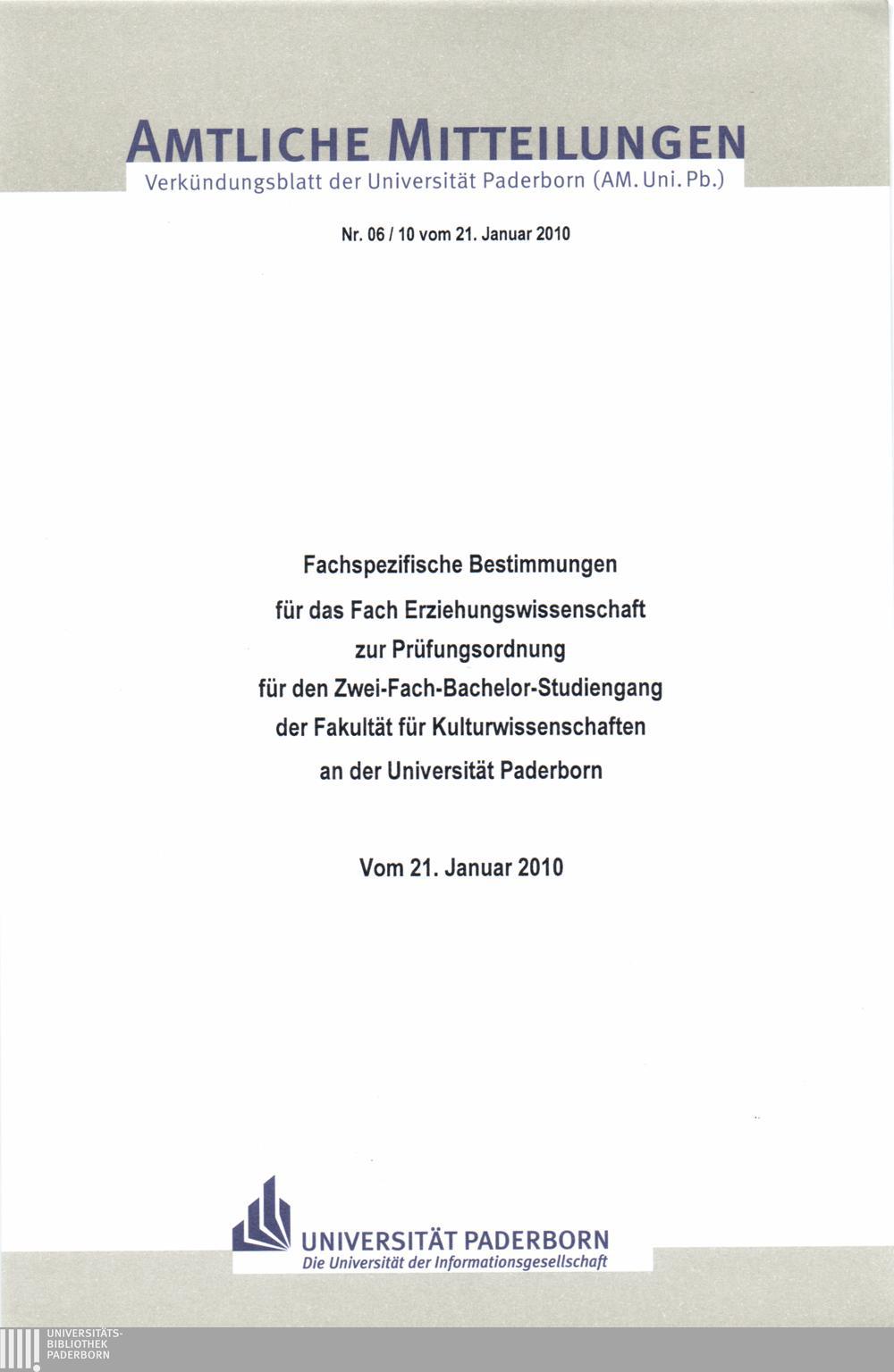 Fachspezifische Bestimmungen für das Fach Erziehungswissenschaft zur Prüfungsordnung für den Zwei-Fach-Bachelor-Studiengang der Fakultät für Kulturwissenschaften an der Universität Paderborn : vom 21. Januar 2010