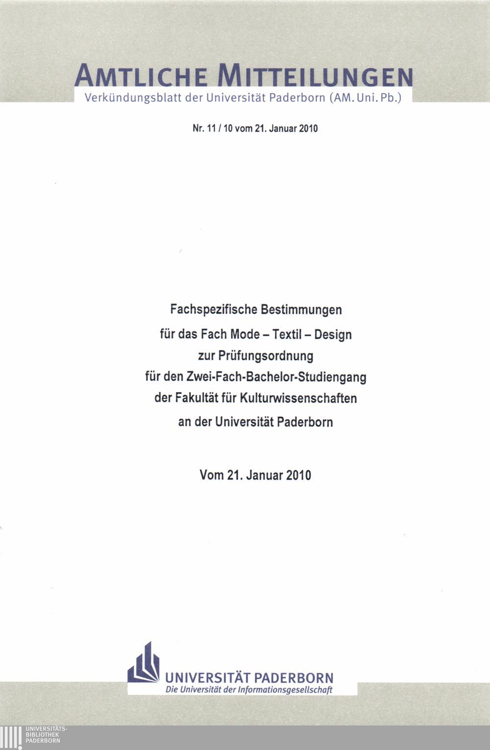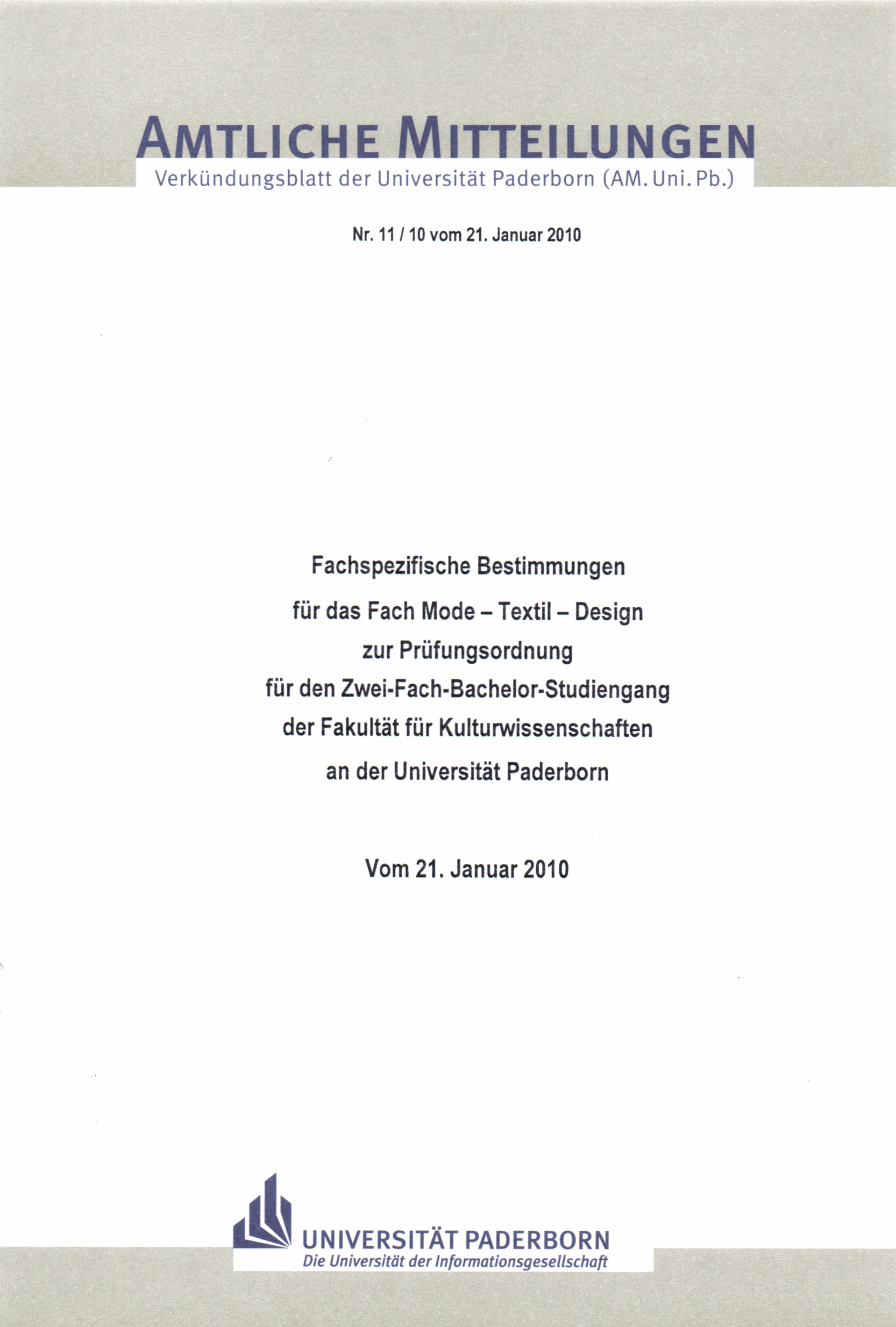 Fachspezifische Bestimmungen für das Fach Mode - Textil - Design zur Prüfungsordnung für den Zwei-Fach-Bachelor-Studiengang der Fakultät für Kulturwissenschaften an der Universität Paderborn : vom 21. Januar 2010