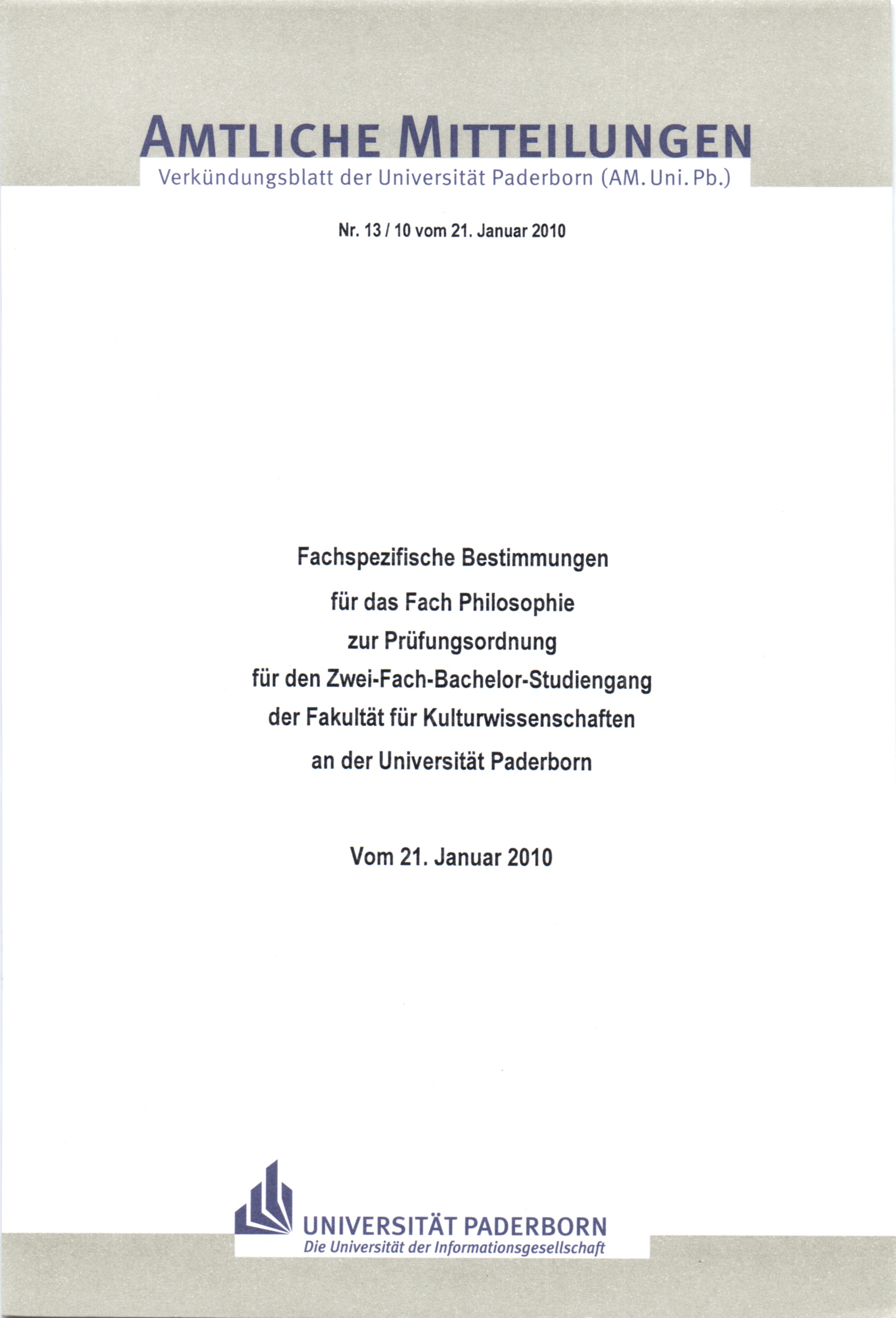 Fachspezifische Bestimmungen für das Fach Philosophie zur Prüfungsordnung für den Zwei-Fach-Bachelor-Studiengang der Fakultät für Kulturwissenschaften an der Universität Paderborn : vom 21. Januar 2010