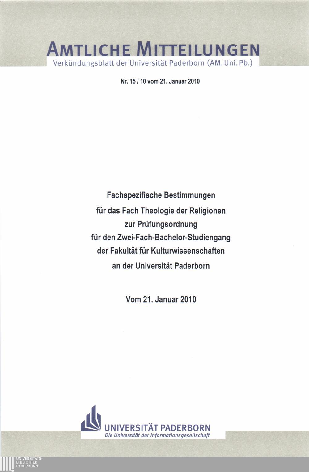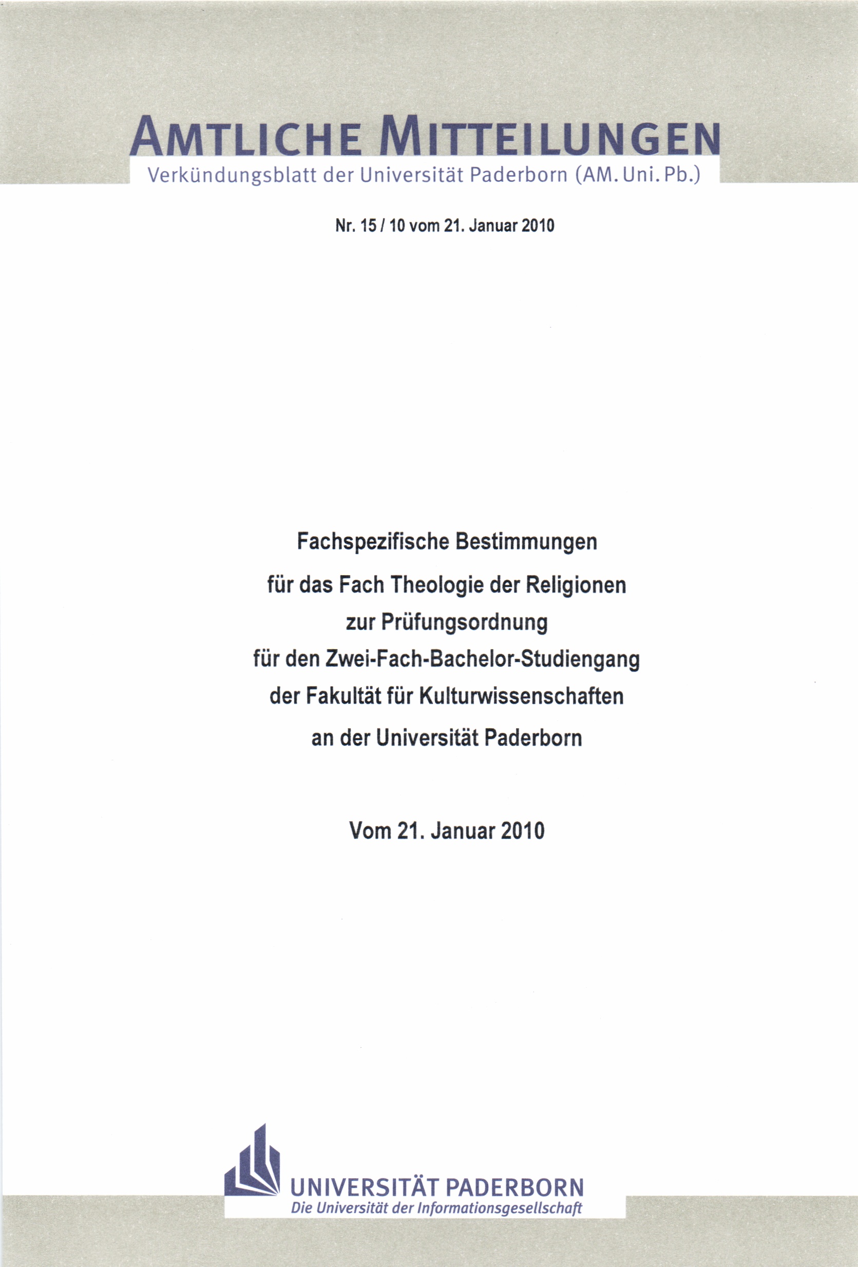Fachspezifische Bestimmungen für das Fach Theologie der Religionen zur Prüfungsordnung für den Zwei-Fach-Bachelor-Studiengang der Fakultät für Kulturwissenschaften an der Universität Paderborn : vom 21. Januar 2010