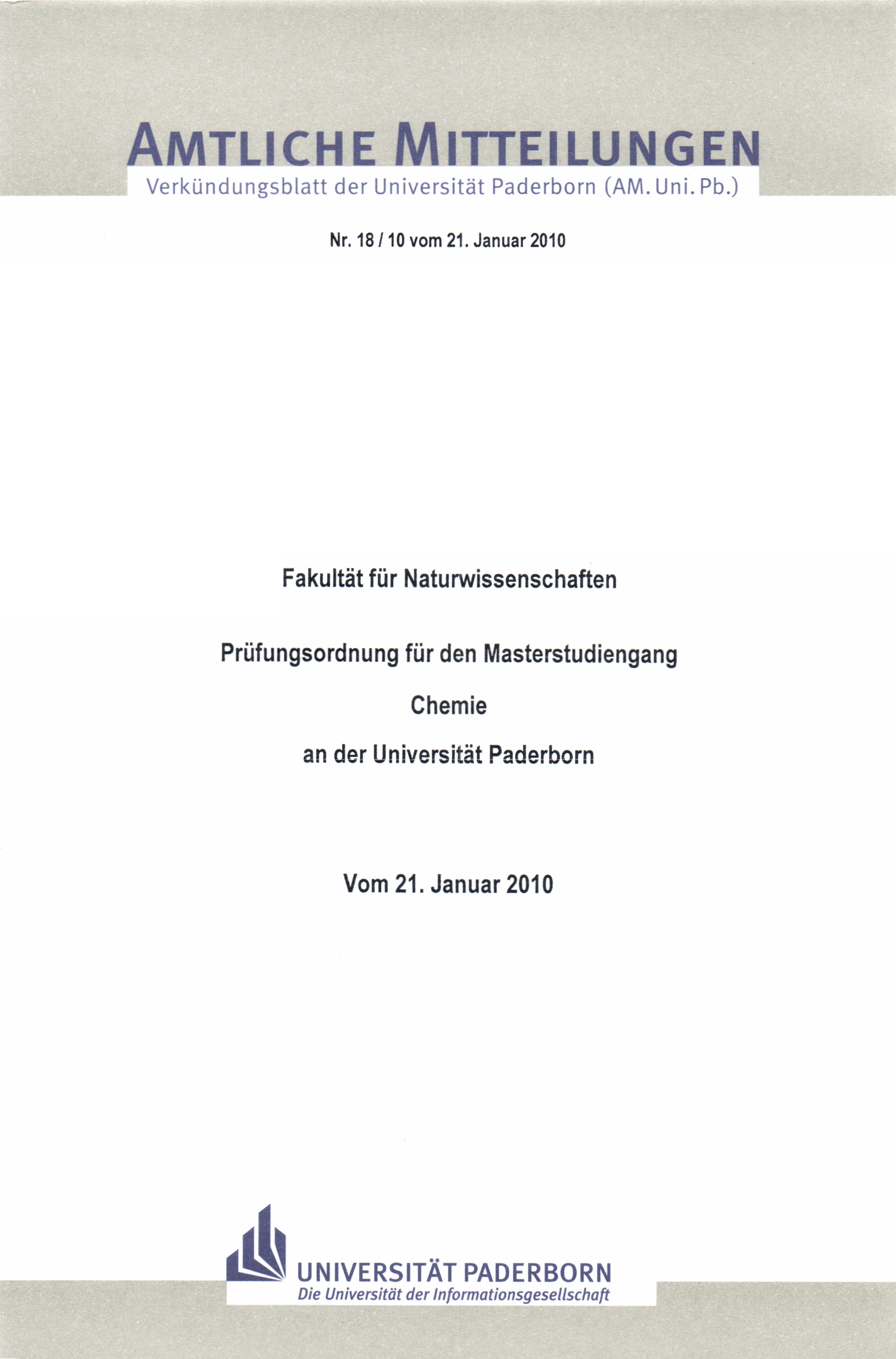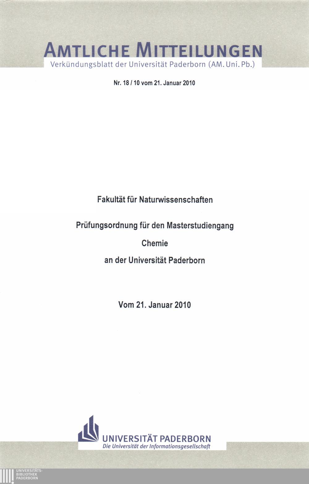 Prüfungsordnung für den Masterstudiengang Chemie an der Universität Paderborn : vom 21. Januar 2010 / Fakultät für Naturwissenschaften