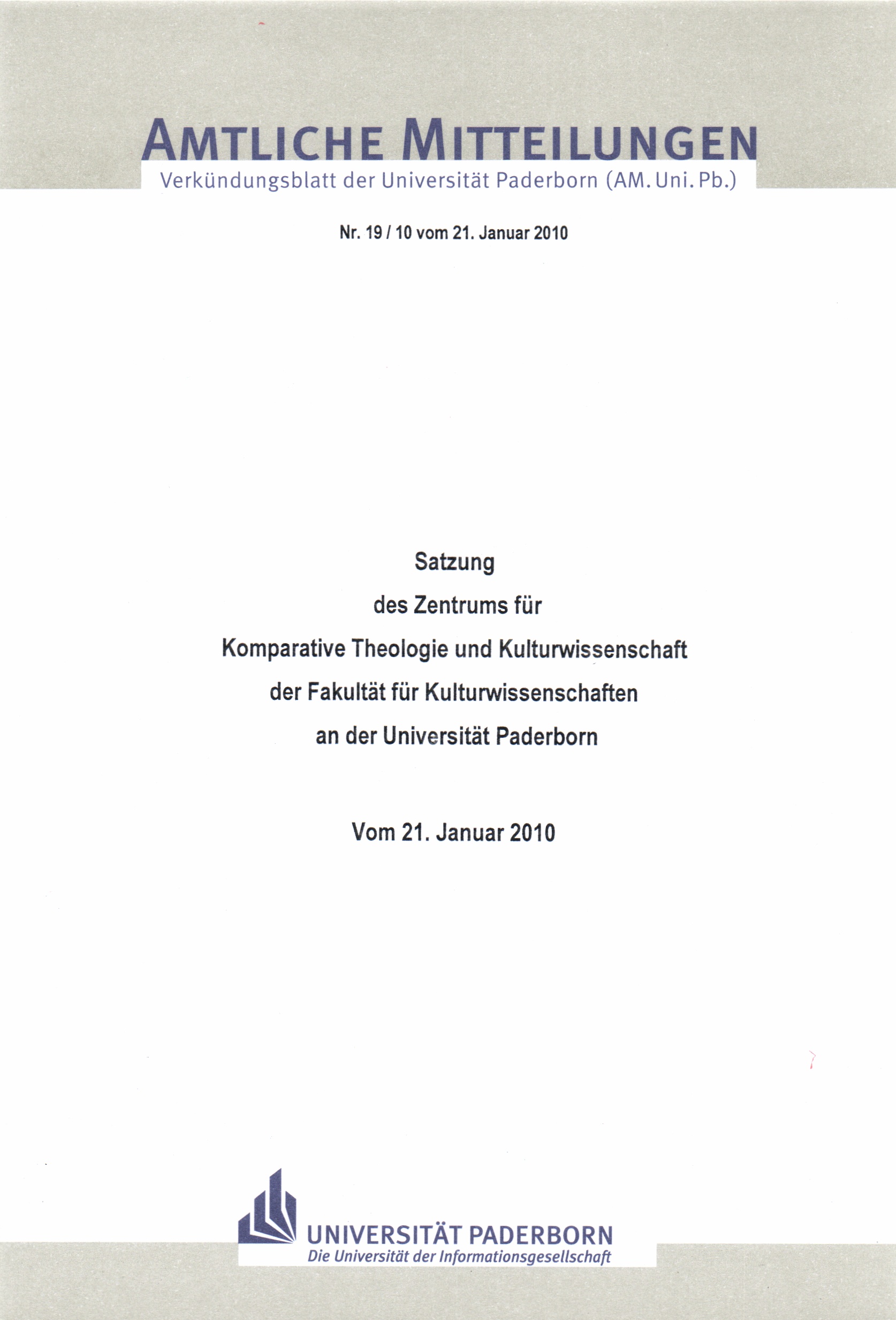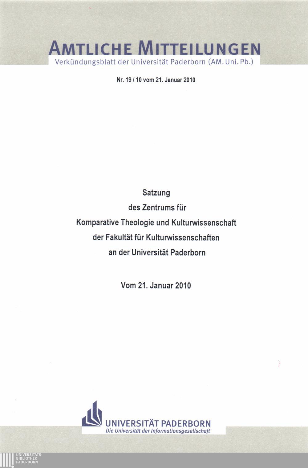Satzung des Zentrums für Komparative Theologie und Kulturwissenschaft der Fakultät für Kulturwissenschaften an der Universität Paderborn : vom 21. Januar 2010