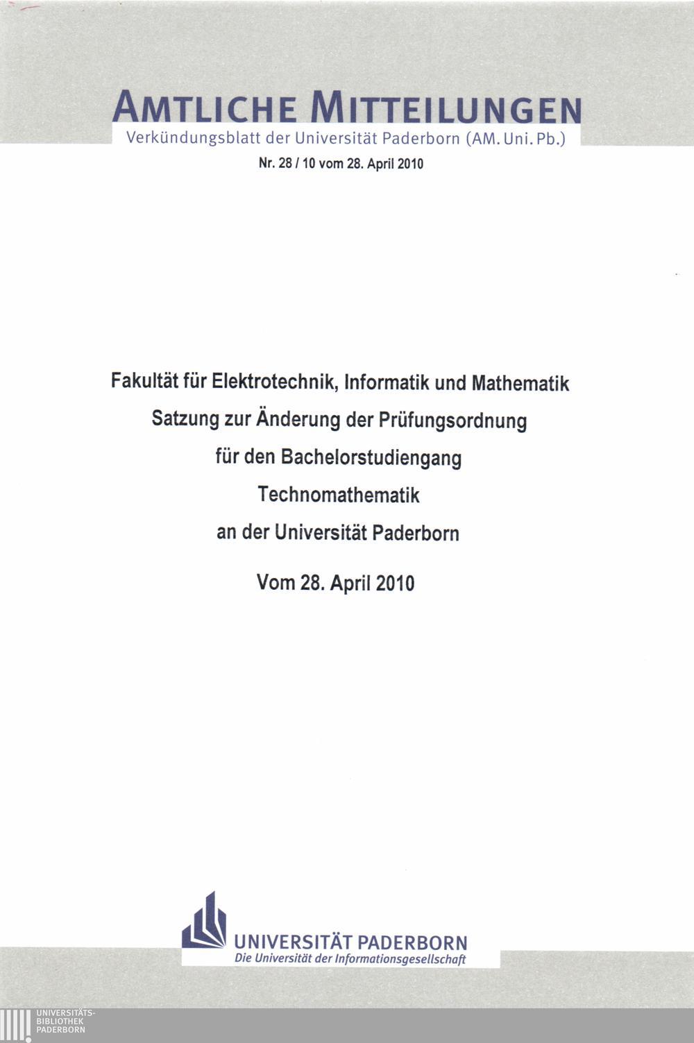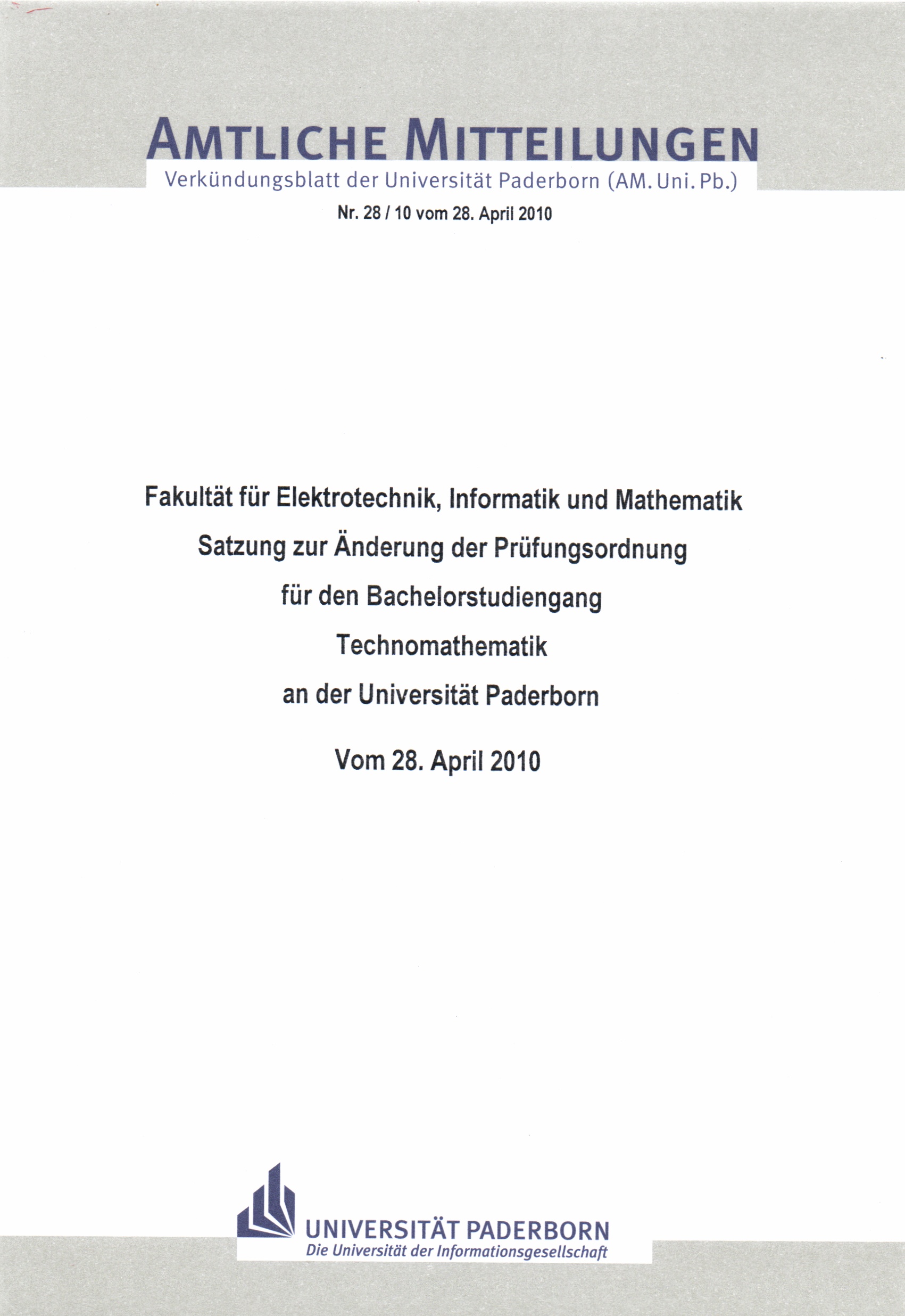 Satzung zur Änderung der Prüfungsordnung für den Bachelorstudiengang Technomathematik an der Universität Paderborn : vom 28. April 2010 / Fakultät für Elektrotechnik, Informatik und Mathematik
