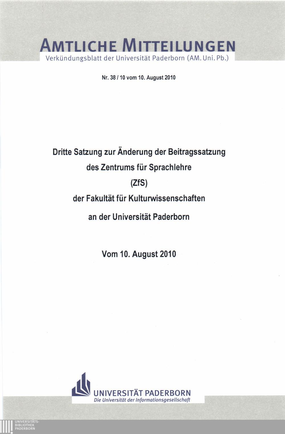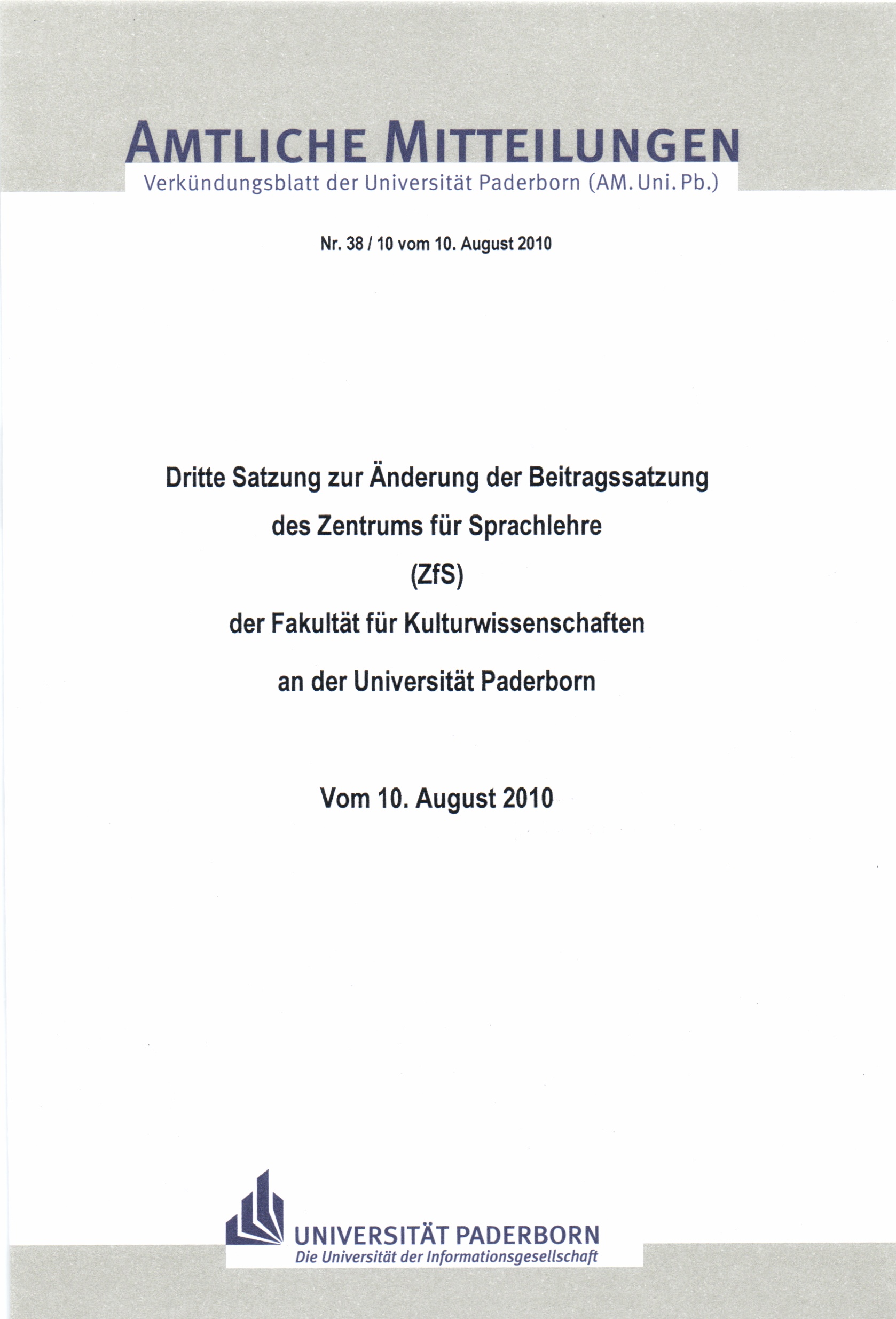 Dritte Satzung zur Änderung der Beitragssatzung des Zentrums für Sprachlehre (ZfS) der Fakultät für Kulturwissenschaften an der Universität Paderborn : vom 10. August 2010