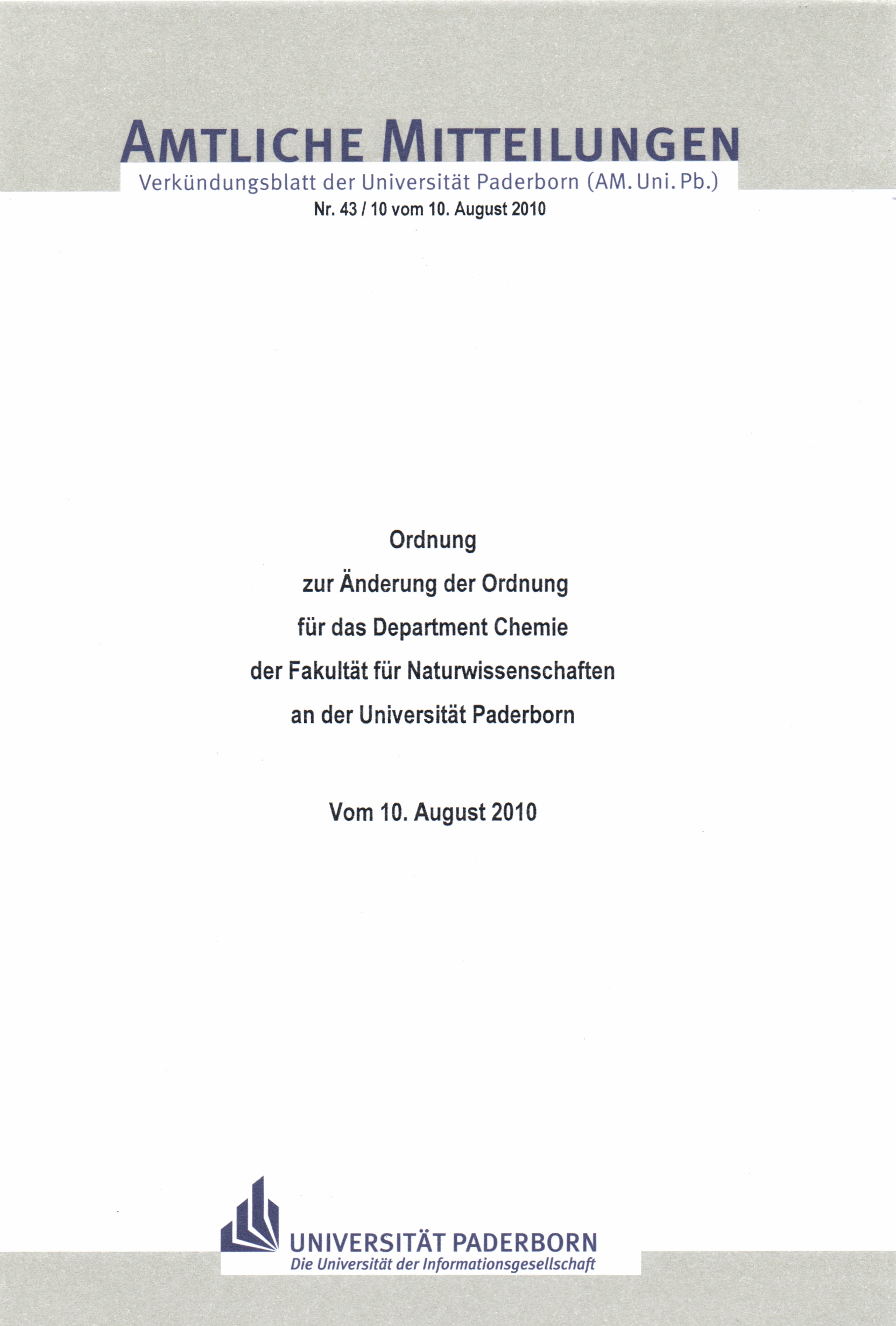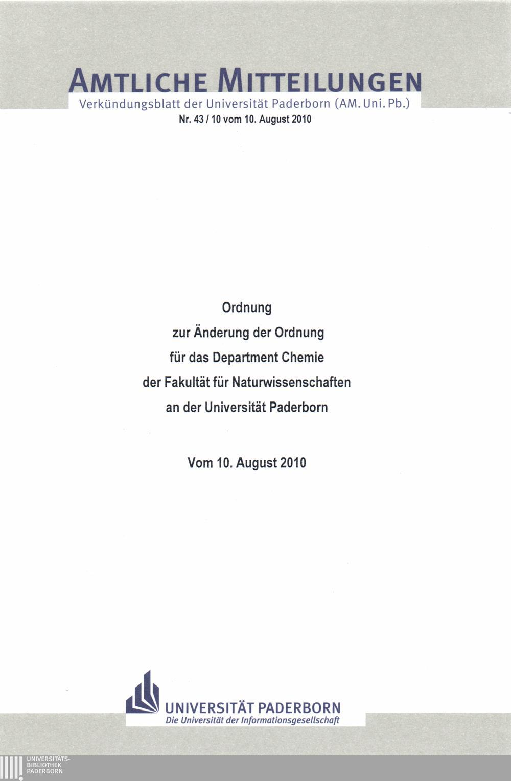 Ordnung zur Änderung der Ordnung für das Department Chemie der Fakultät für Naturwissenschaften an der Universität Paderborn : vom 10. August 2010