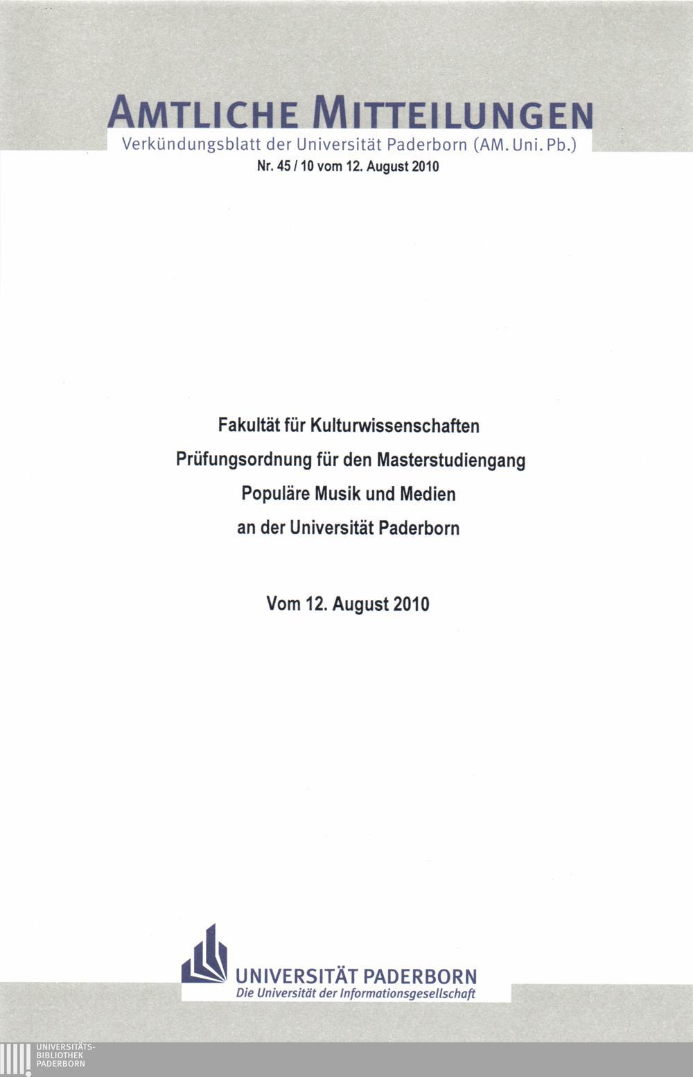 Prüfungsordnung für den Masterstudiengang "Populäre Musik und Medien" an der Universität Paderborn : vom 12. August 2010 / Fakultät für Kulturwissenschaften