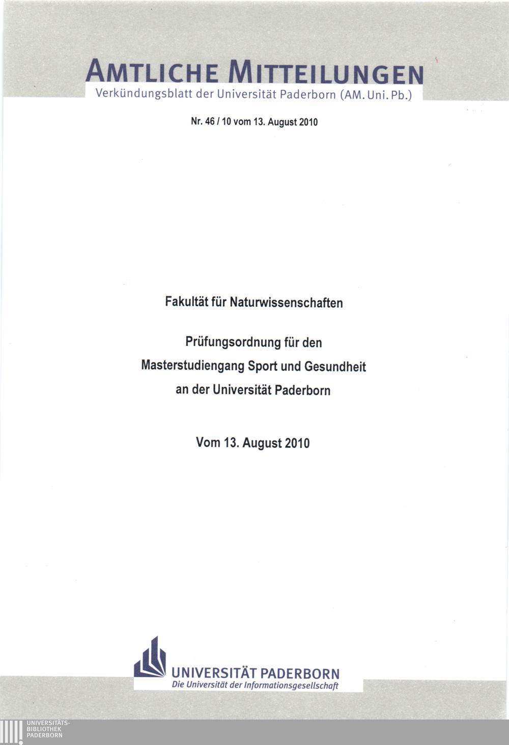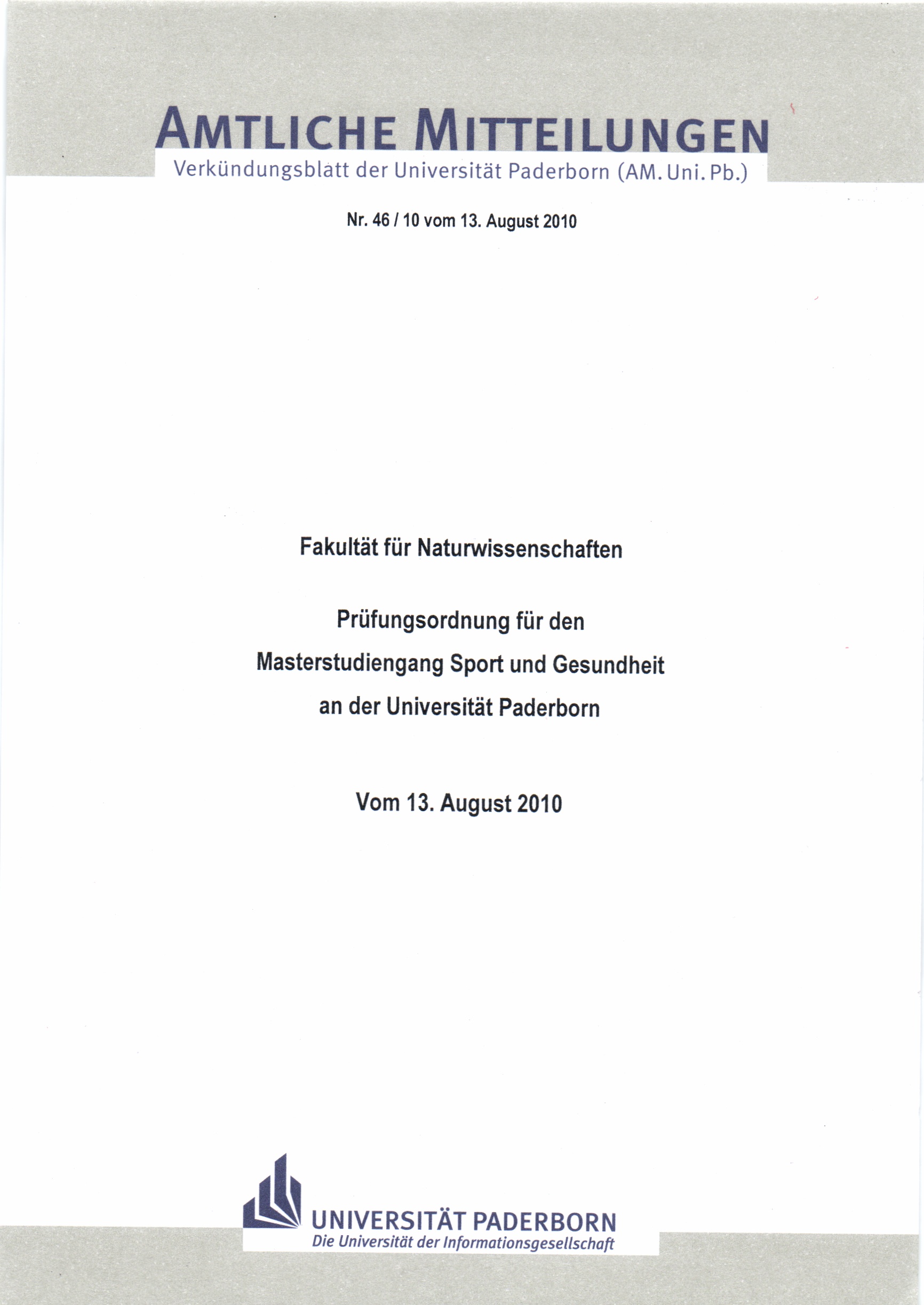 Prüfungsordnung für den Masterstudiengang "Sport und Gesundheit" an der Universität Paderborn : vom 13. August 2010 / Fakultät für Naturwissenschaften