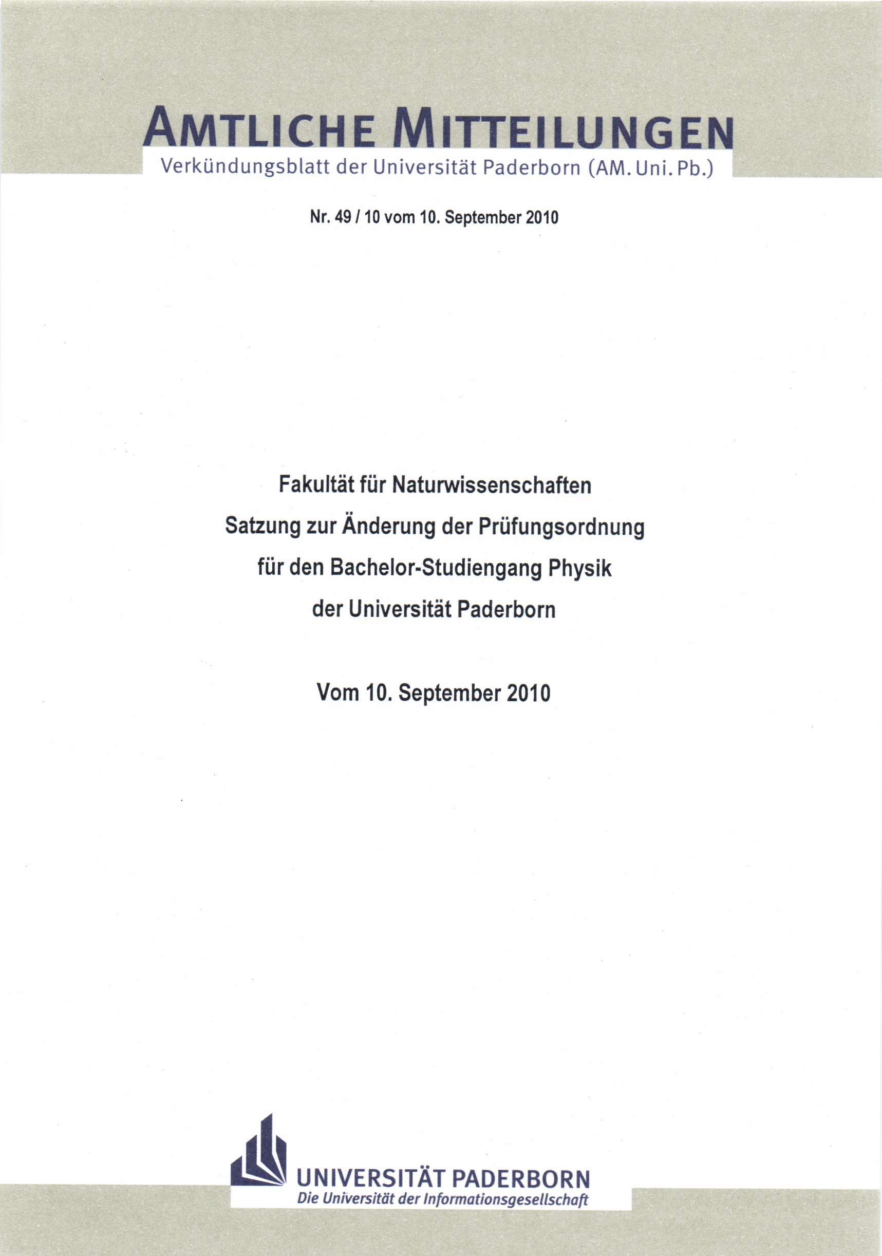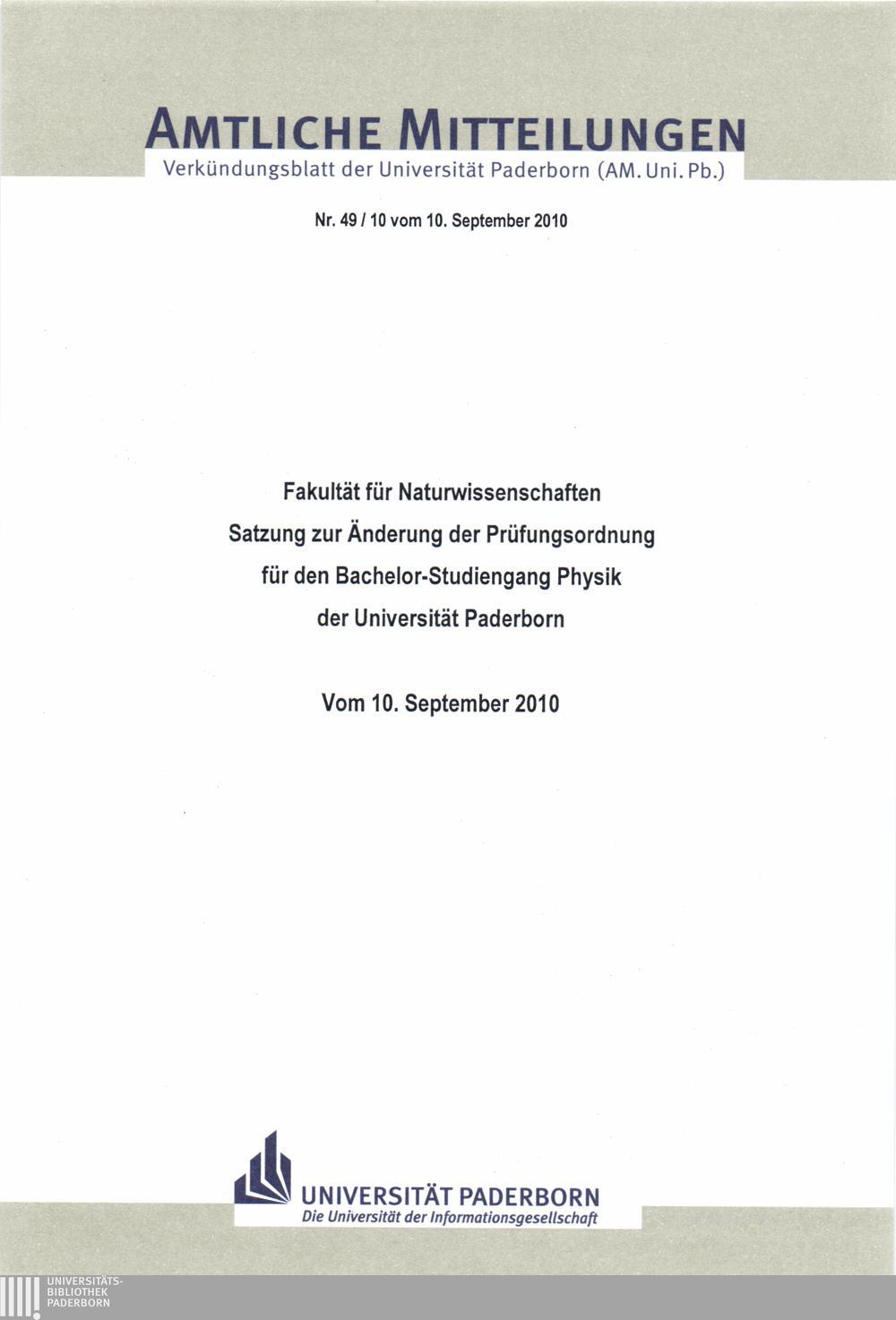Satzung zur Änderung der Prüfungsordnung für den Bachelor-Studiengang Physik der Universität Paderborn : vom 10. September 2010 / Fakultät für Naturwissenschaften