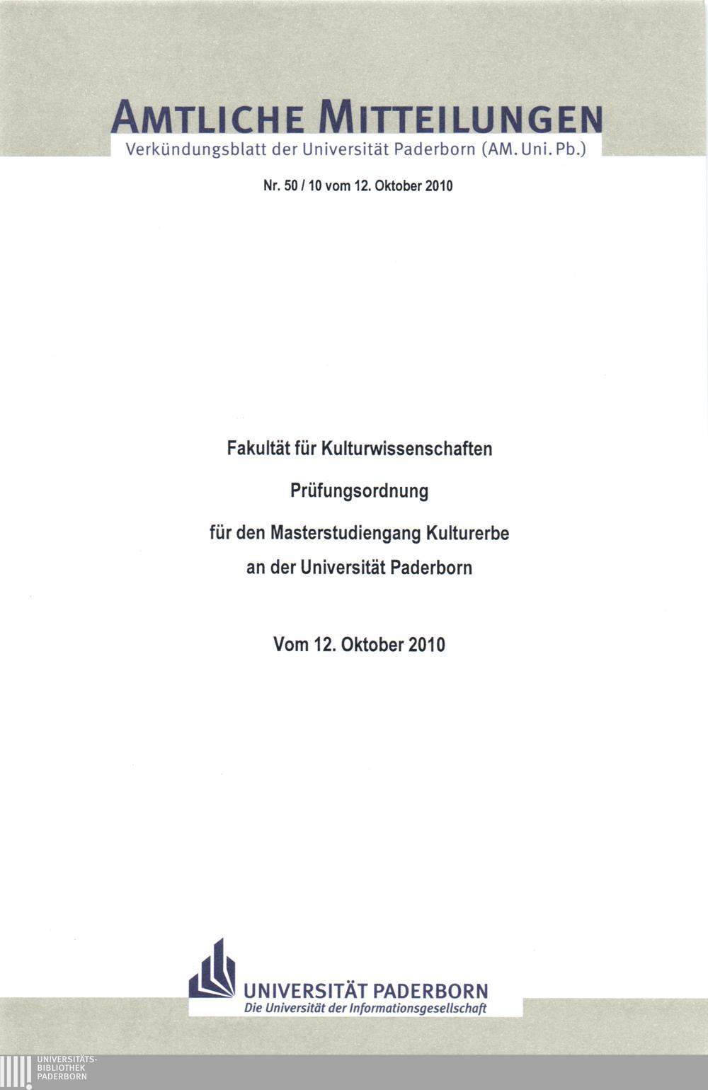 Prüfungsordnung für den Masterstudiengang Kulturerbe an der Universität Paderborn : vom 12. Oktober 2010 / Fakultät für Kulturwissenschaften