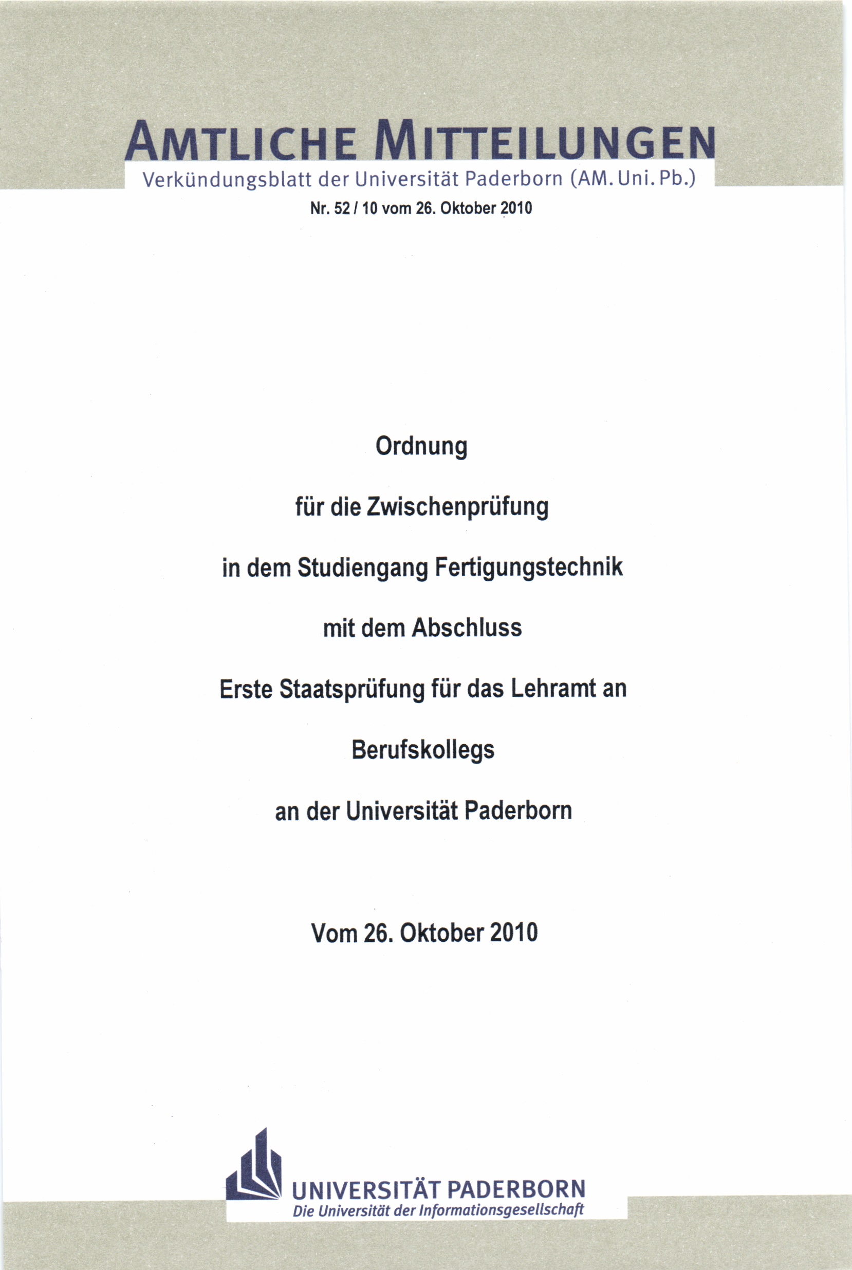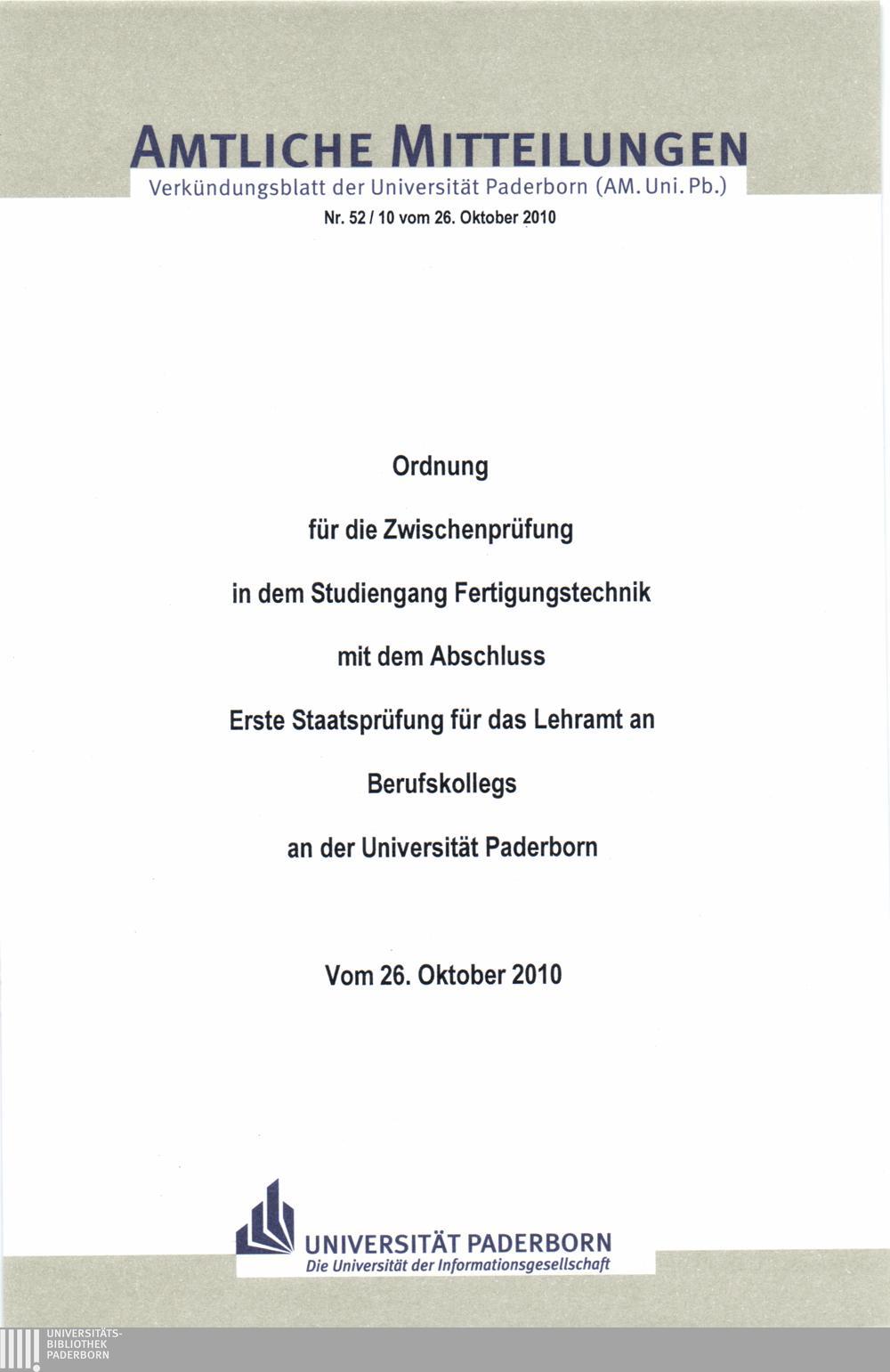 Ordnung für die Zwischenprüfung in dem Studiengang Fertigungstechnik mit dem Abschluss Erste Staatsprüfung für das Lehramt an Berufskollegs an der Universität Paderborn : vom 26. Oktober 2010