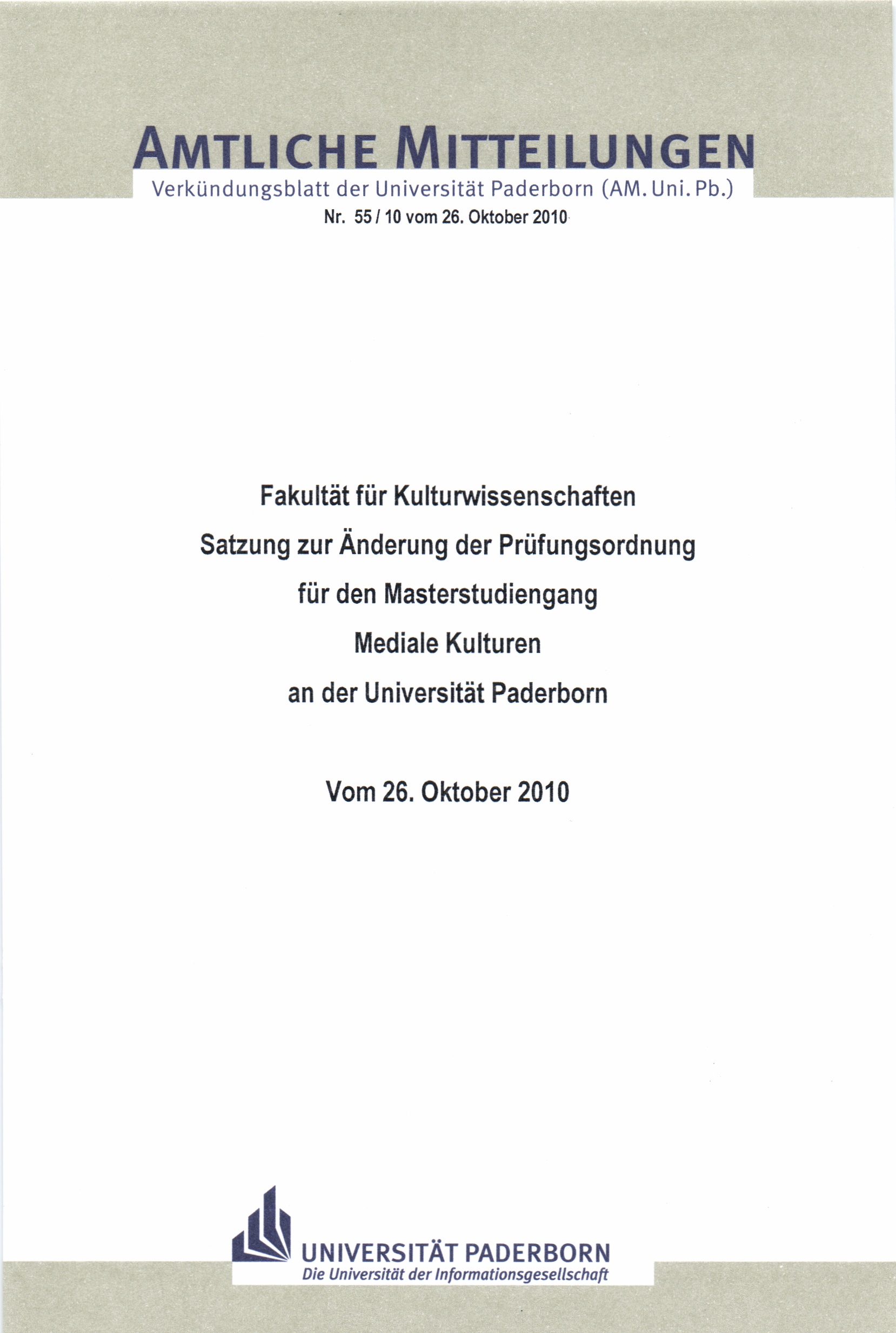 Satzung zur Änderung der Prüfungsordnung für den Masterstudiengang Mediale Kulturen an der Universität Paderborn : vom 26. Oktober 2010 / Fakultät für Kulturwissenschaften