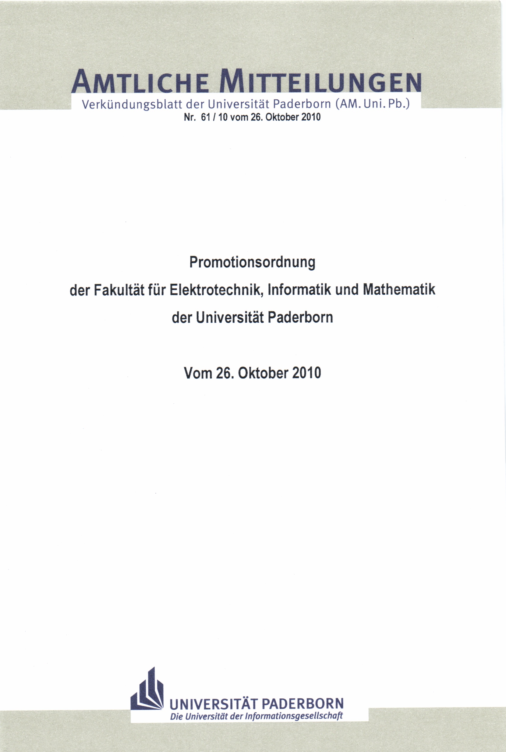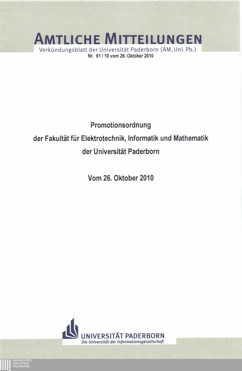Promotionsordnung der Fakultät für Elektrotechnik, Informatik und Mathematik der Universität Paderborn : vom 26. Oktober 2010