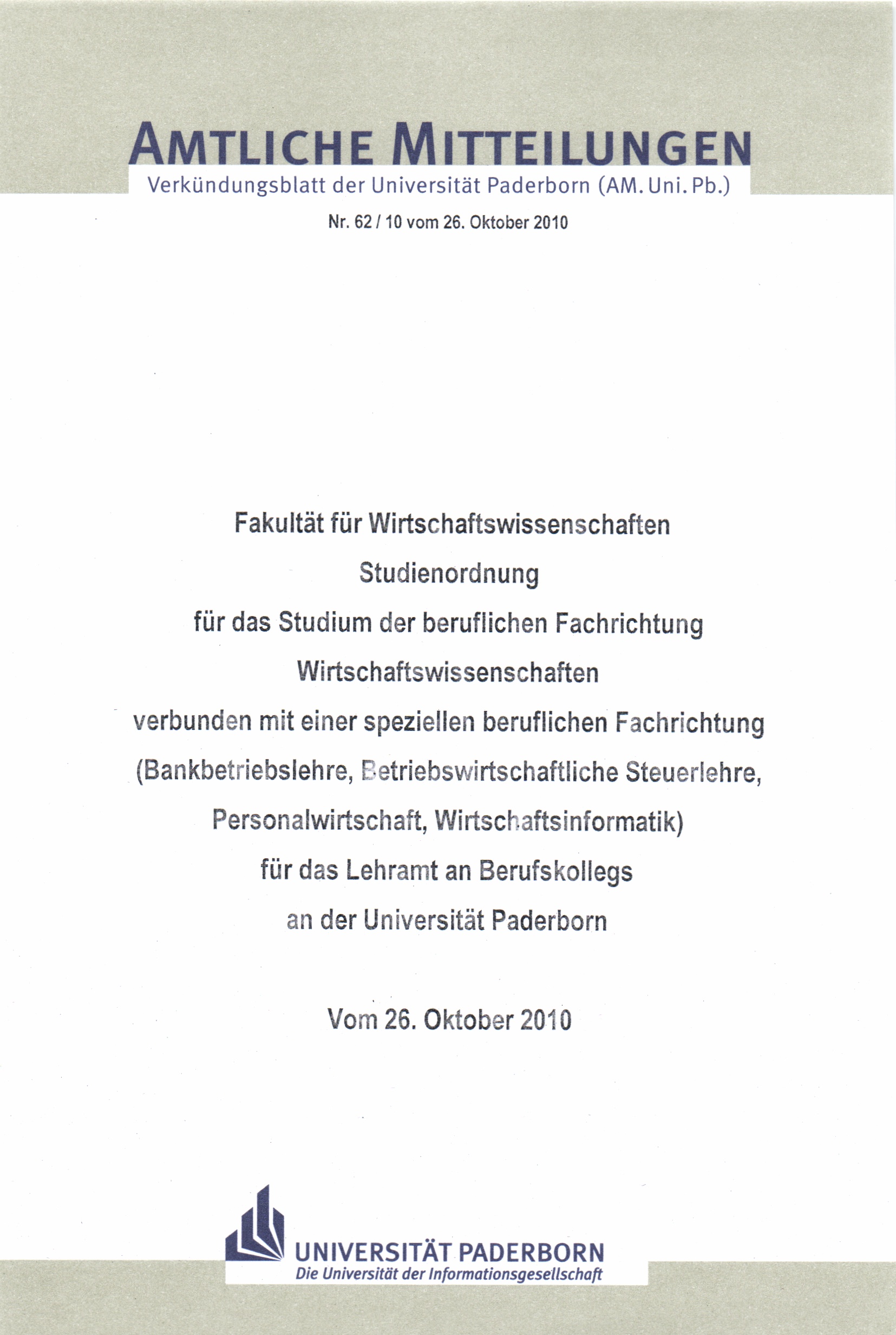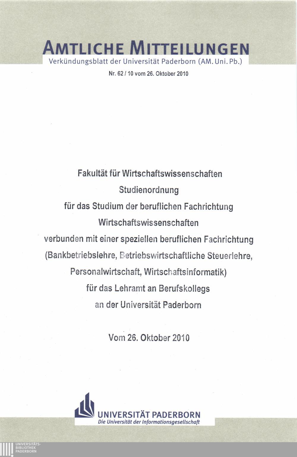 Studienordnung für das Studium der beruflichen Fachrichtung Wirtschaftswissenschaften verbunden mit einer speziellen beruflichen Fachrichtung (Bankbetriebslehre, Betriebswirtschaftliche Steuerlehre, Personalwirtschaft, Wirtschaftsinformatik) für das Lehramt an Berufskollegs an der Universität Paderborn : vom 26. Oktober 2010 / Fakultät für Wirtschaftswissenschaften
