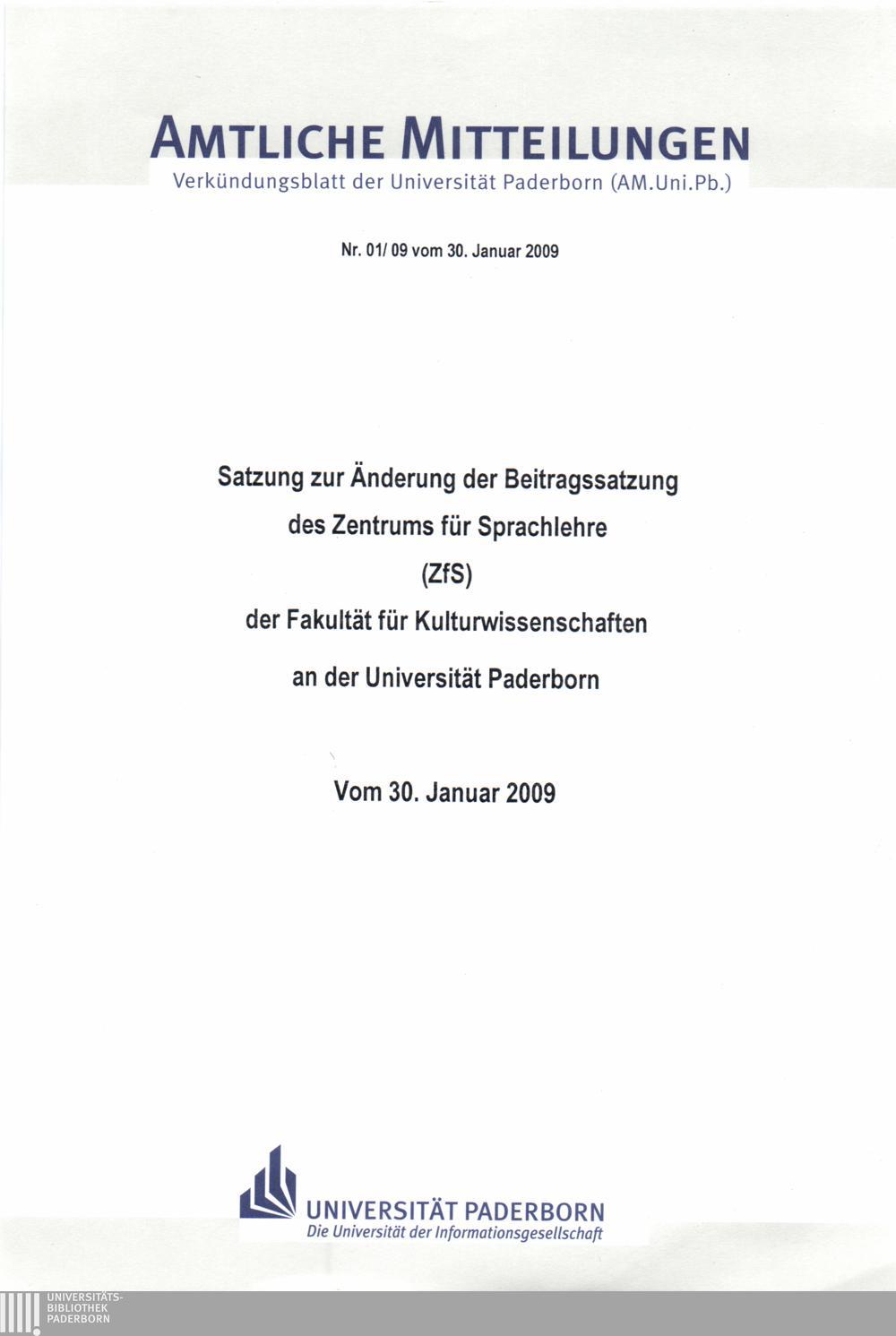 Satzung zur Änderung der Beitragssatzung des Zentrums für Sprachlehre (ZfS) der Fakultät für Kulturwissenschaften an der Universität Paderborn : vom 30. Januar 2009