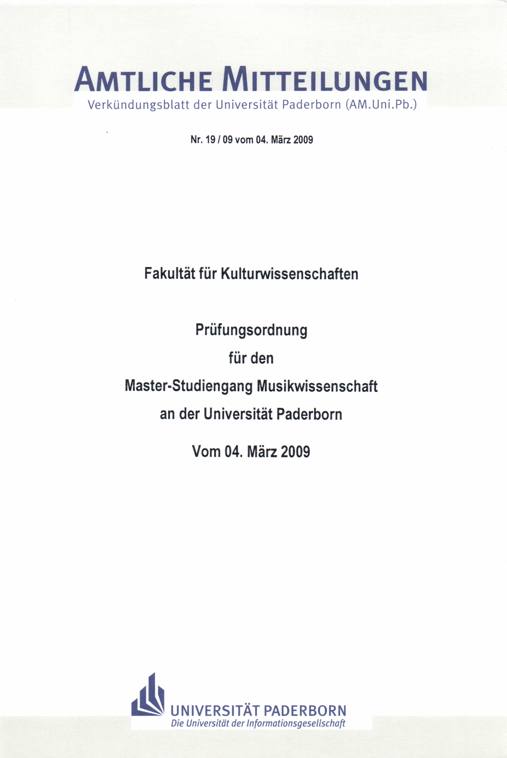 Prüfungsordnung für den Master-Studiengang Musikwissenschaft an der Universität Paderborn : vom 04. März 2009 / Fakultät für Kulturwissenschaften