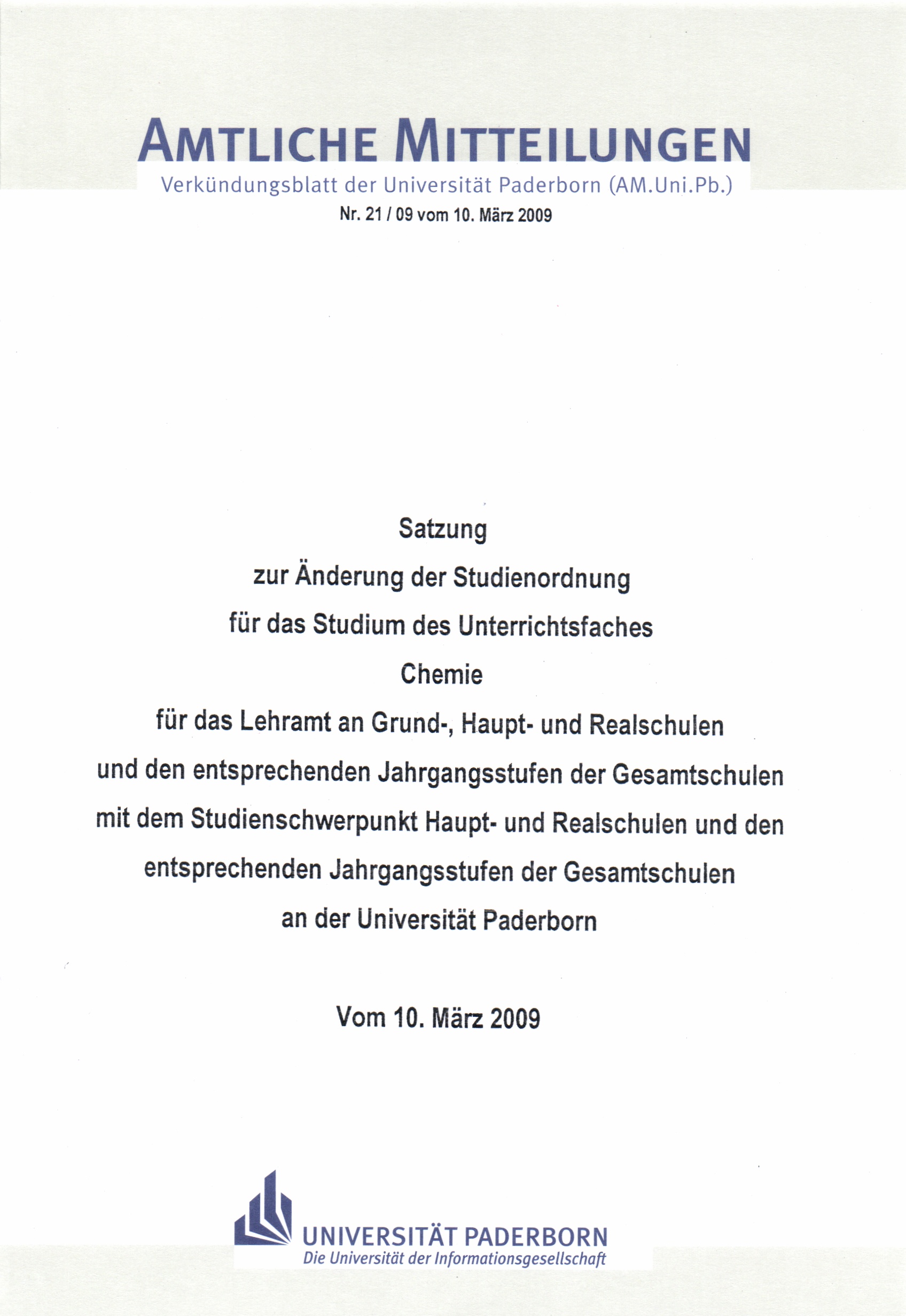 Satzung zur Änderung der Studienordnung für das Studium des Unterrichtsfaches Chemie für das Lehramt an Grund-, Haupt- und Realschulen und den entsprechenden Jahrgangsstufen der Gesamtschulen mit dem Studienschwerpunkt Haupt- und Realschulen und den entsprechenden Jahrgangsstufen der Gesamtschulen an der Universität Paderborn : vom 10. März 2009