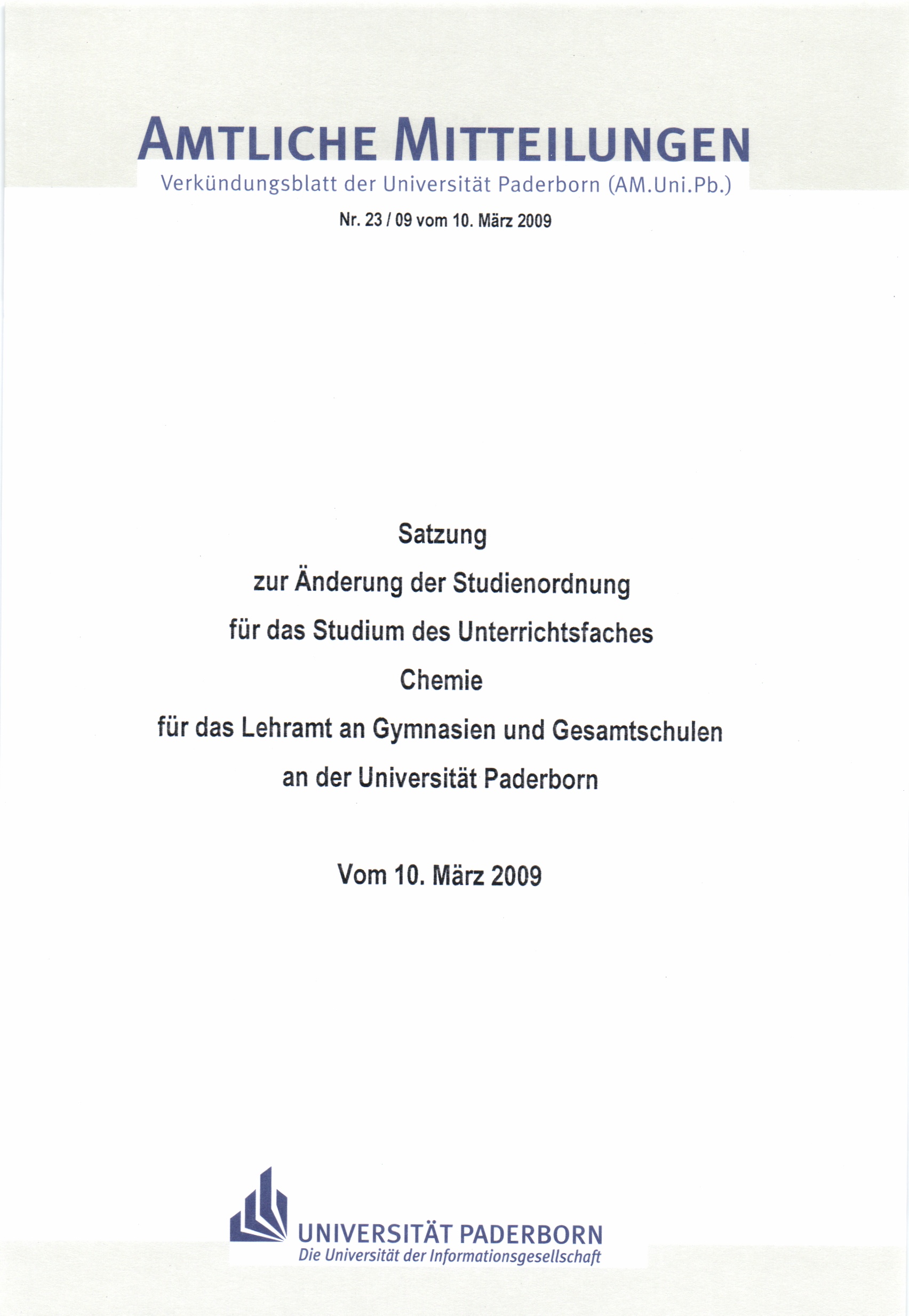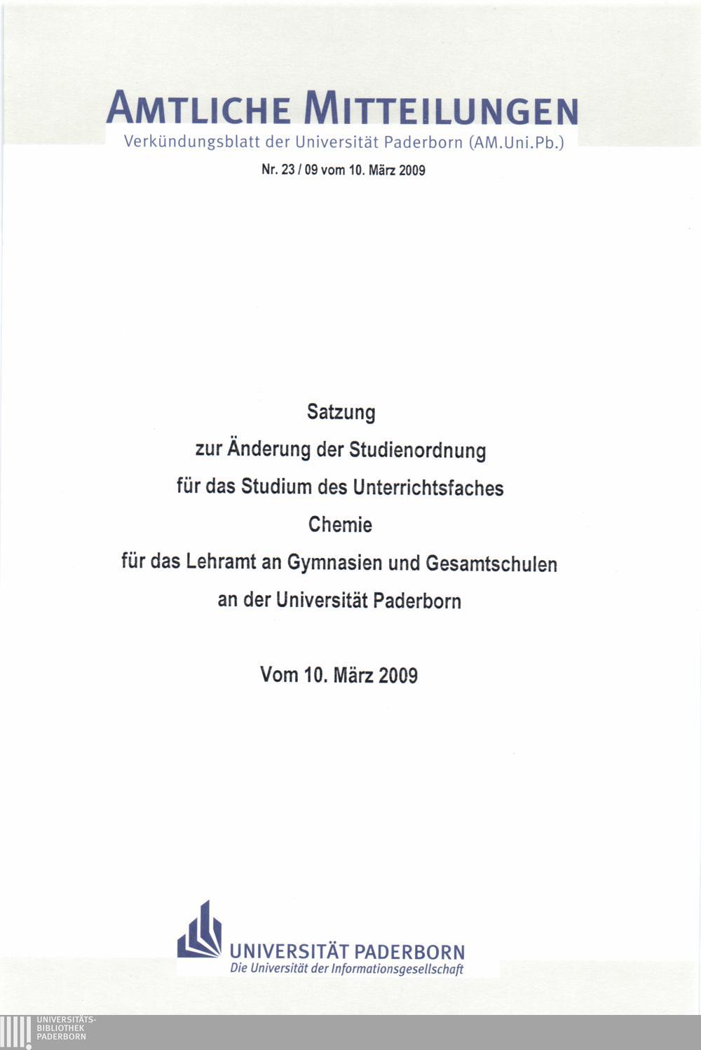 Satzung zur Änderung der Studienordnung für das Studium des Unterrichtsfaches Chemie für das Lehramt an Gymnasien und Gesamtschulen an der Universität Paderborn : vom 10. März 2009