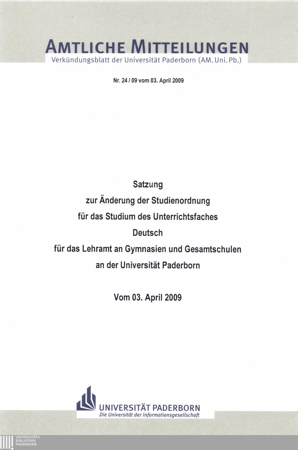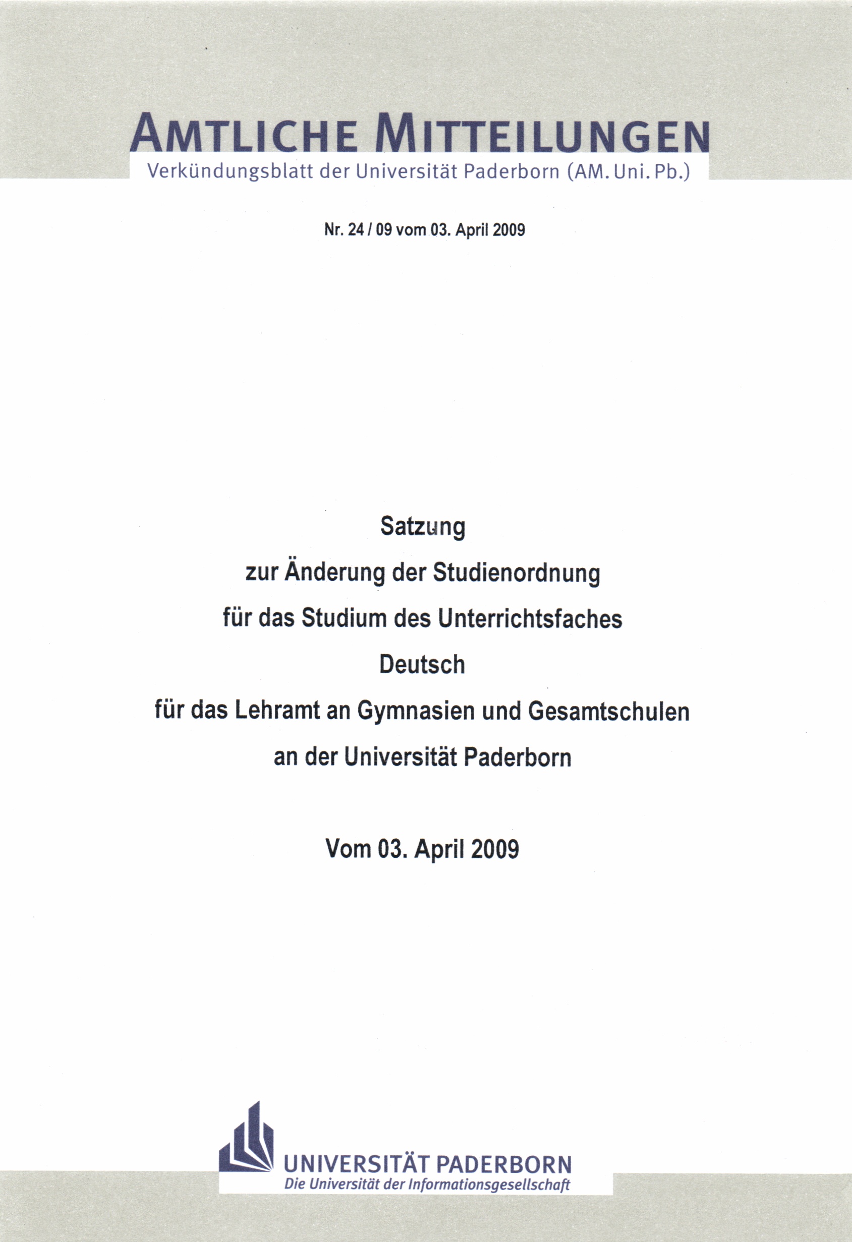 Satzung zur Änderung der Studienordnung für das Studium des Unterrichtsfaches Deutsch für das Lehramt an Gymnasien und Gesamtschulen an der Universität Paderborn : vom 03. April 2009
