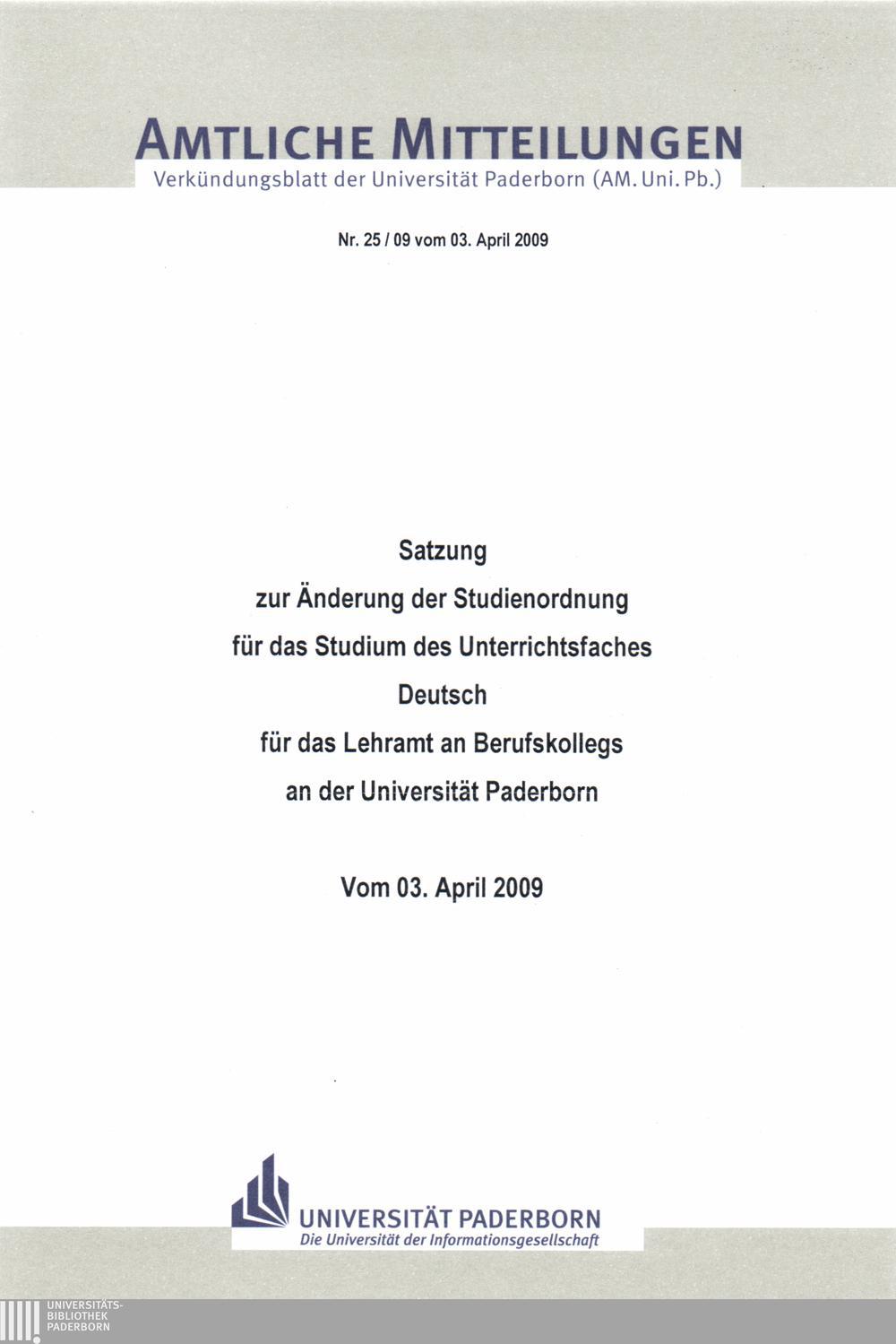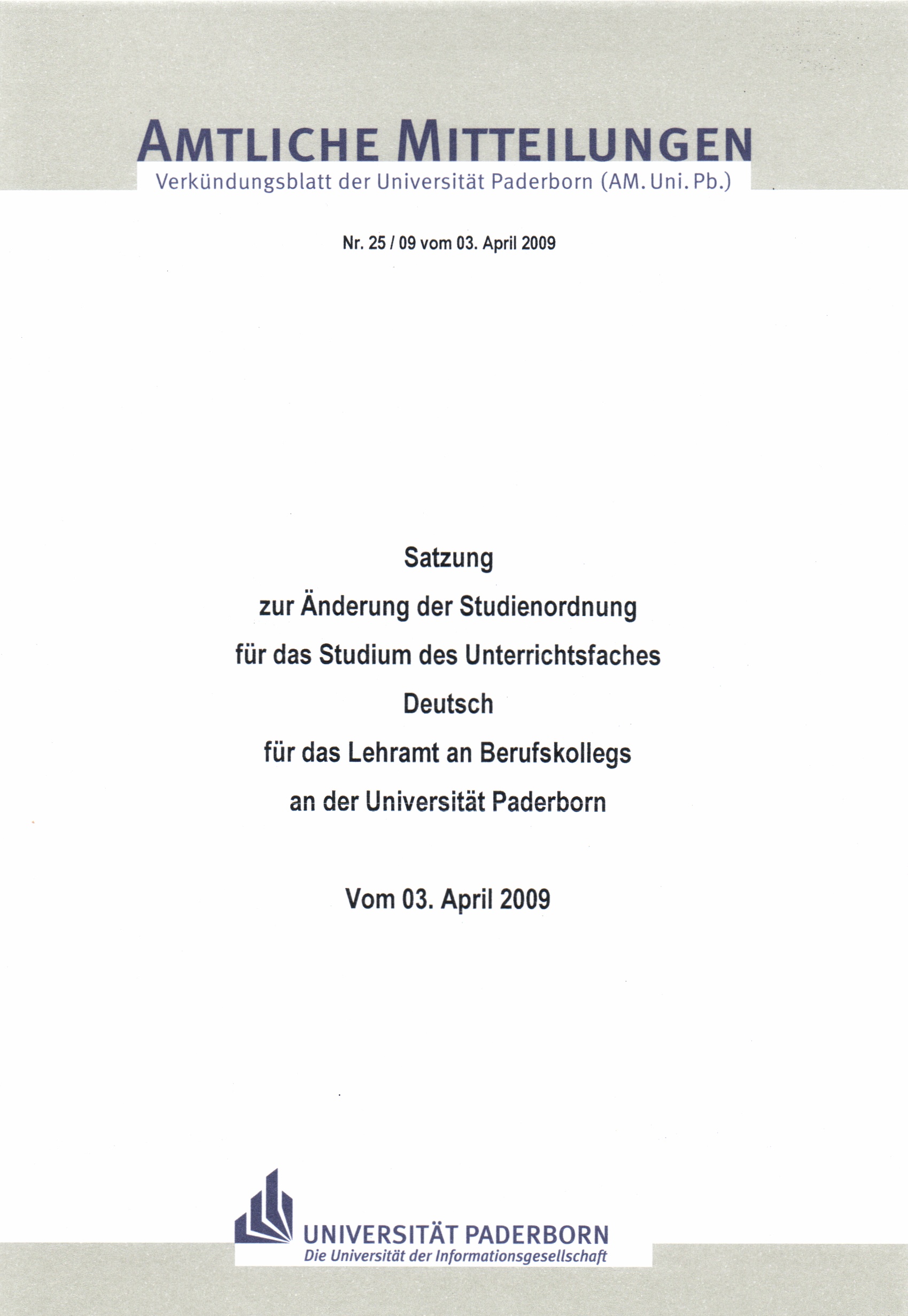 Satzung zur Änderung der Studienordnung für das Studium des Unterrichtsfaches Deutsch für das Lehramt an Berufskollegs an der Universität Paderborn : vom 03. April 2009