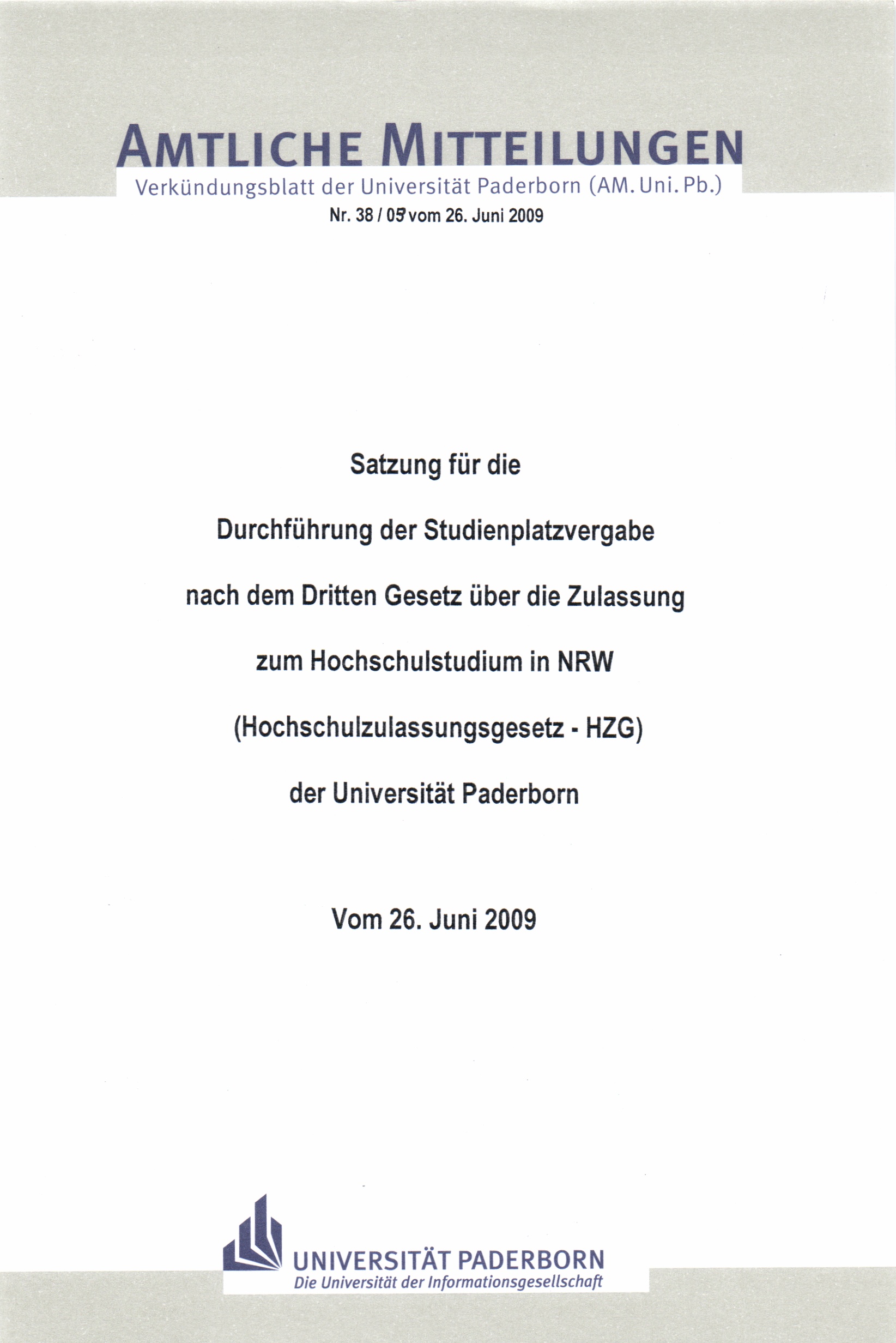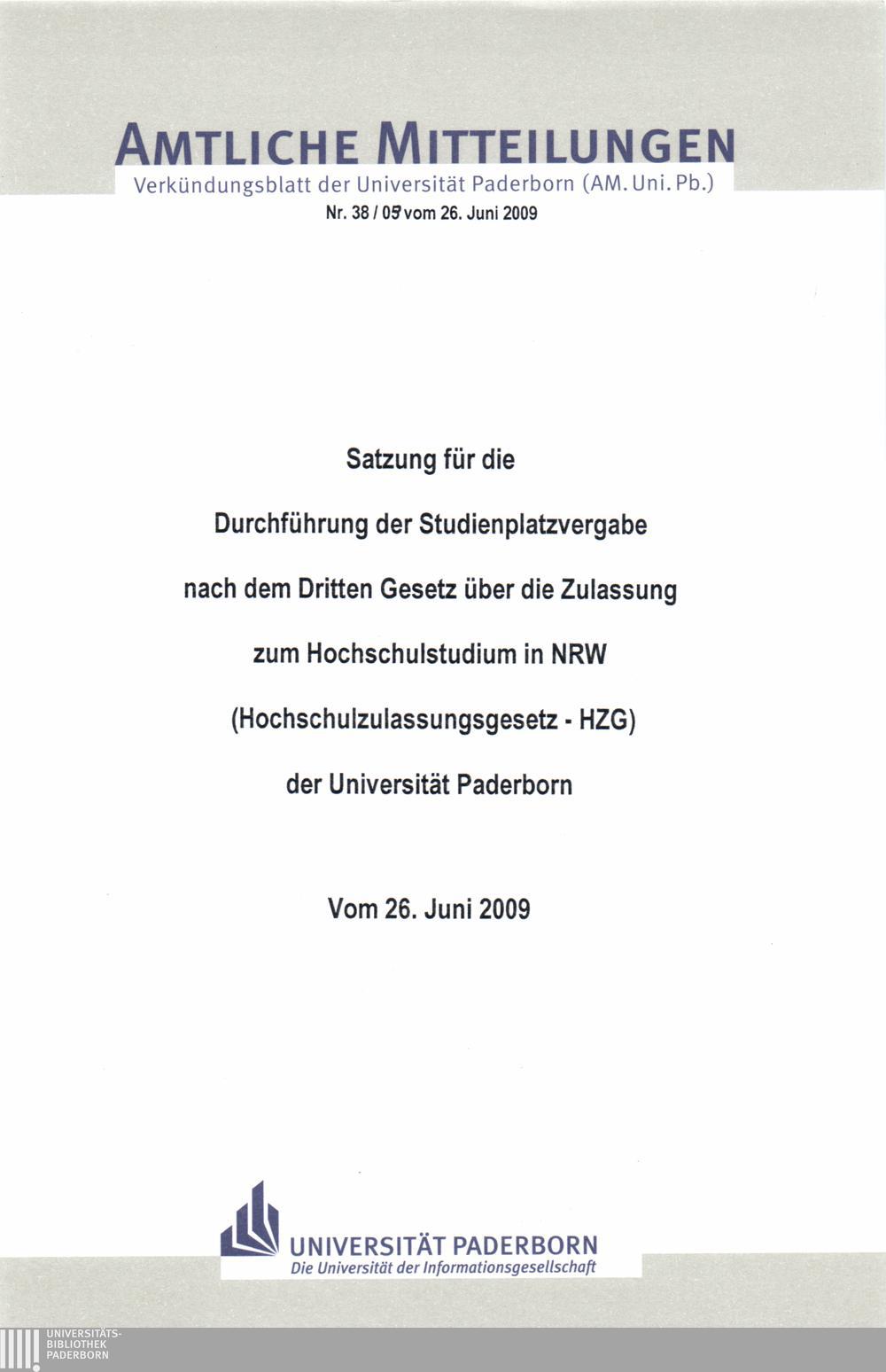 Satzung für die Durchführung der Studienplatzvergabe nach dem Dritten Gesetz über die Zulassung zum Hochschulstudium in NRW (Hochschulzulassungsgesetz - HZG) der Universität Paderborn : vom 26. Juni 2009