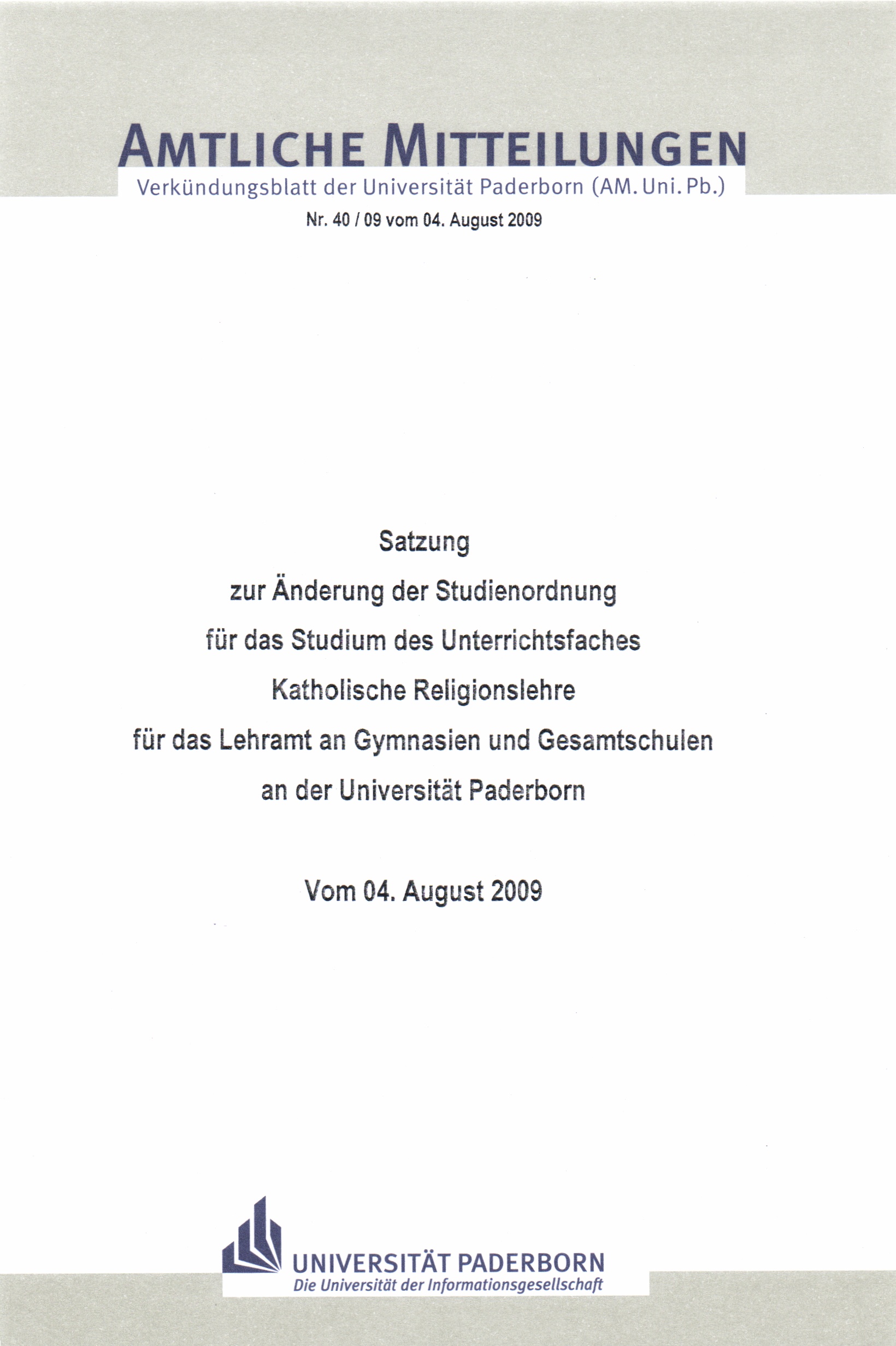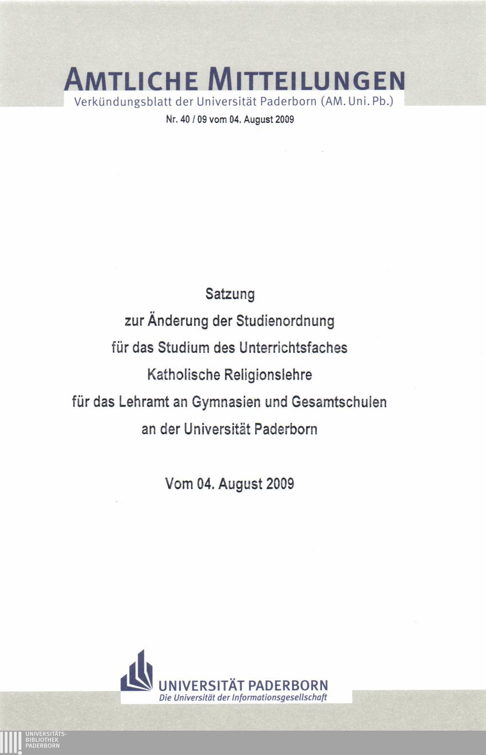 Satzung zur Änderung der Studienordnung für das Studium des Unterrichtsfaches Katholische Religionslehre für das Lehramt an Gymnasien und Gesamtschulen an der Universität Paderborn : vom 04. August 2009