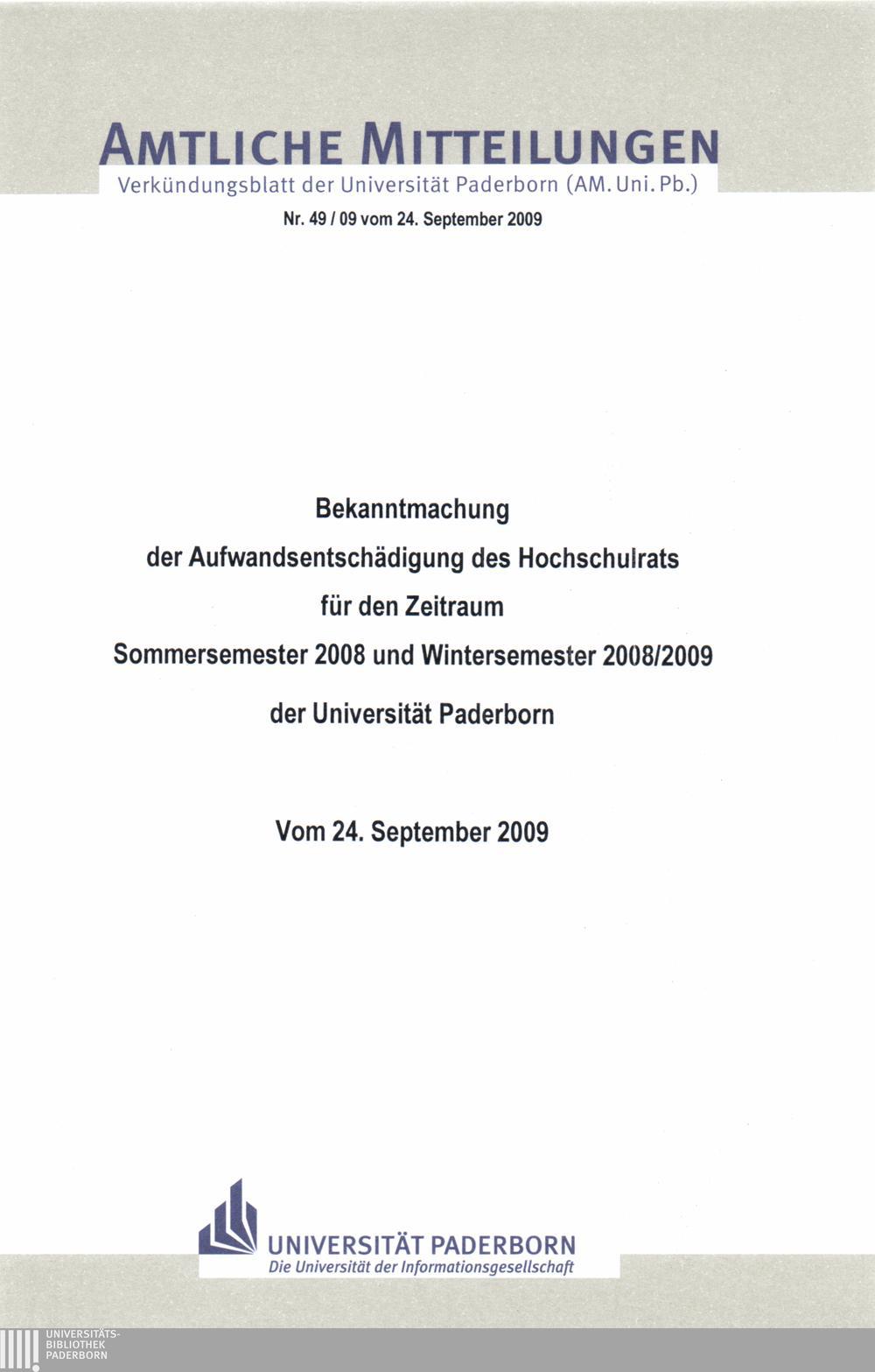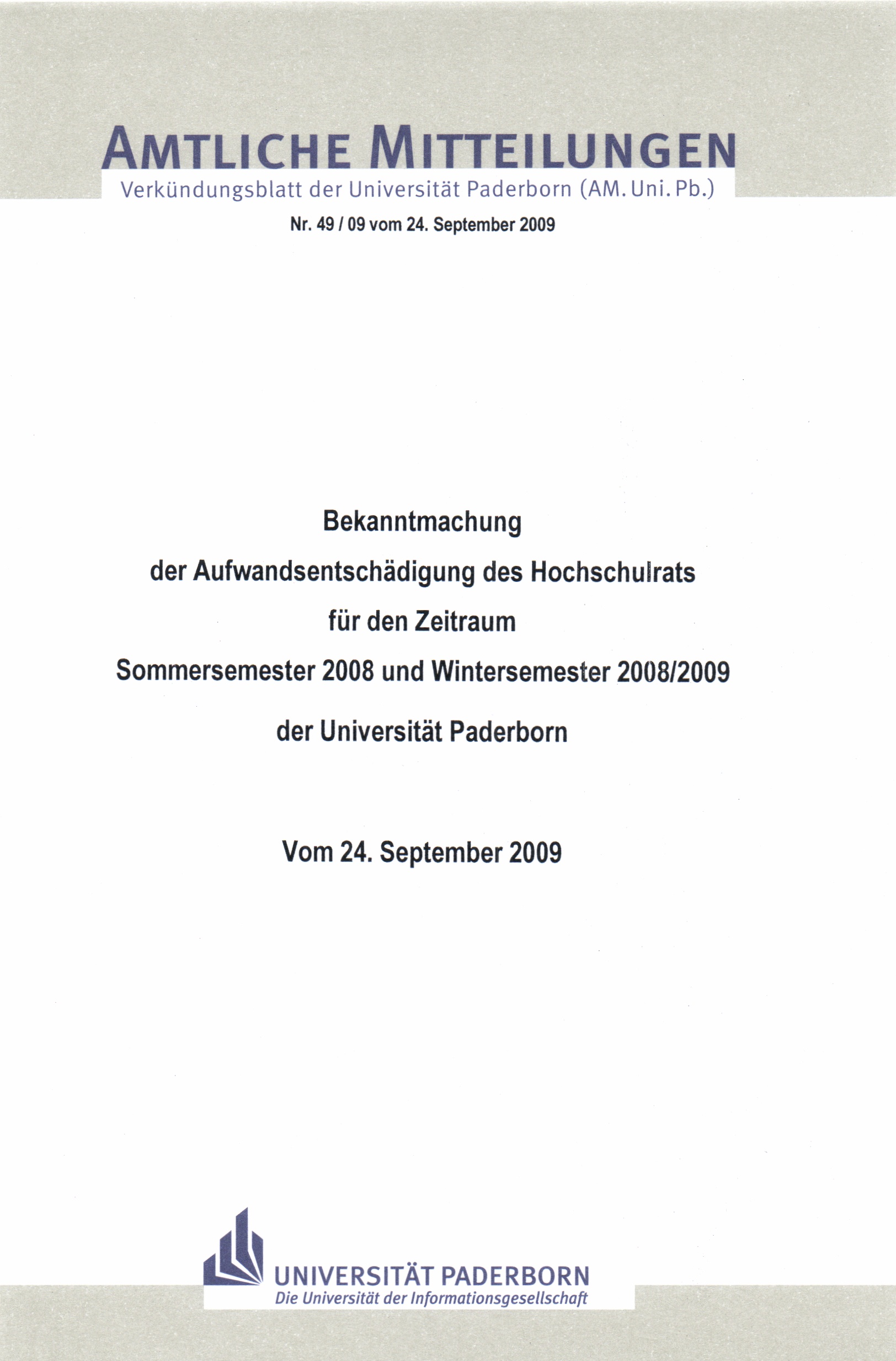 Bekanntmachung der Aufwandsentschädigung des Hochschulrats für den Zeitraum Sommersemester 2008 und Wintersemester 2008/2009 der Universität Paderborn : vom 24. September 2009