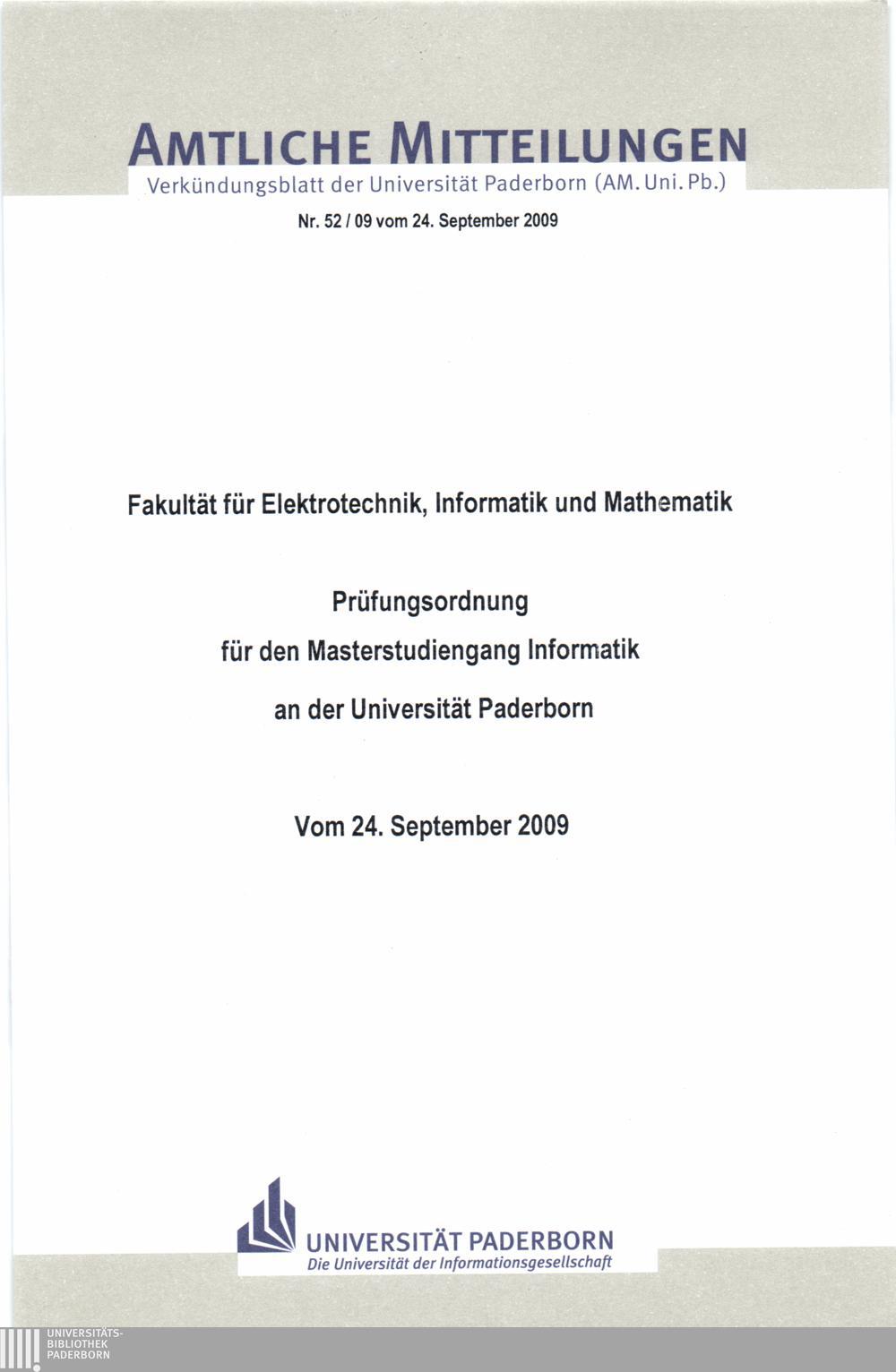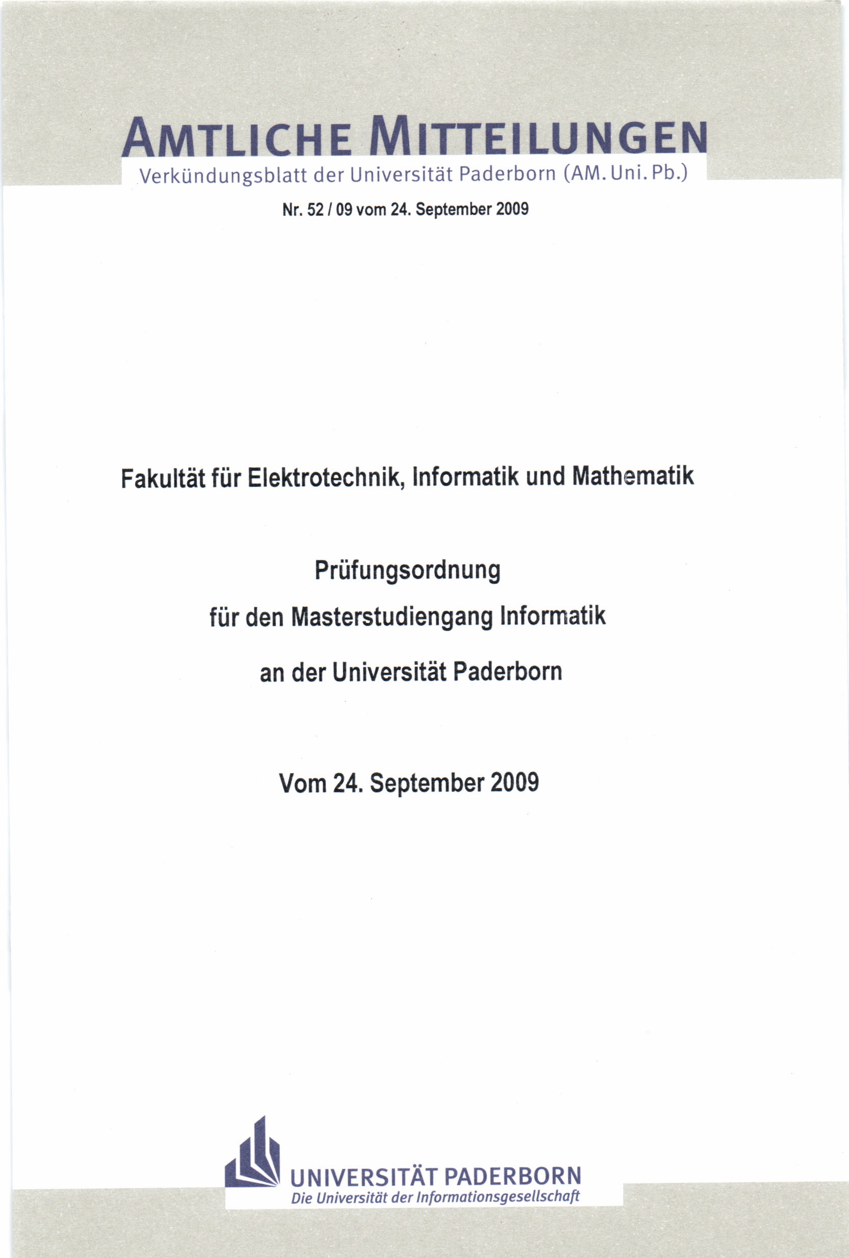 Prüfungsordnung für den Masterstudiengang Informatik an der Universität Paderborn : vom 24. September 2009 / Fakultät für Elektrotechnik, Informatik und Mathematik