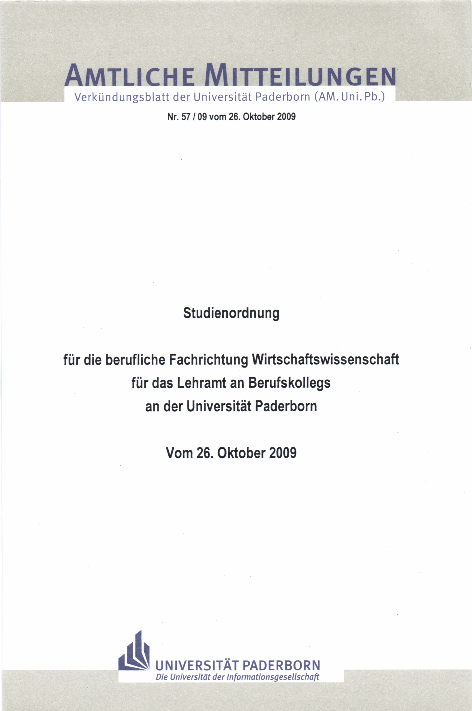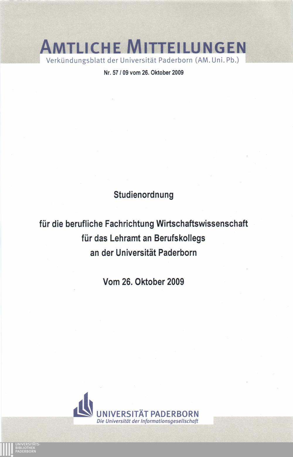 Studienordnung für die berufliche Fachrichtung Wirtschaftswissenschaft für das Lehramt an Berufskollegs an der Universität Paderborn : vom 26. Oktober 2009