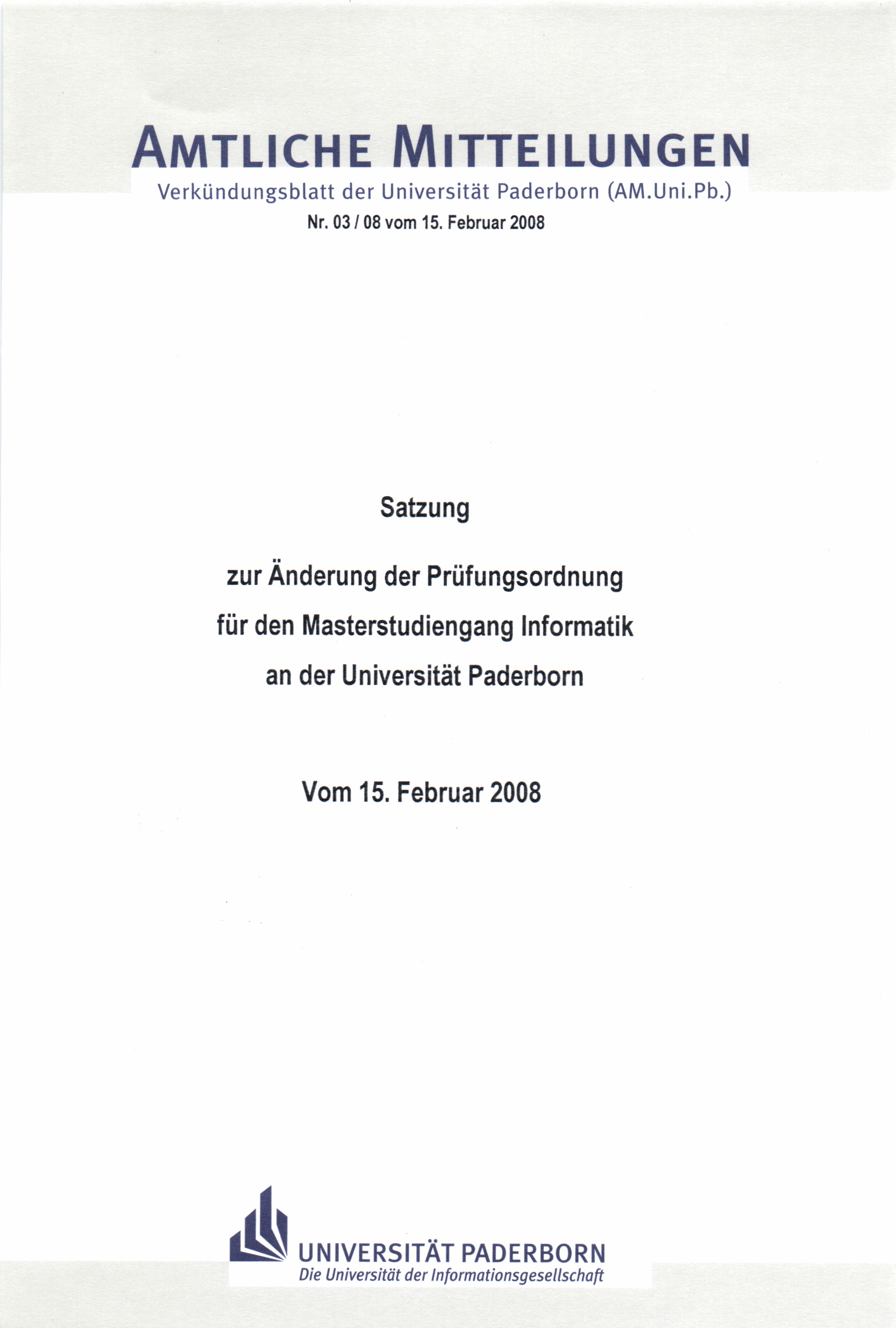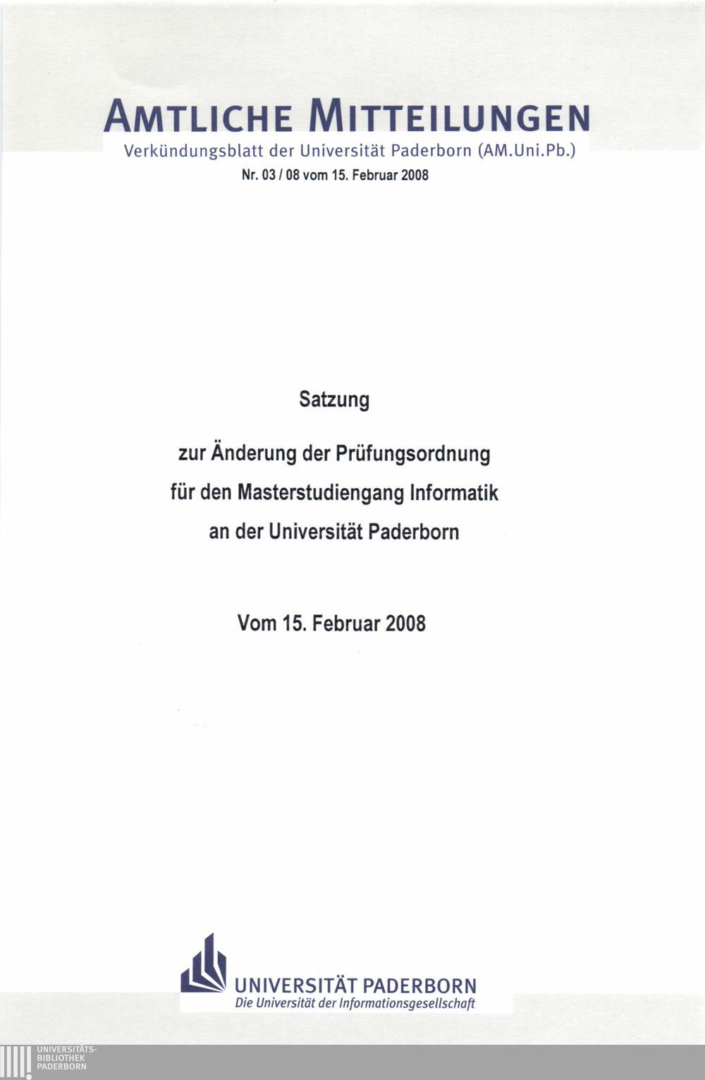 Satzung zur Änderung der Prüfungsordnung für den Masterstudiengang Informatik an der Universität Paderborn : vom 15. Febraur 2008