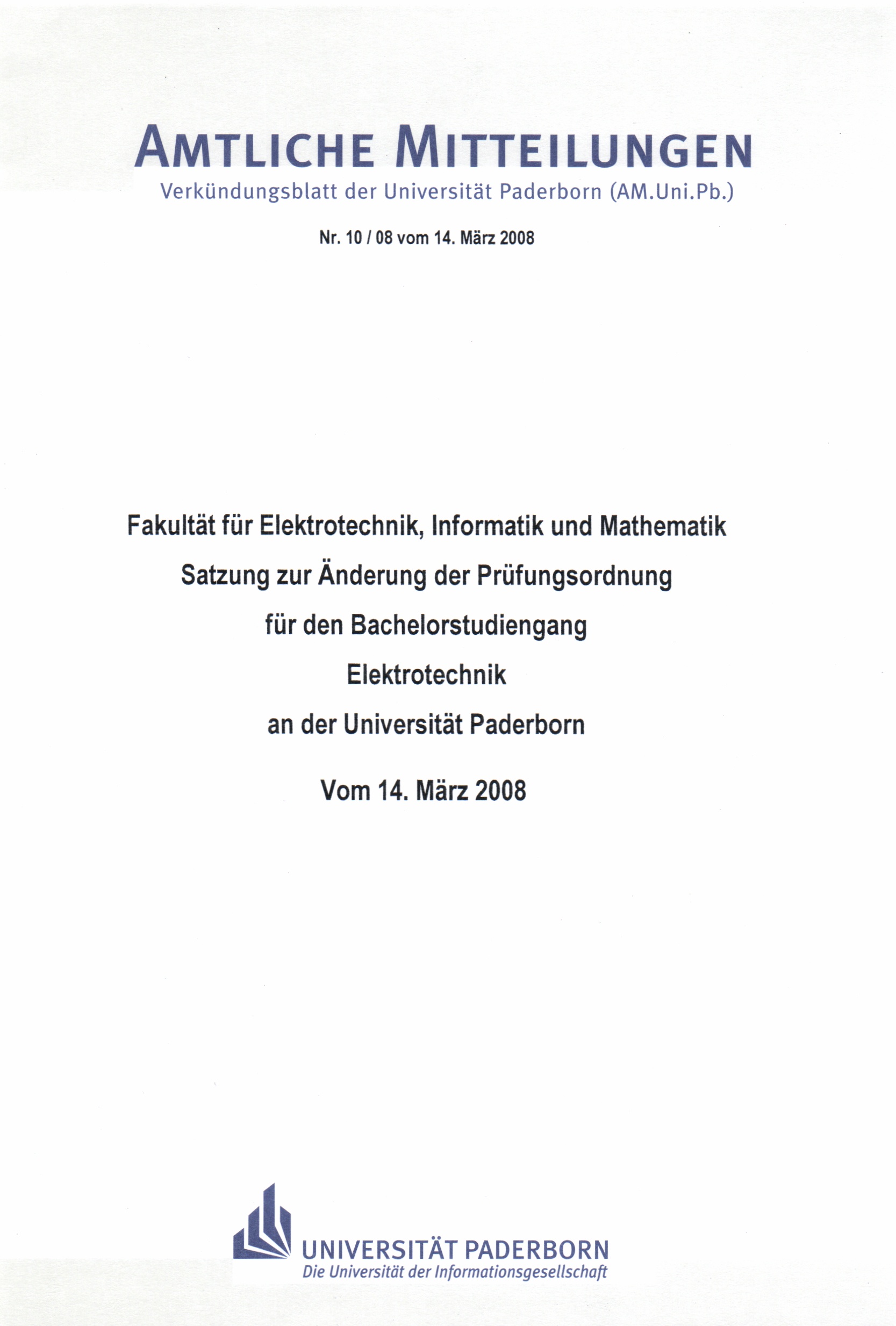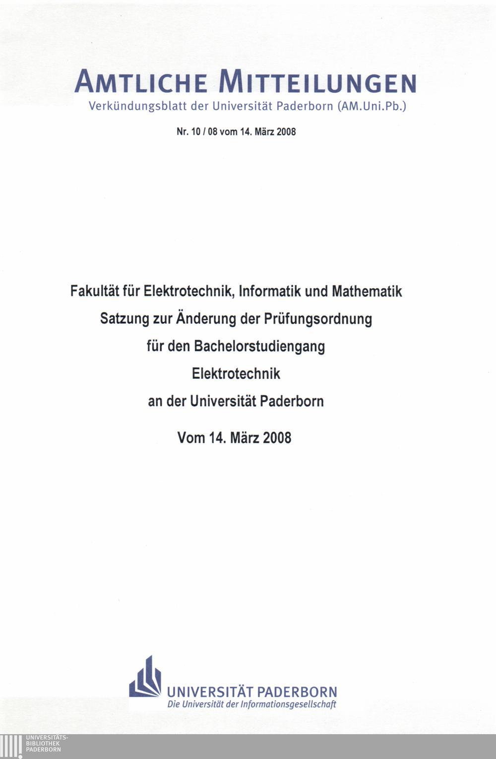 Satzung zur Änderung der Prüfungsordnung für den Bachelorstudiengang Elektrotechnik an der Universität Paderborn : vom 14. März 2008 / Fakultät für Elektrotechnik, Informatik und Mathematik