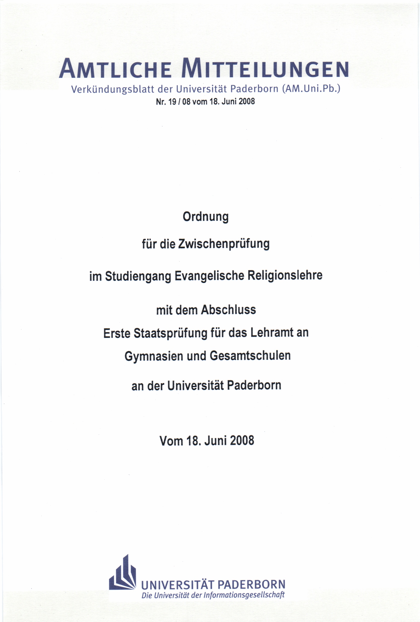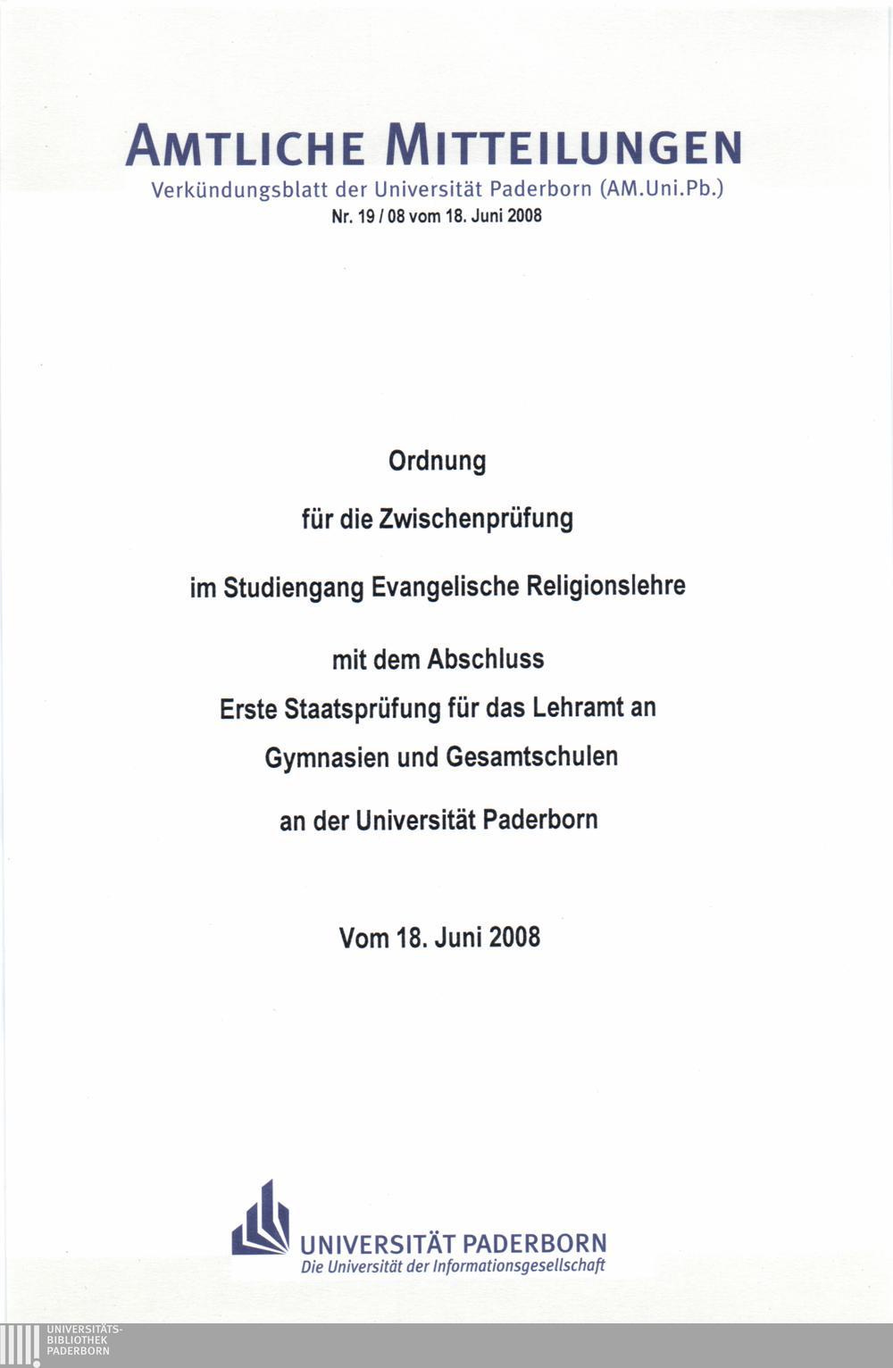Ordnung für die Zwischenprüfung im Studiengang Evangelische Religionslehre mit dem Abschluss Erste Staatsprüfung für das Lehramt an Gymnasien und Gesamtschulen an der Universität Paderborn : vom 18. Juni 2008