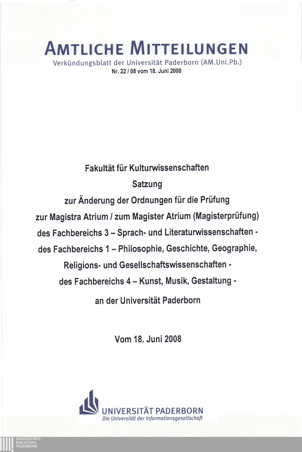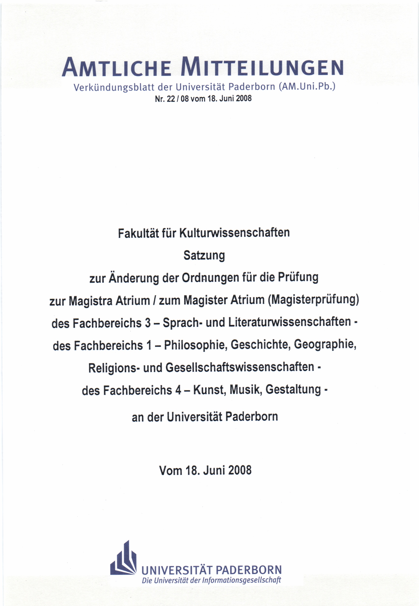 Satzung zur Änderung der Ordnungen für die Prüfung zur Magistra Artium, zum Magister Artium (Magisterprüfung) des Fachbereichs 3 - Sprach- und Literaturwissenschaften -, des Fachbereichs 1 - Philosophie, Geschichte, Geographie, Religions- und Gesellschaftswissenschaften -, des Fachbereichs 4 - Kunst, Musik, Gestaltung - an der Universität Paderborn : vom 18. Juni 2008 / Fakultät für Kulturwissenschaften