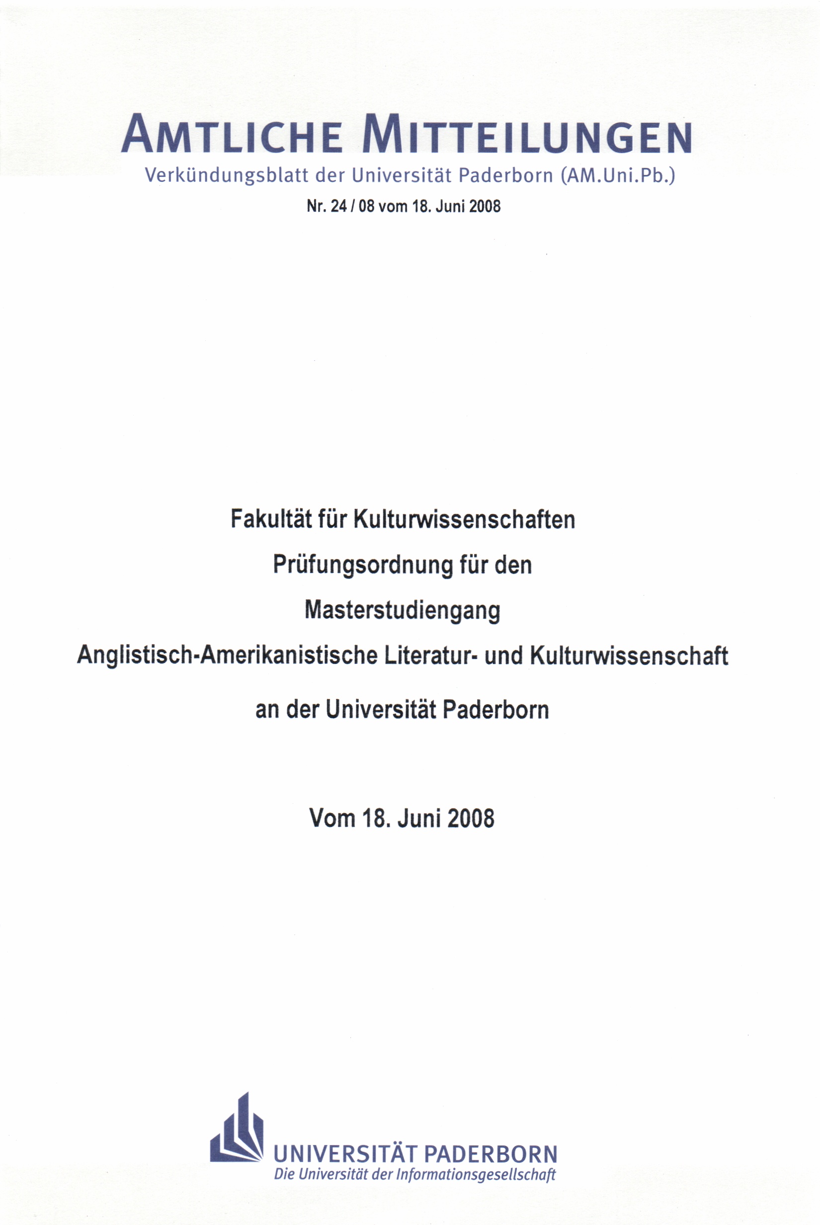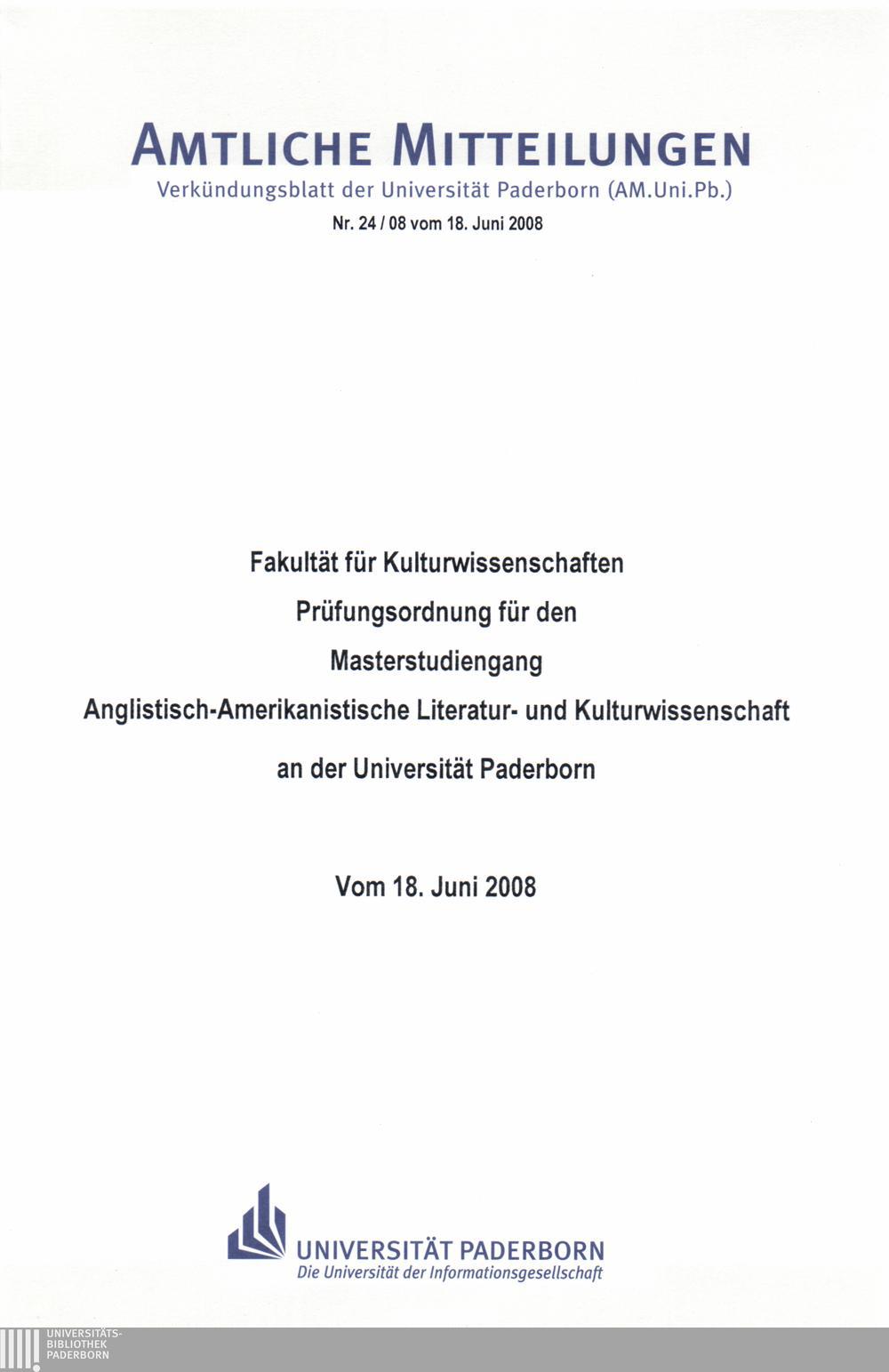 Prüfungsordnung für den Masterstudiengang Anglistisch-Amerikanistische Literatur- und Kulturwissenschaft an der Universität Paderborn : vom 18. Juni 2008 / Fakultät für Kulturwissenschaften