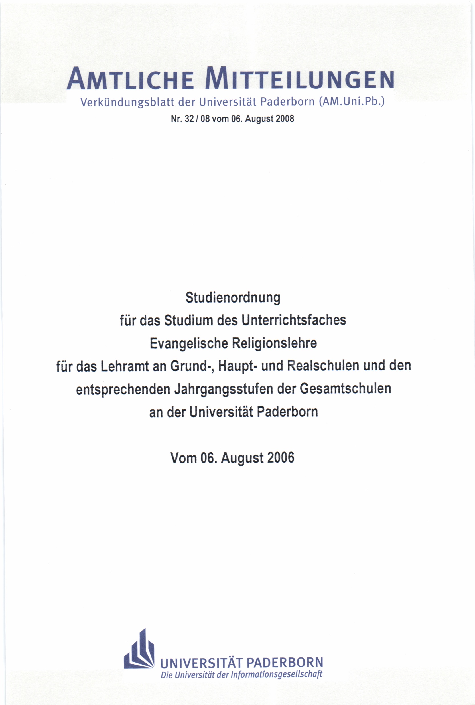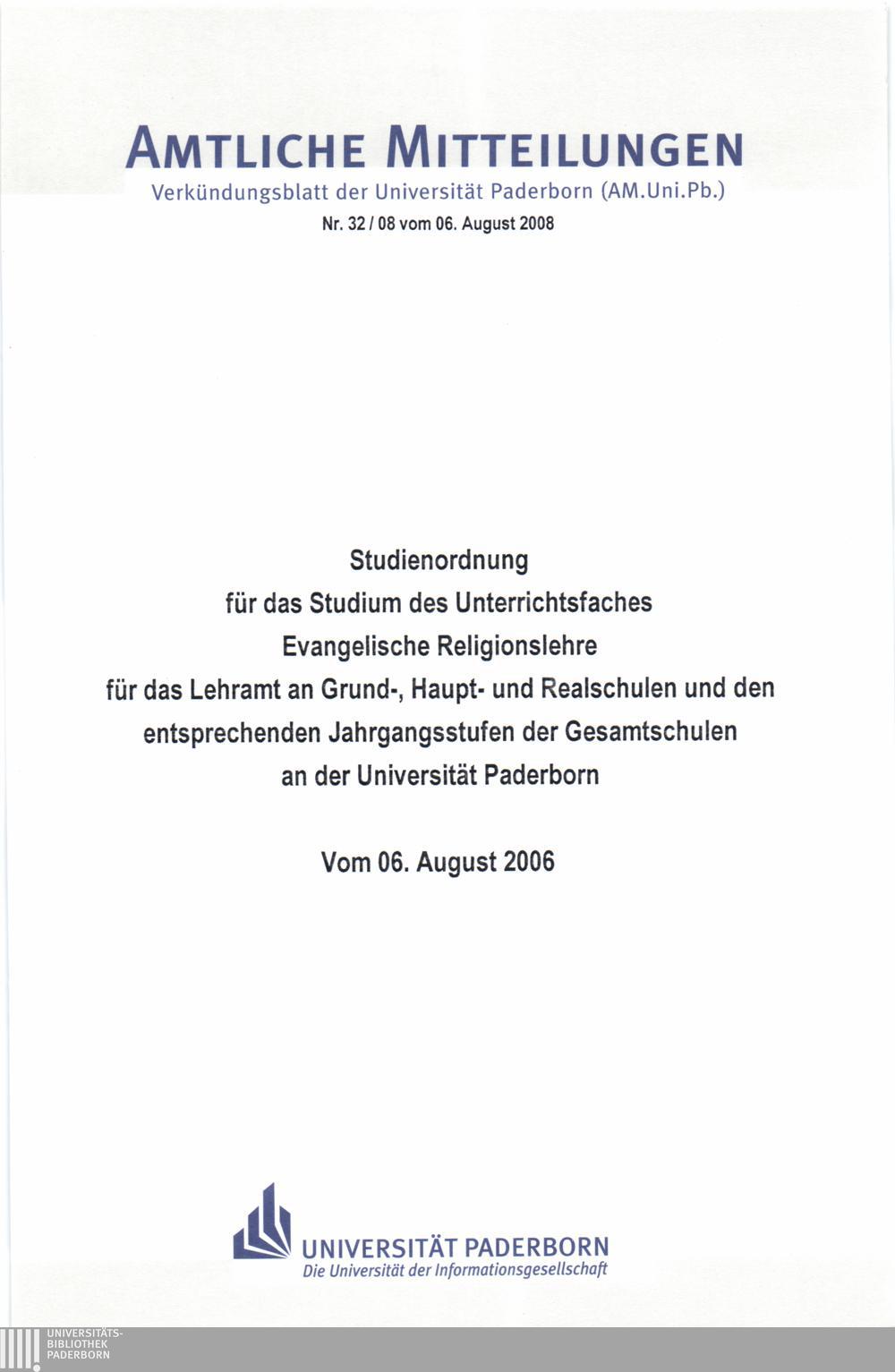 Studienordnung für das Studium des Unterrichtsfaches Evangelische Religionslehre für das Lehramt an Grund-, Haupt- und Realschulen und den entsprechenden Jahrgangsstufen der Gesamtschulen an der Universität Paderborn : vom 06. August 2008