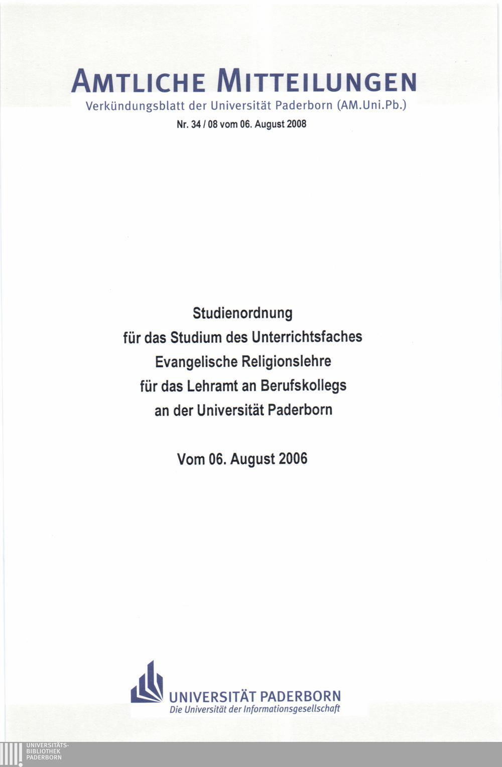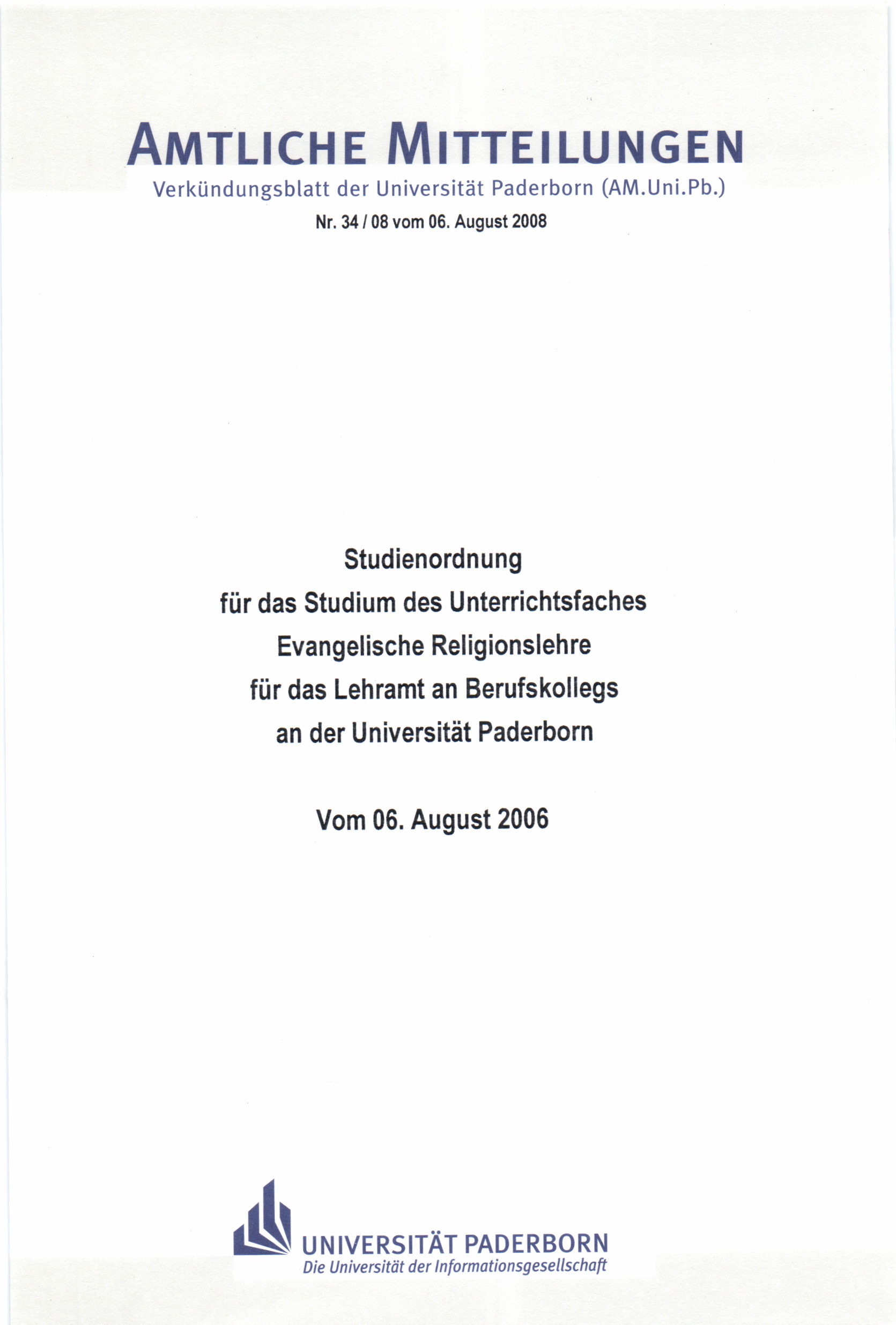 Studienordnung für das Studium des Unterrichtsfaches Evangelische Religionslehre für das Lehramt an Berufskollegs an der Universität Paderborn : vom 06. August 2008