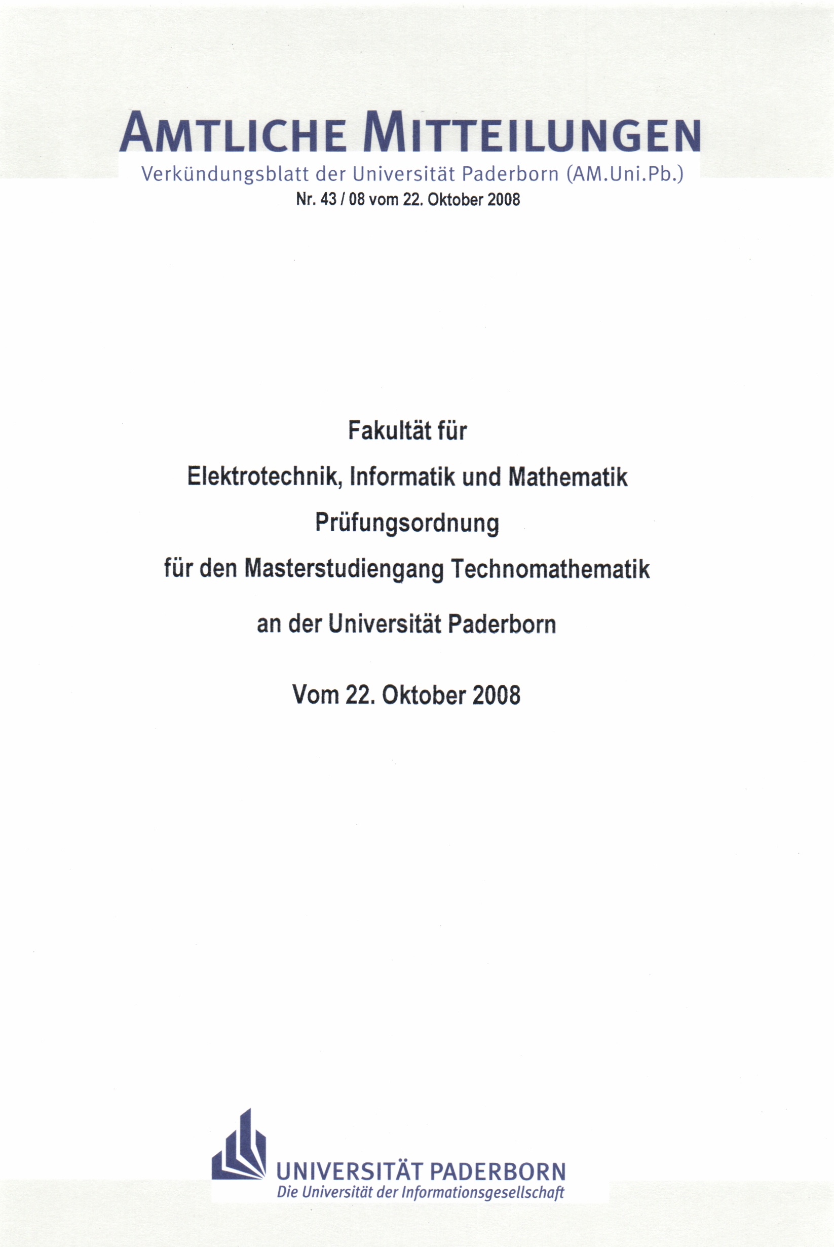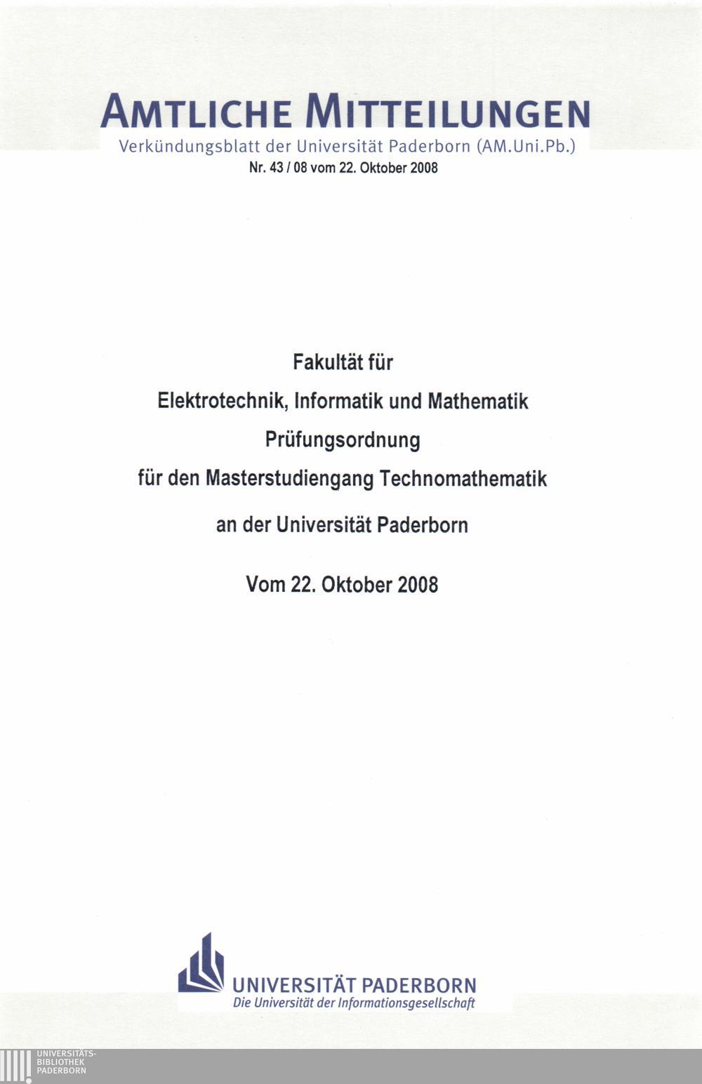 Prüfungsordnung für den Masterstudiengang Technomathematik an der Universität Paderborn : vom 22. Oktober 2008 / Fakultät für Elektrotechnik, Informatik und Mathematik