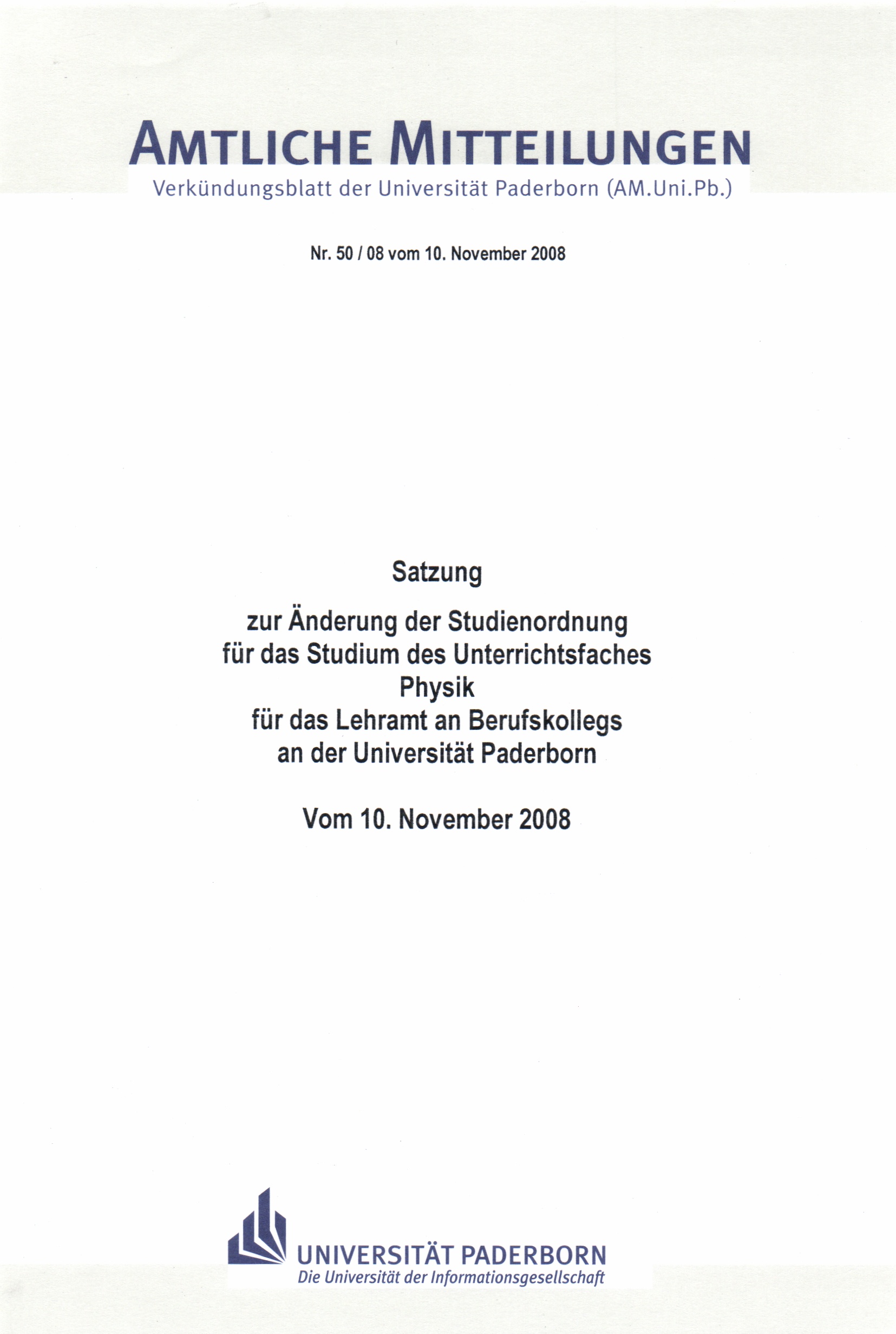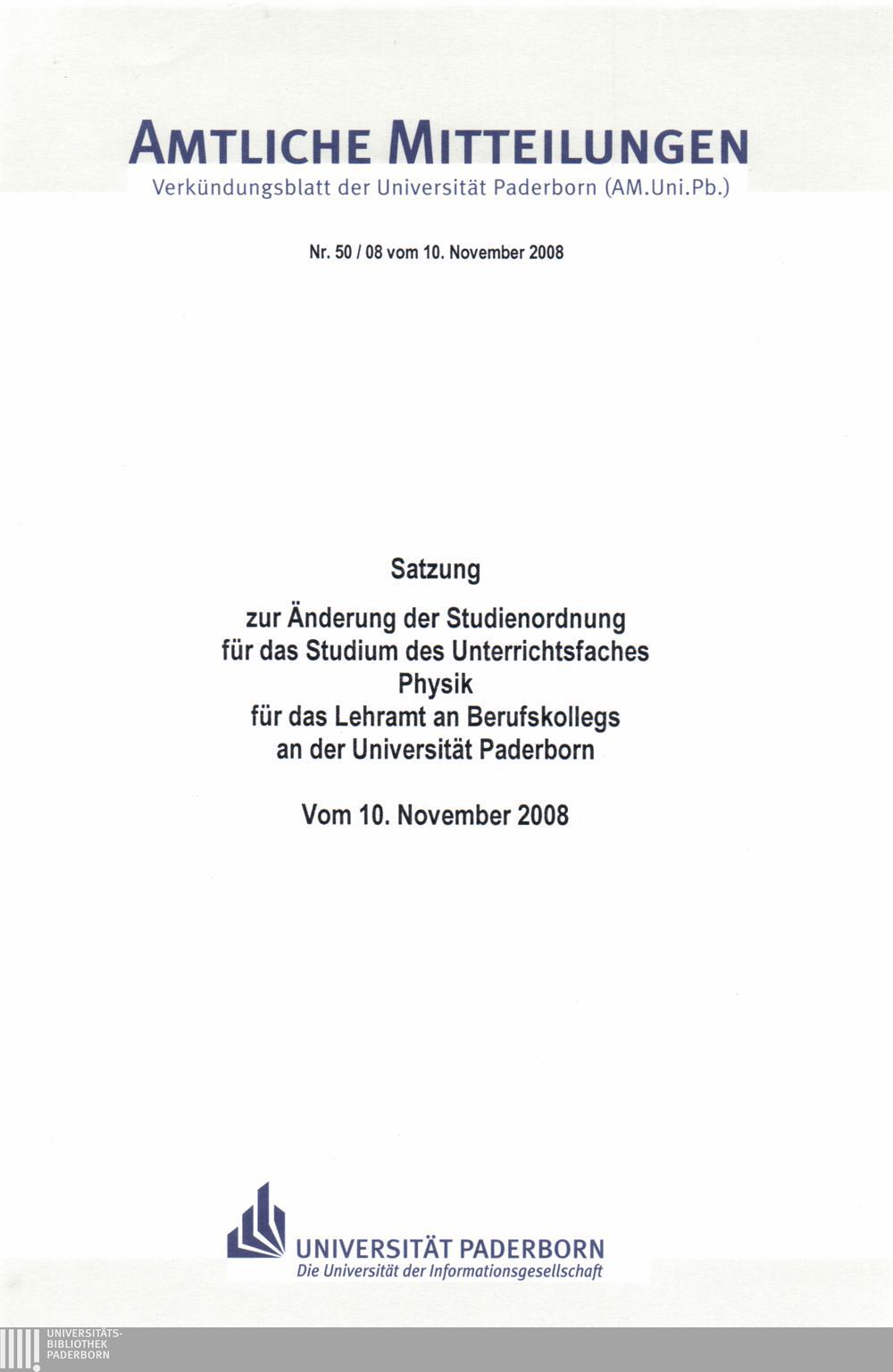 Satzung zur Änderung der Studienordnung für das Studium des Unterrichtsfaches Physik für das Lehramt an Berufskollegs an der Universität Paderborn : vom 10. November 2008