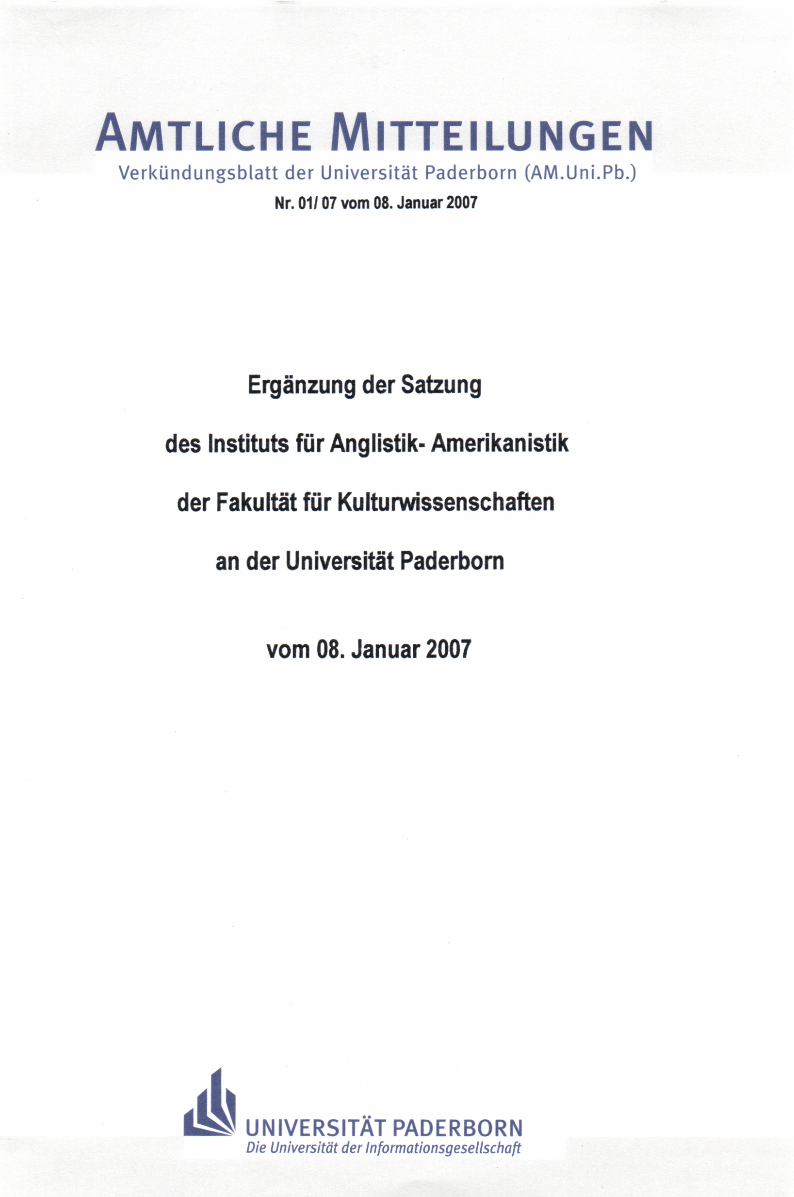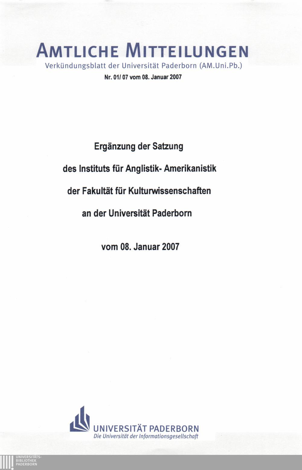 Ergänzung der Satzung des Instituts für Anglistik-Amerikanistik der Fakultät für Kulturwissenschaften an der Universität Paderborn : vom 08. Januar 2007