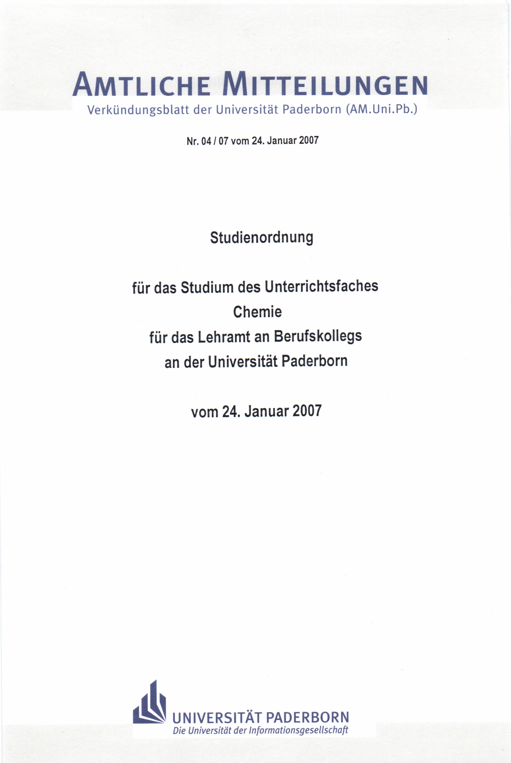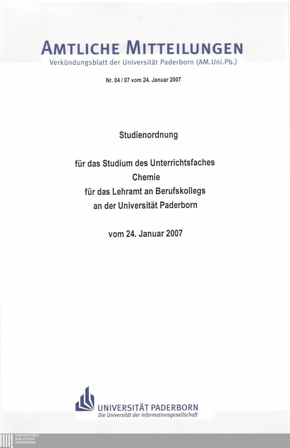 Studienordnung für das Studium des Unterrichtsfaches Chemie für das Lehramt an Berufskollegs an der Universität Paderborn : vom 24. Januar 2007