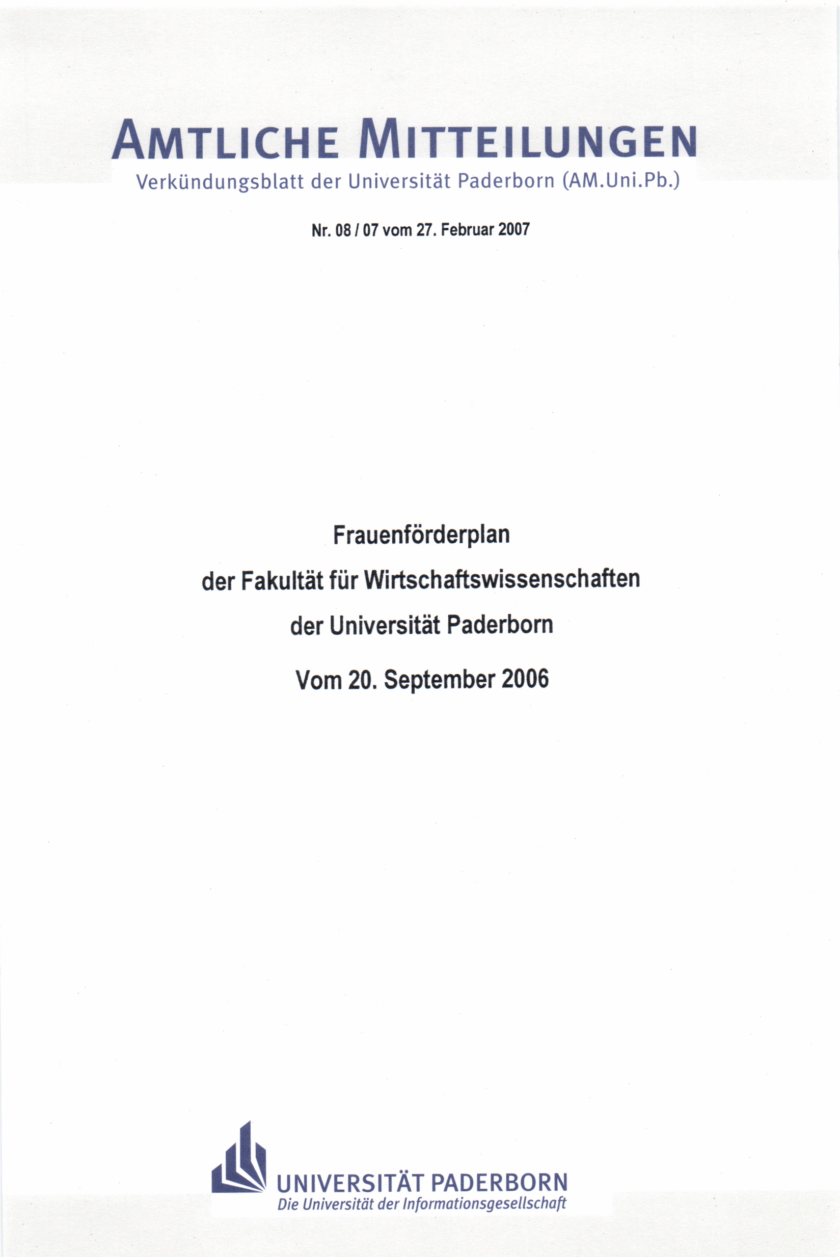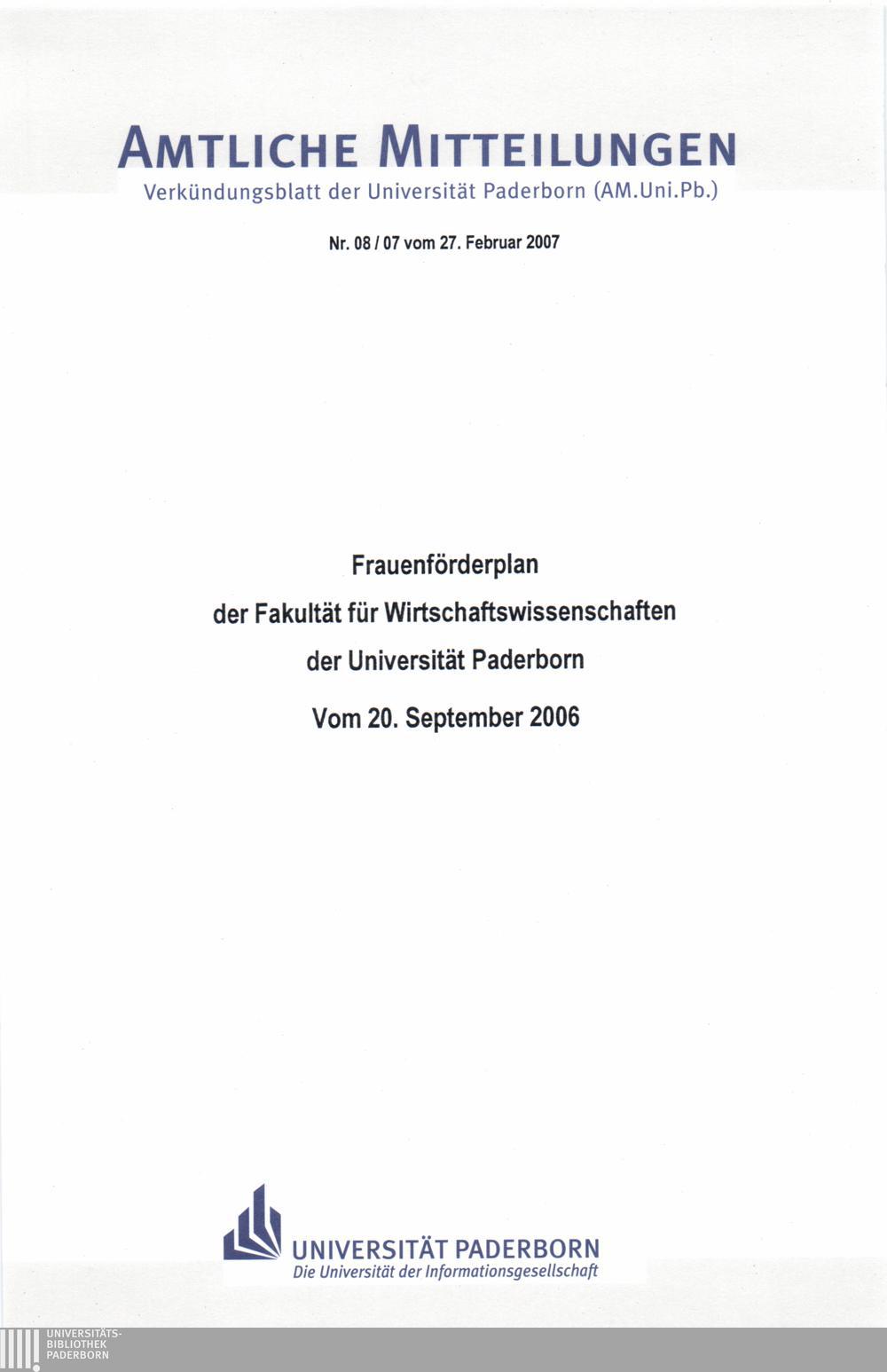 Frauenförderplan der Fakultät für Wirtschaftswissenschaften der Universität Paderborn : vom 20. September 2006