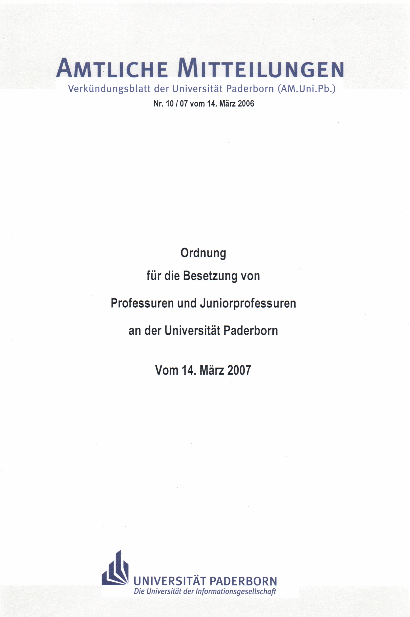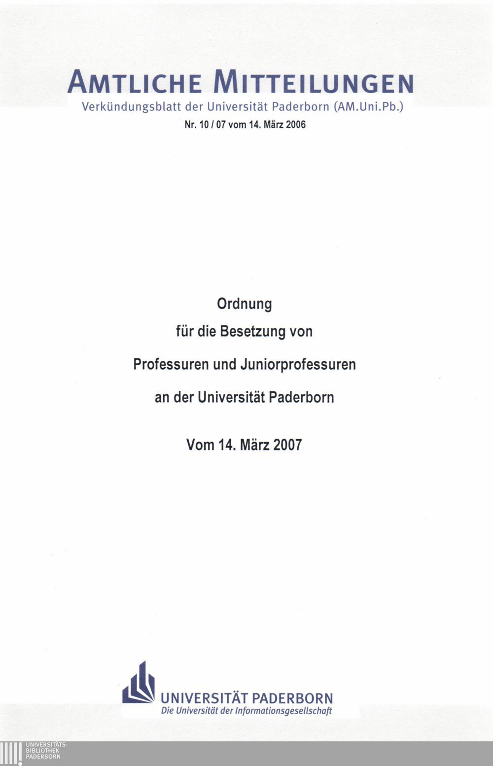 Ordnung für die Besetzung von Professuren und Juniorprofessuren an der Universität Paderborn : vom 14. März 2007