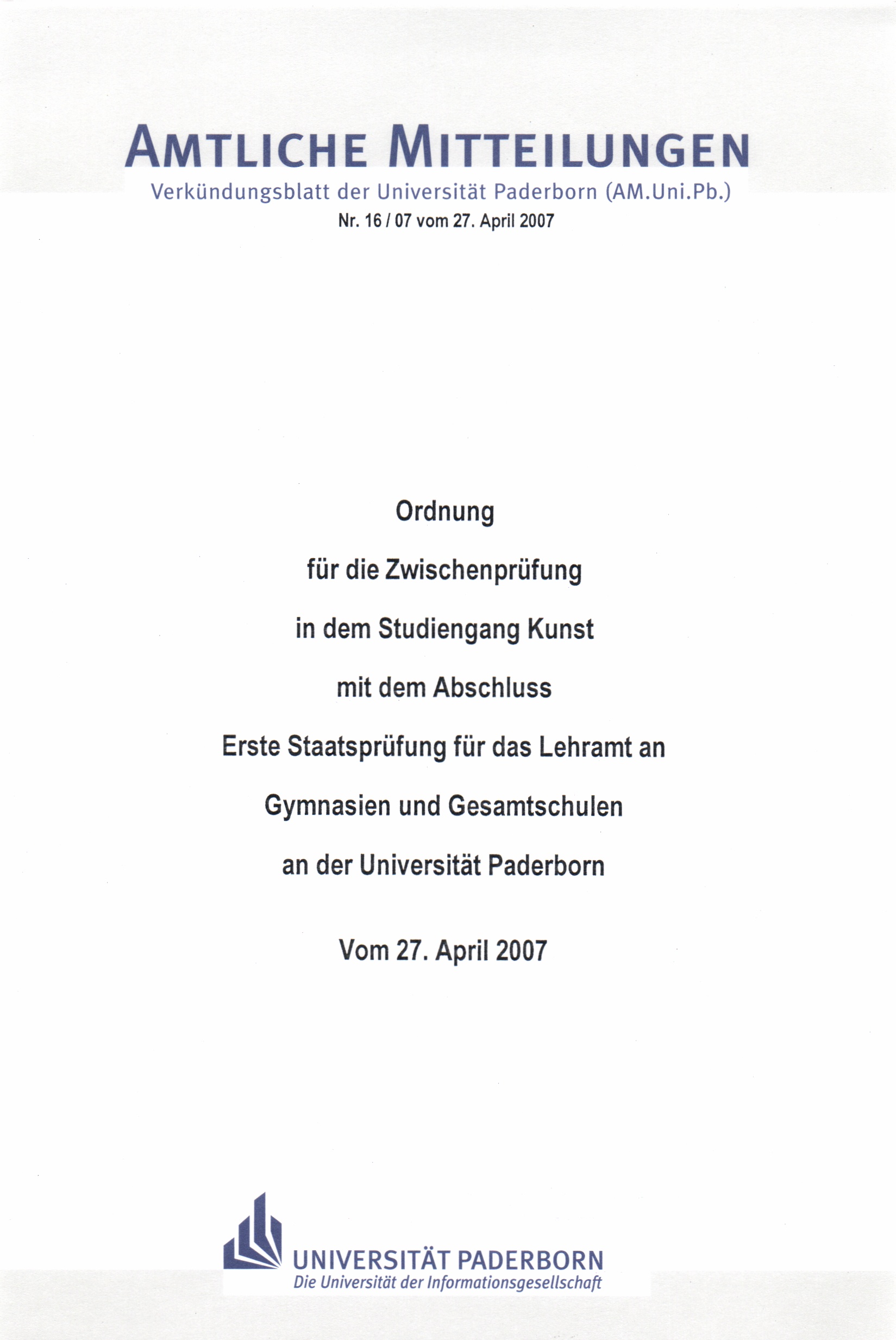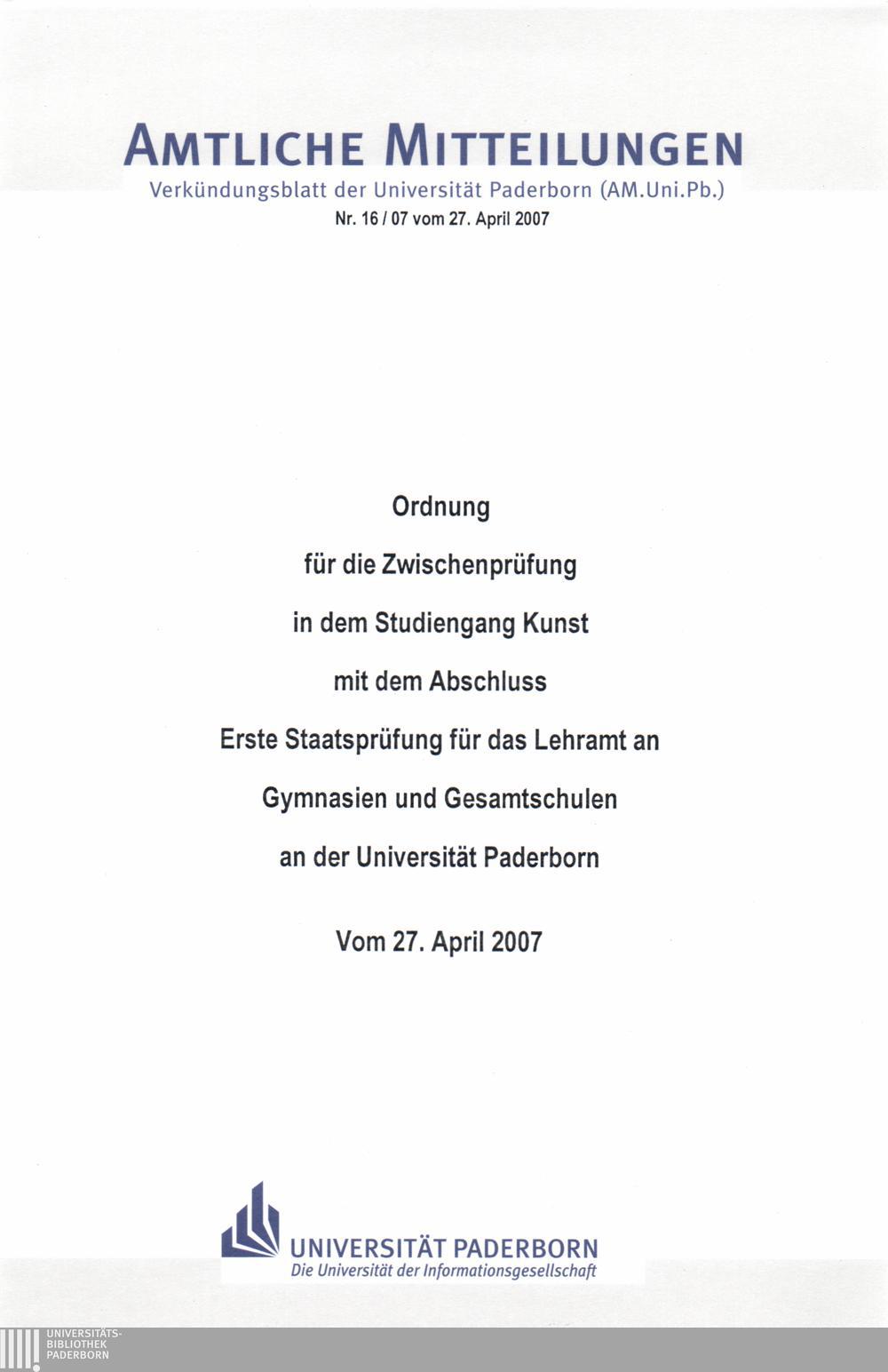 Ordnung für die Zwischenprüfung in dem Studiengang Kunst mit dem Abschluss Erste Staatsprüfung für das Lehramt an Gymnasien und Gesamtschulen an der Universität Paderborn : vom 27. April 2007