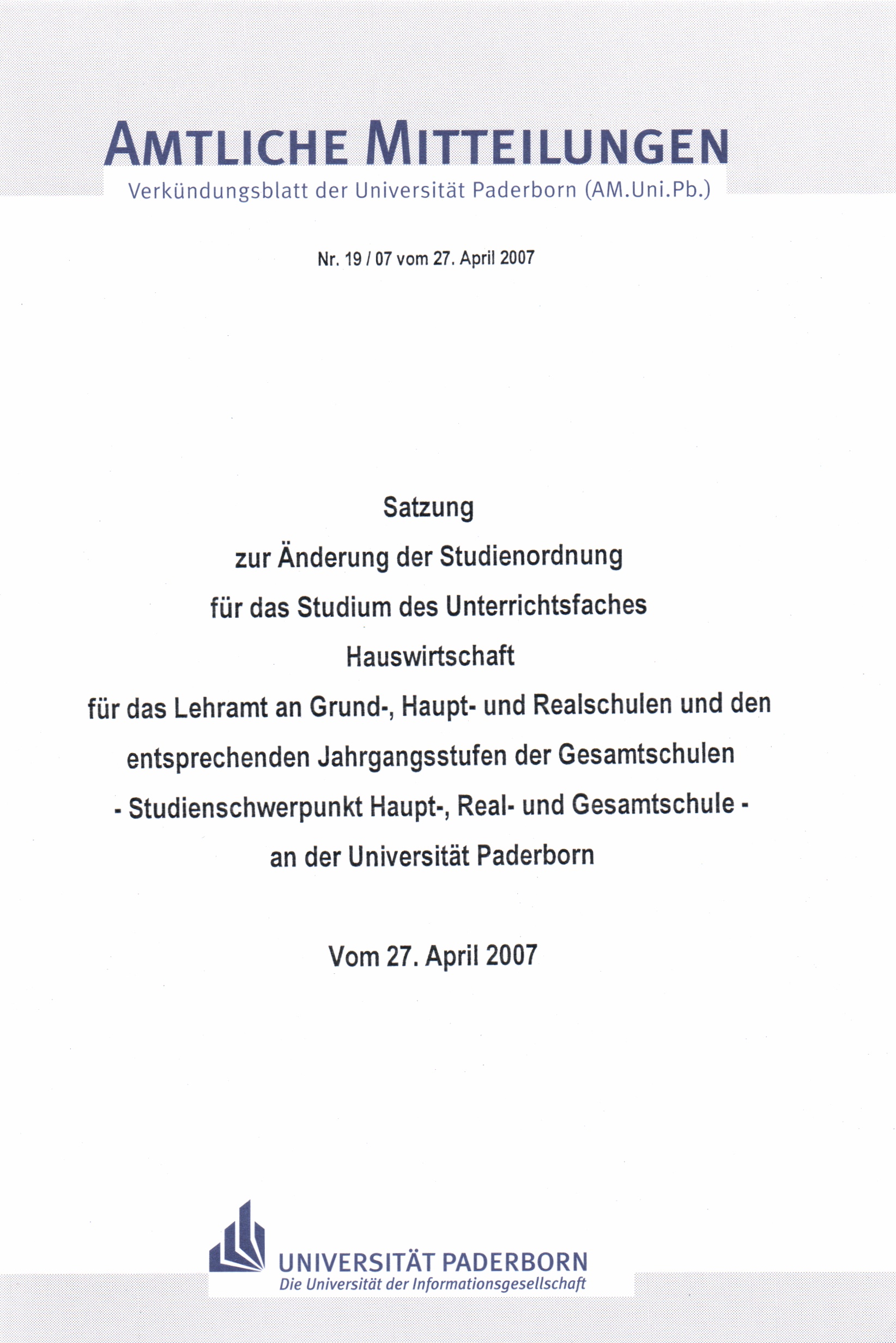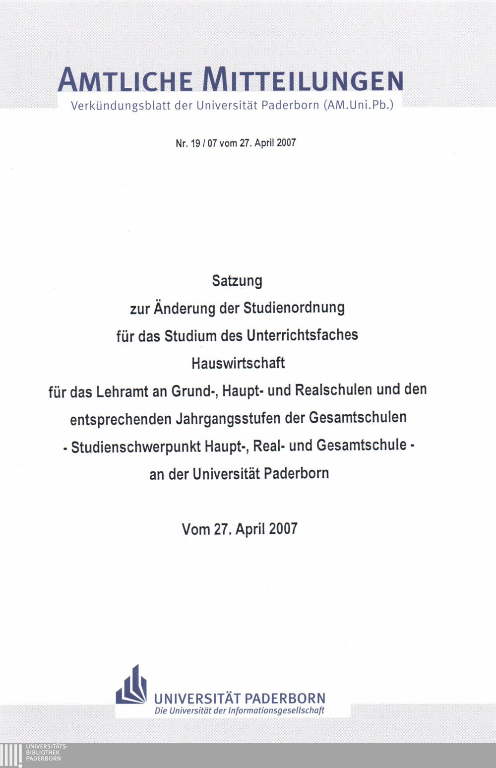 Satzung zur Änderung der Studienordnung für das Studium des Unterrichtsfaches Hauswirtschaft für das Lehramt an Grund-, Haupt- und Realschulen und den entsprechenden Jahrgangsstufen der Gesamtschulen, Studienschwerpunkt Haupt, Real- und Gesamtschule, an der Universität Paderborn : vom 27. April 2007