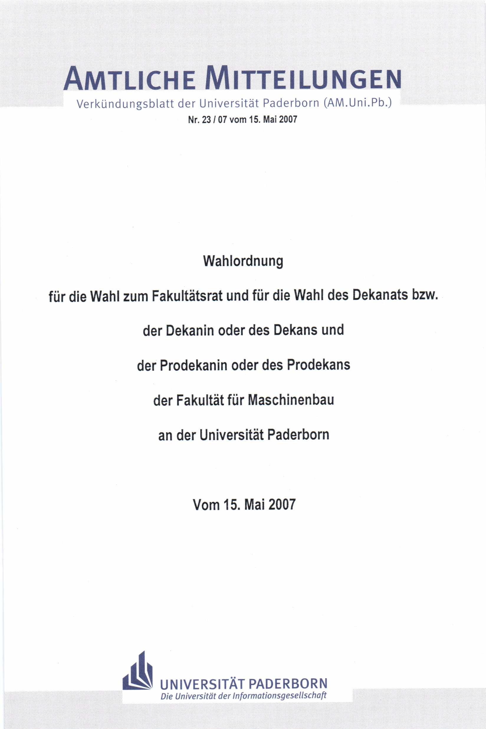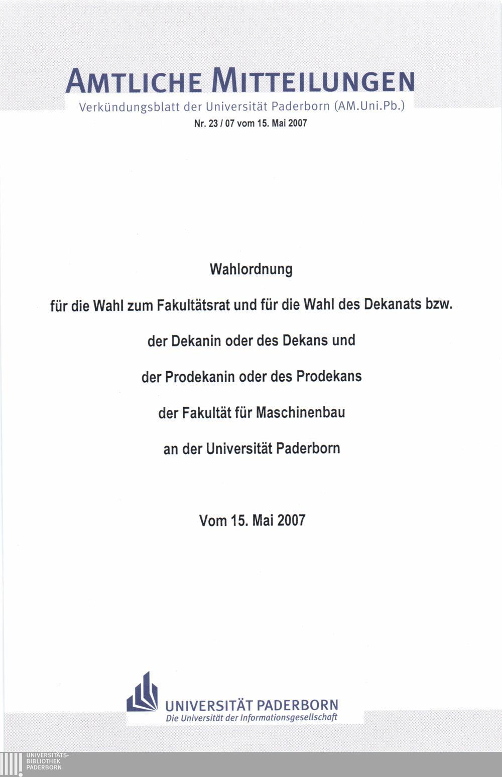 Wahlordnung für die Wahl zum Fakultätsrat und für die Wahl des Dekanats bzw. der Dekanin oder des Dekans und der Prodekanin oder des Prodekans der Fakultät für Maschinenbau an der Universität Paderborn : vom 15. Mai 2007